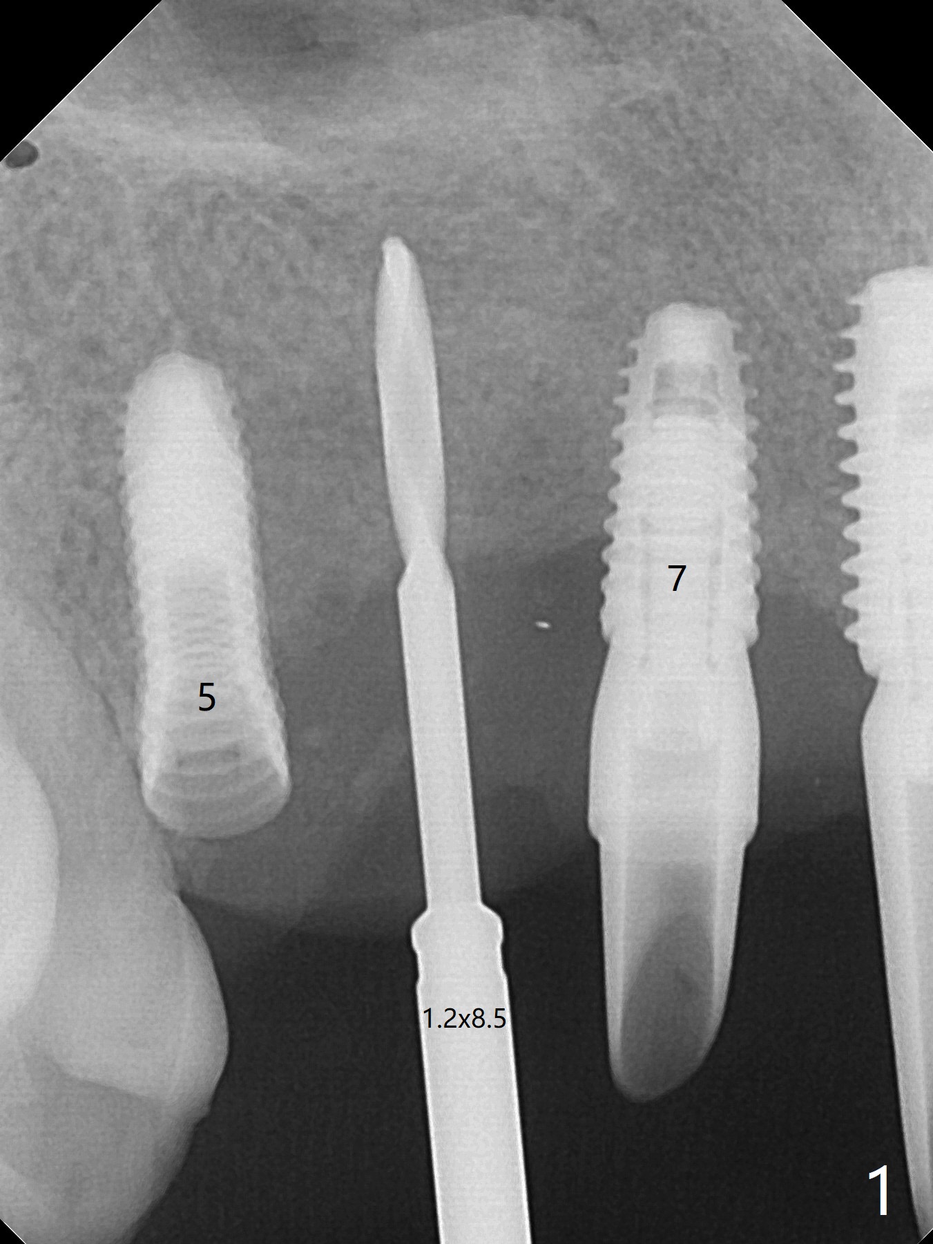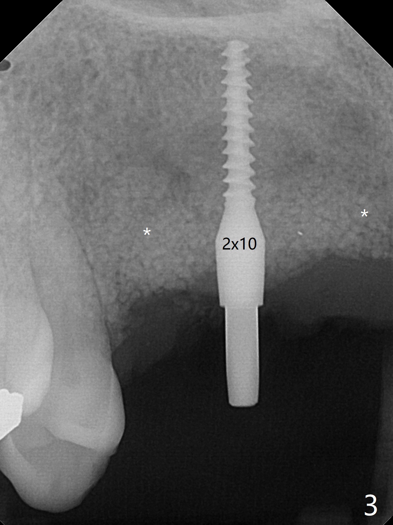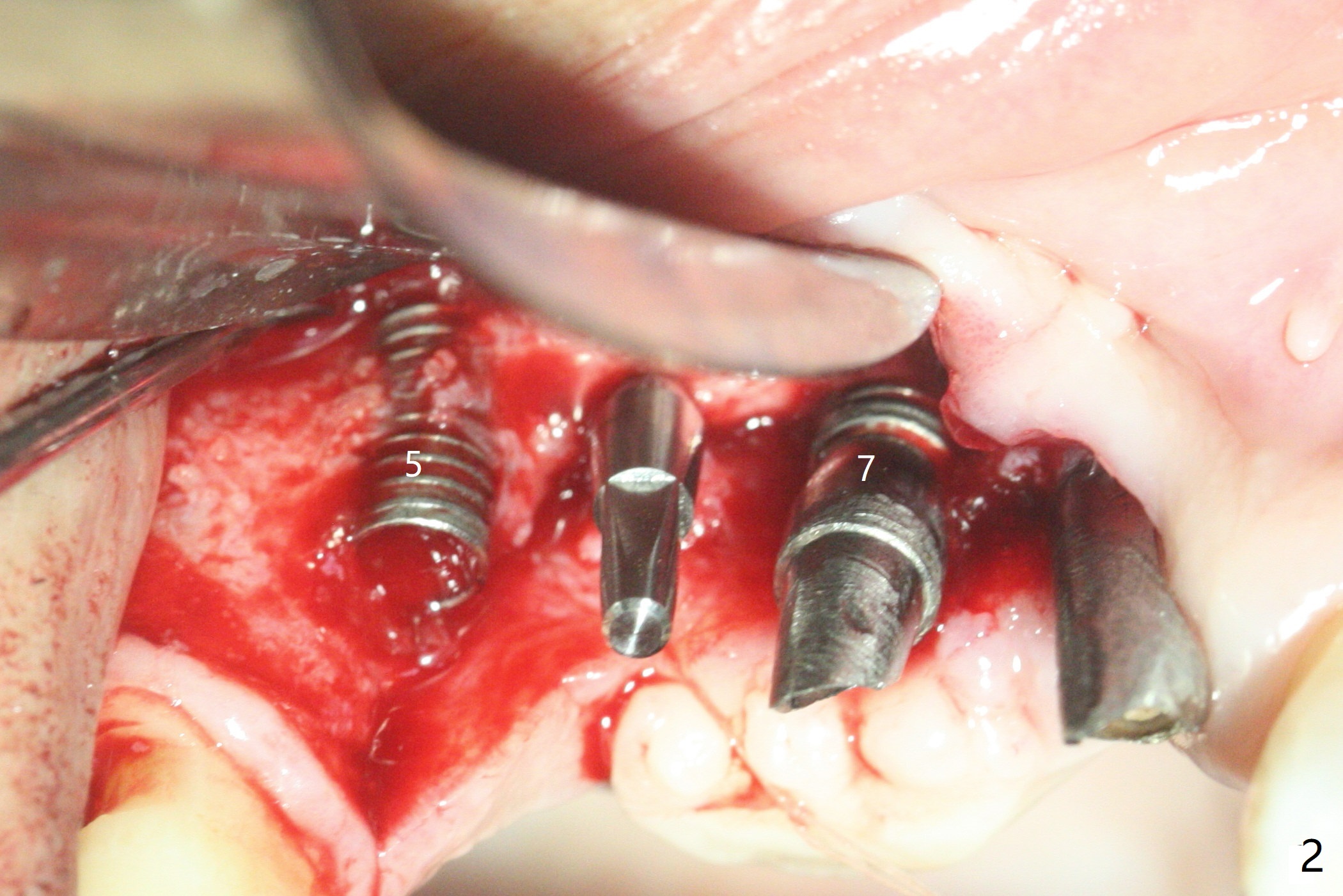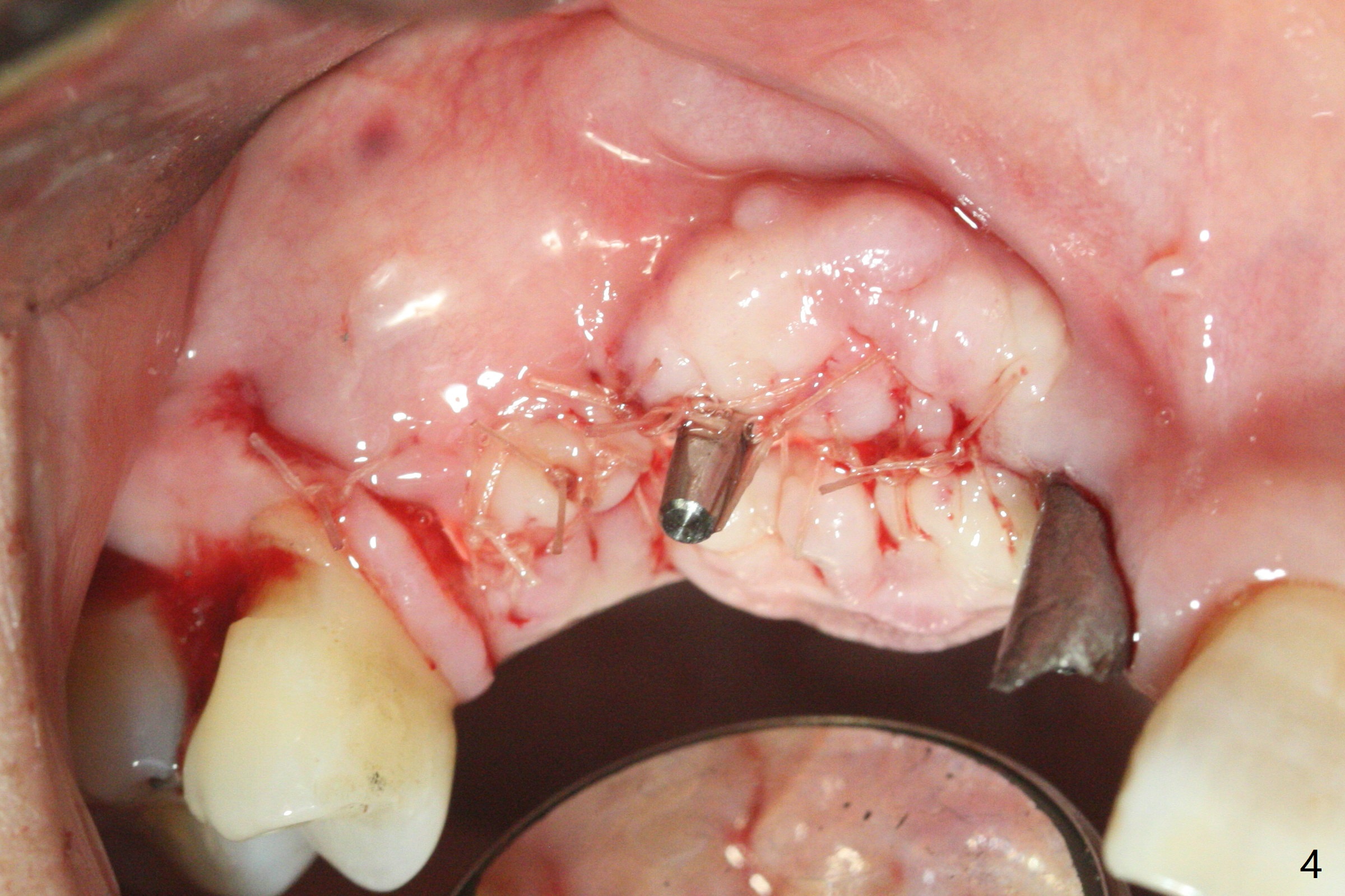 5,7号牙两段式植体种植后螺纹暴露,植骨后4-5个月,准备5号牙uncover,病人主诉7号牙出血,切开后发现两个植体螺纹仍旧暴露(图一,二),看样子保留不住,而6号牙位牙槽嵴不宽,准备植入2x8.5毫米一段式植体,结果骨质高度允许植入10毫米植体(图二,三),然后使用外科钻头和环形刀(trephine bur)取出两段式植体,填入粘性骨粉(图三:*),覆盖PRF和不可吸收膜,4-0 PGA缝合(图四),最后牙周敷料。5,7牙位愈合也可以植入一段式植体,让植体之间距离大些,植骨后颊侧腭侧宽度也可能不足。