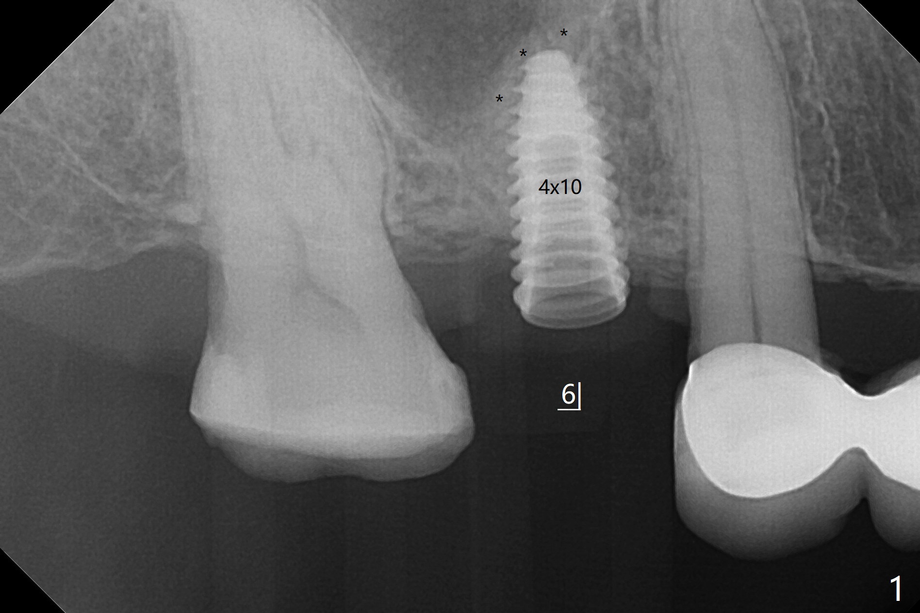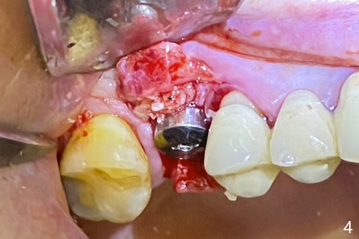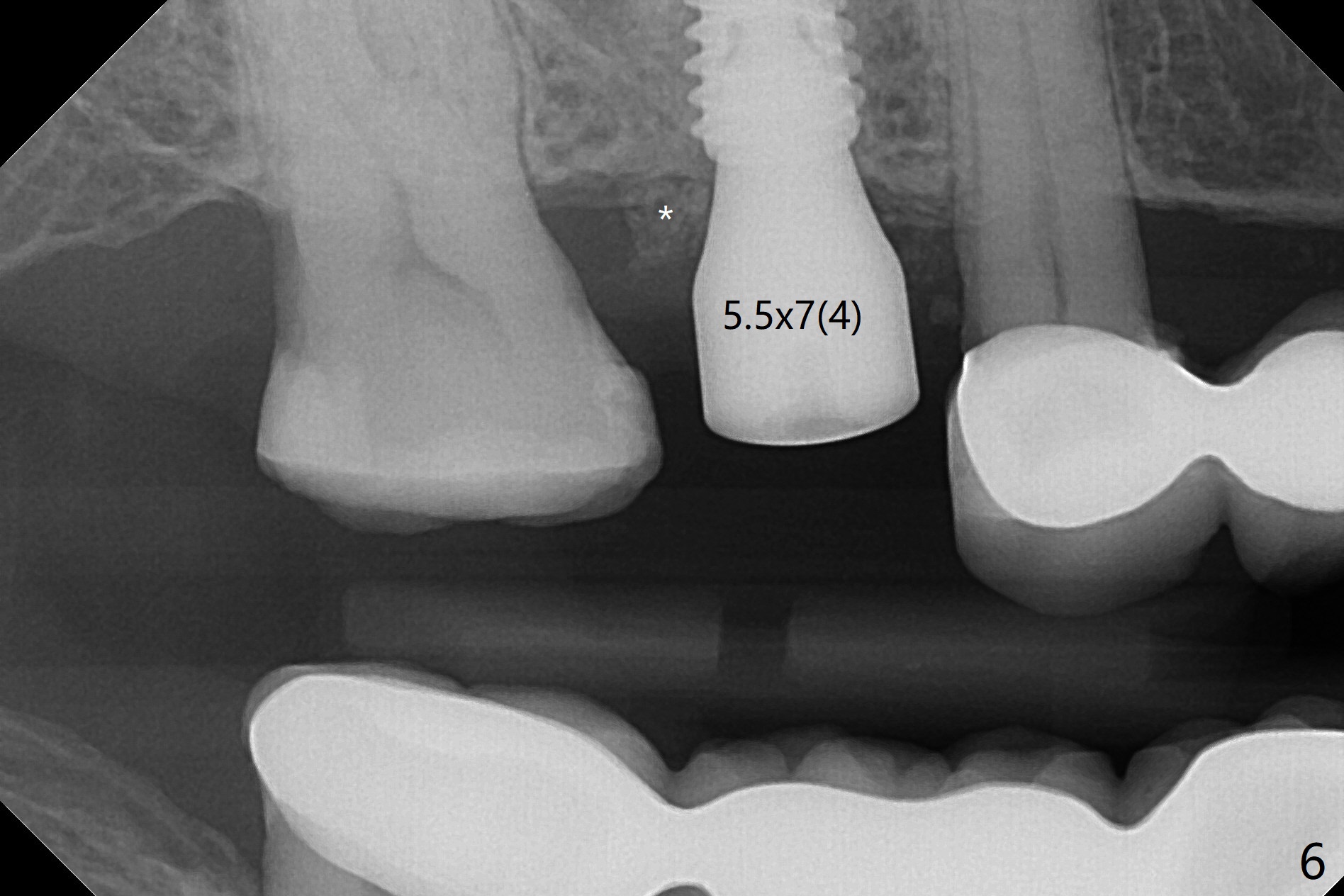 我们将使用粘性骨块做上颌窦内提升。抽血,一个红试管(含促凝剂),离心每分钟1500转,3分钟,提取上清液,与异体骨混合,几秒钟骨粉就开始凝聚(录像)。右上六缺牙区切开,开始用2毫米钻头钻洞,深度4毫米,如何使用2.8,3.6毫米园钻头(对上颌窦膜安全),4-6 毫米深,由于上颌窦底板是斜型,没有突破感。接着想利用粘性骨块和报废植体,把骨块送上去,这时骨块相当硬,必须事先剪成适当大小,然后用报废植体(4x10毫米)慢速推上去(录像2,图一(*骨块))。数次提升后,放置4.5x8.5毫米正式植体(图二),调整植体深度(图三:<),在稍微暴露植体表面放置骨块(图四:*)。其实愈合基台没有就位(图五:>),更换后没这个问题(图六)。