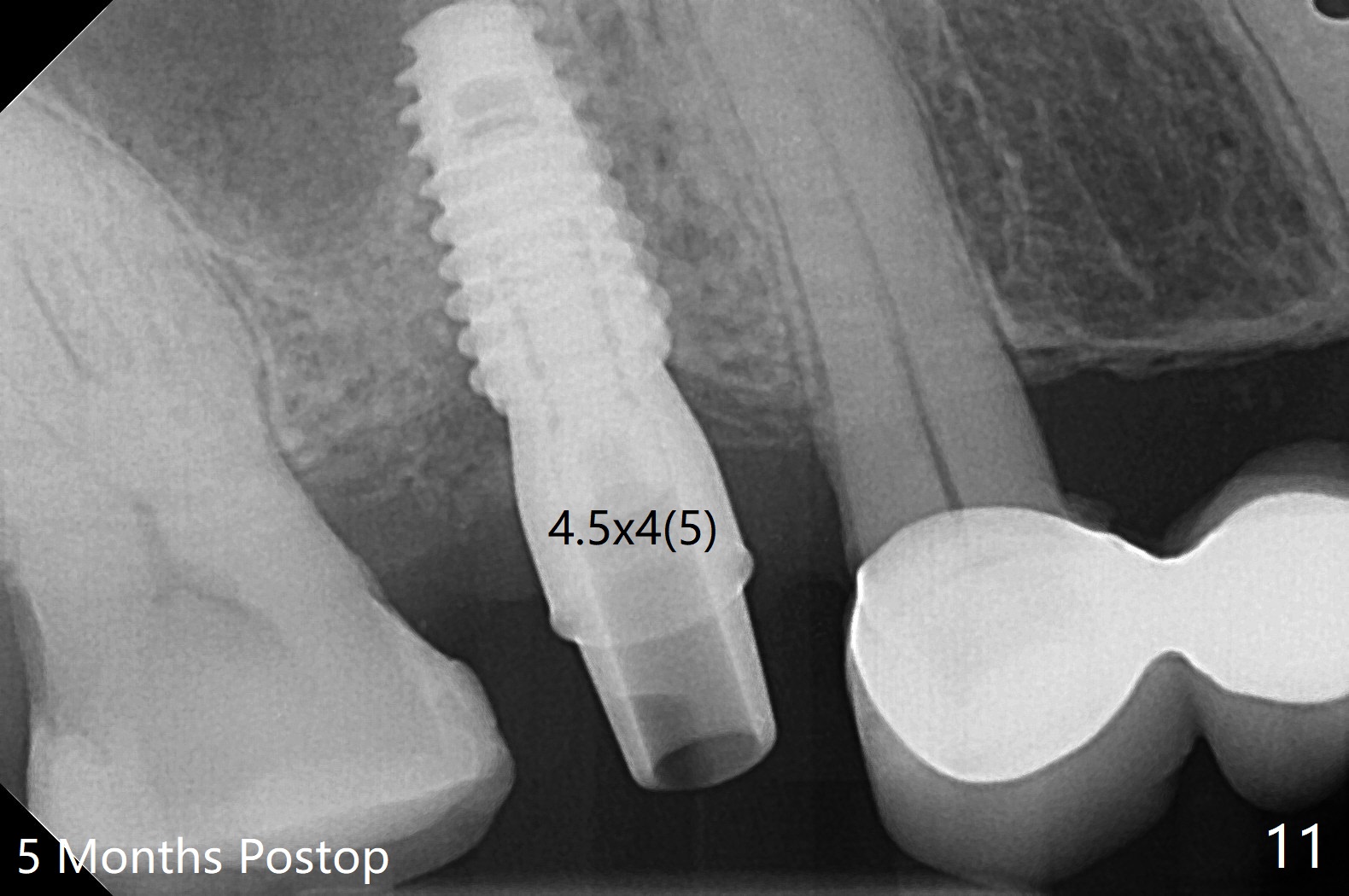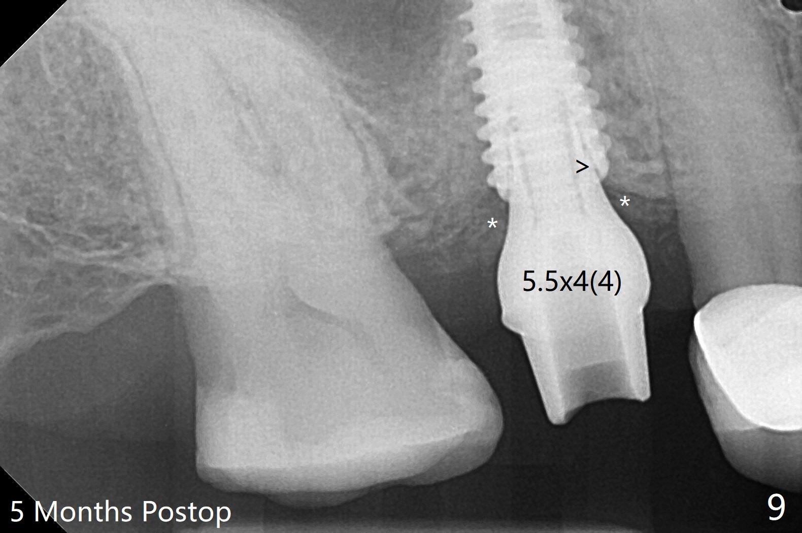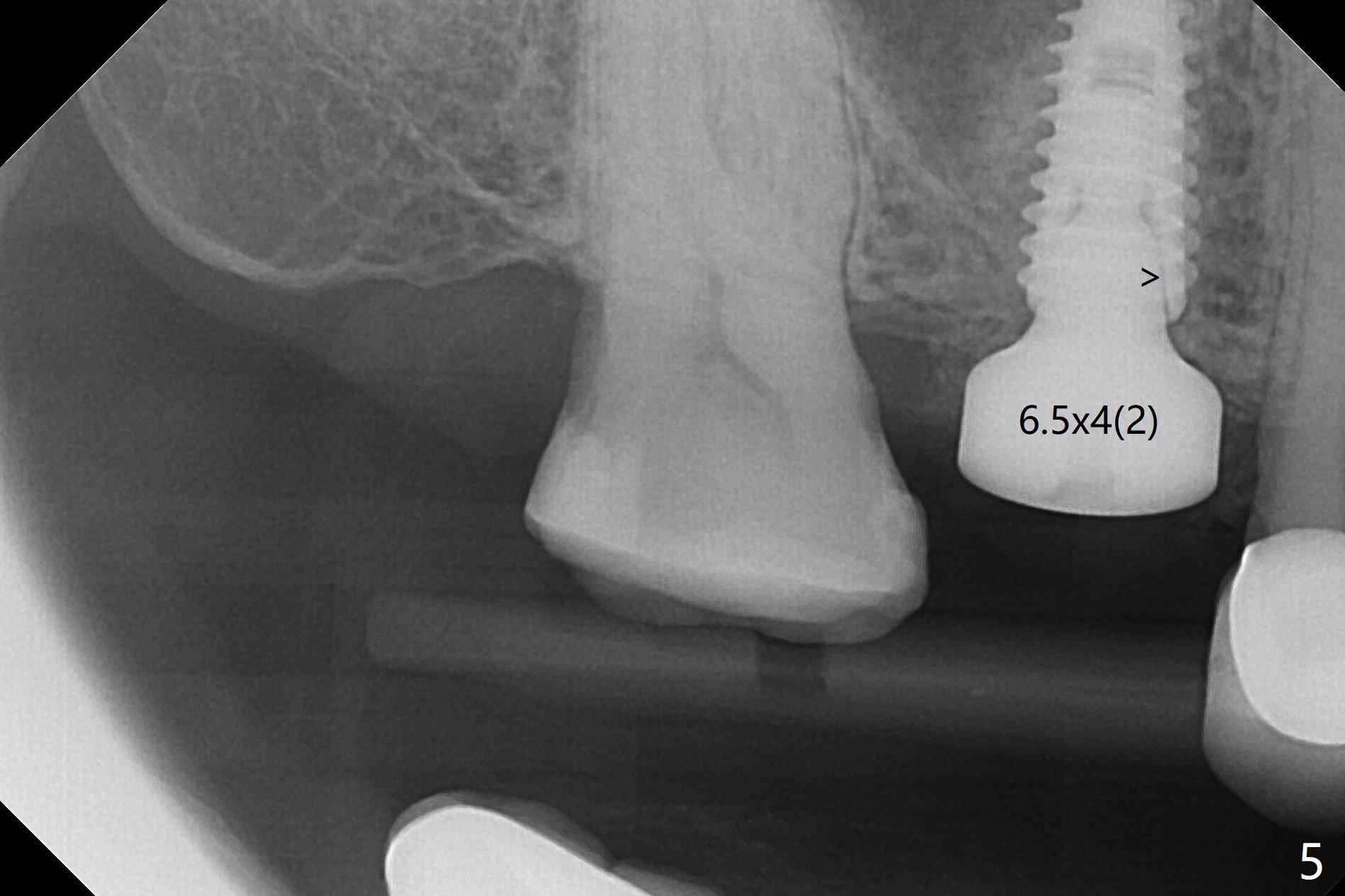 提取上清液后,红管再次离心,同样速度,5分钟,便形成PRF(胶状,上面黄色部分,图七),由于试管在离心机放置角度缘故,PRF与下面红血球部分(深色)交界处是一个斜面,制作PRF膜前,必须在交界处下面剪(图八白斜线),因为在交界处有效成分浓度最高,请看录像(虽然剪的太高些)。制作完毕的PRF膜可以覆盖图四骨块表面,但是用于图一之后,塞入上颌窦(录像),目的促进上颌窦膜修复,万一提升时出现隐形破裂。术后五个月放置5.5x4(4)毫米基台,未完全就位:基台与植体之间有间隙(图九:>),可能牙槽嵴阻挡(*),直径小的基台容易就位(图十),植体根尖空间(上下)也缩小(图十一)。