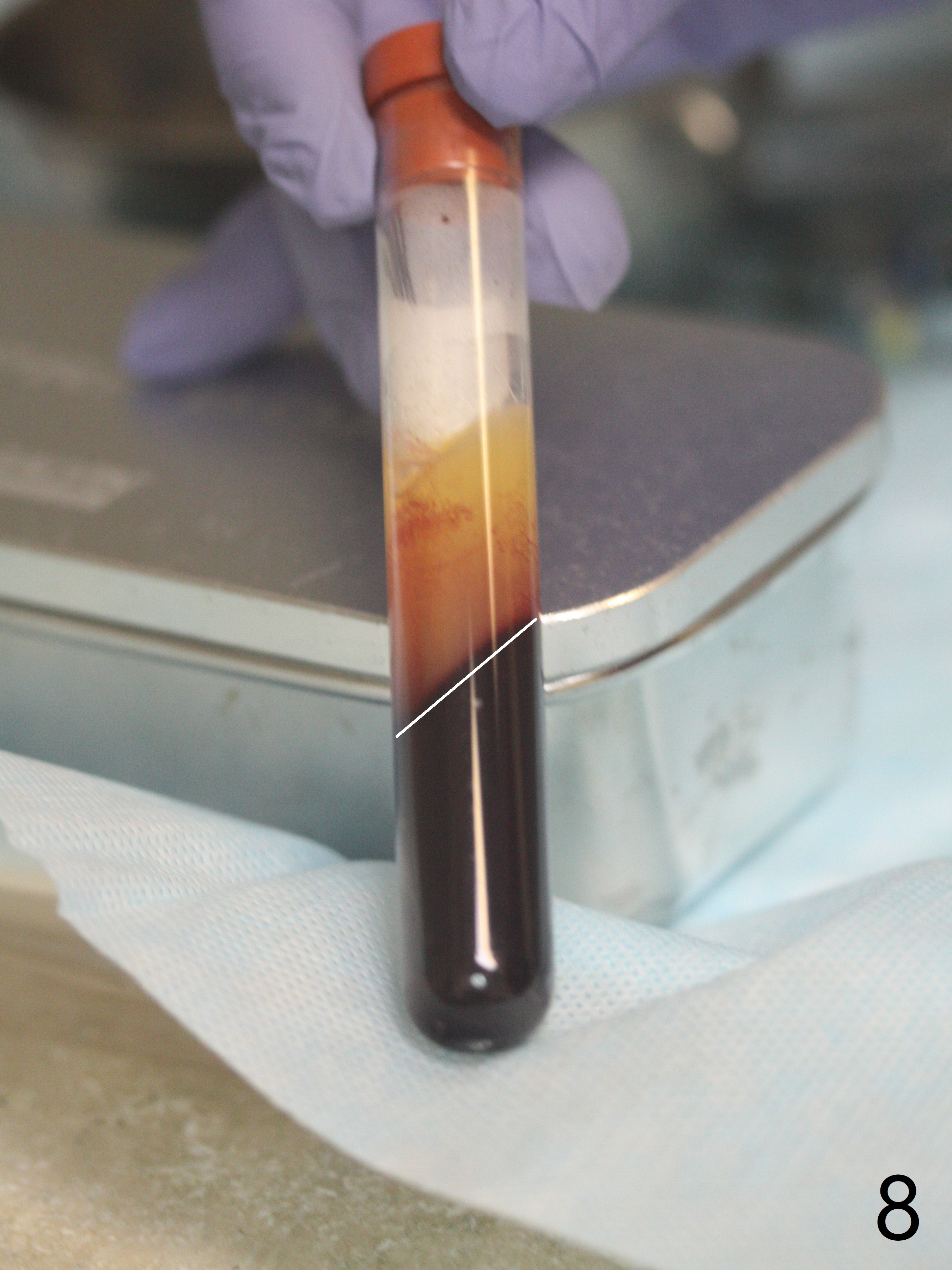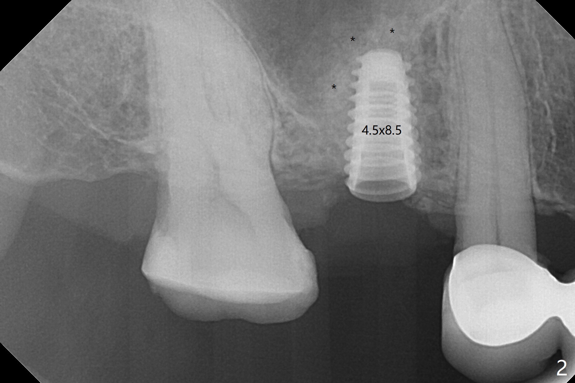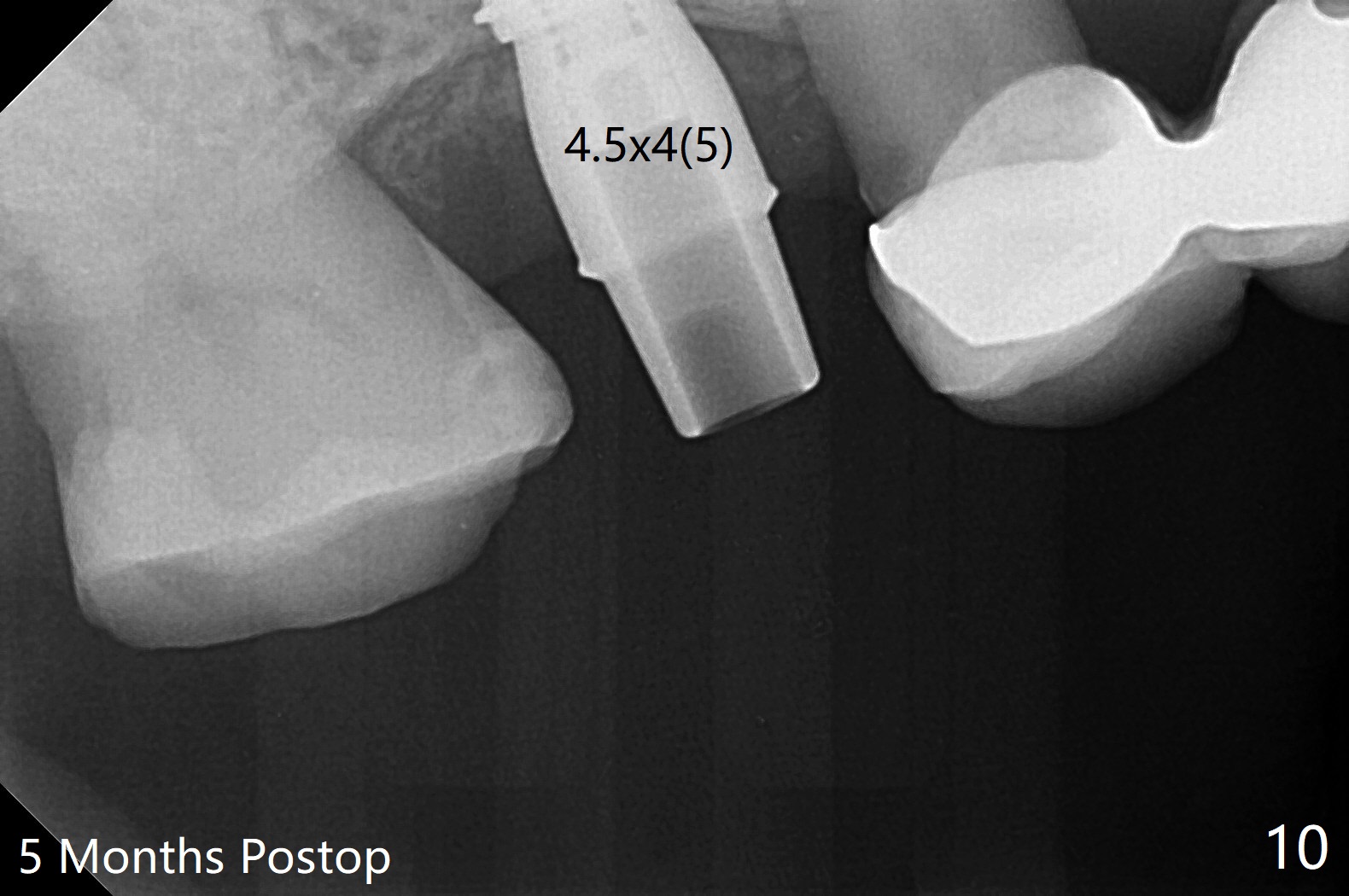提取上清液后,红管再次离心,同样速度,5分钟,便形成PRF(胶状,上面黄色部分,图七),由于试管在离心机放置角度缘故,PRF与下面红血球部分(深色)交界处是一个斜面,制作PRF膜前,必须在交界处下面剪(图八白斜线),因为在交界处有效成分浓度最高,请看录像(虽然剪的太高些)。制作完毕的PRF膜可以覆盖图四骨块表面,但是用于图一之后,塞入上颌窦(录像),目的促进上颌窦膜修复,万一提升时出现隐形破裂。术后五个月放置5.5x4(4)毫米基台,未完全就位:基台与植体之间有间隙(图九:>),可能牙槽嵴阻挡(*),直径小的基台容易就位(图十),植体根尖空间(上下)也缩小(图十一)。