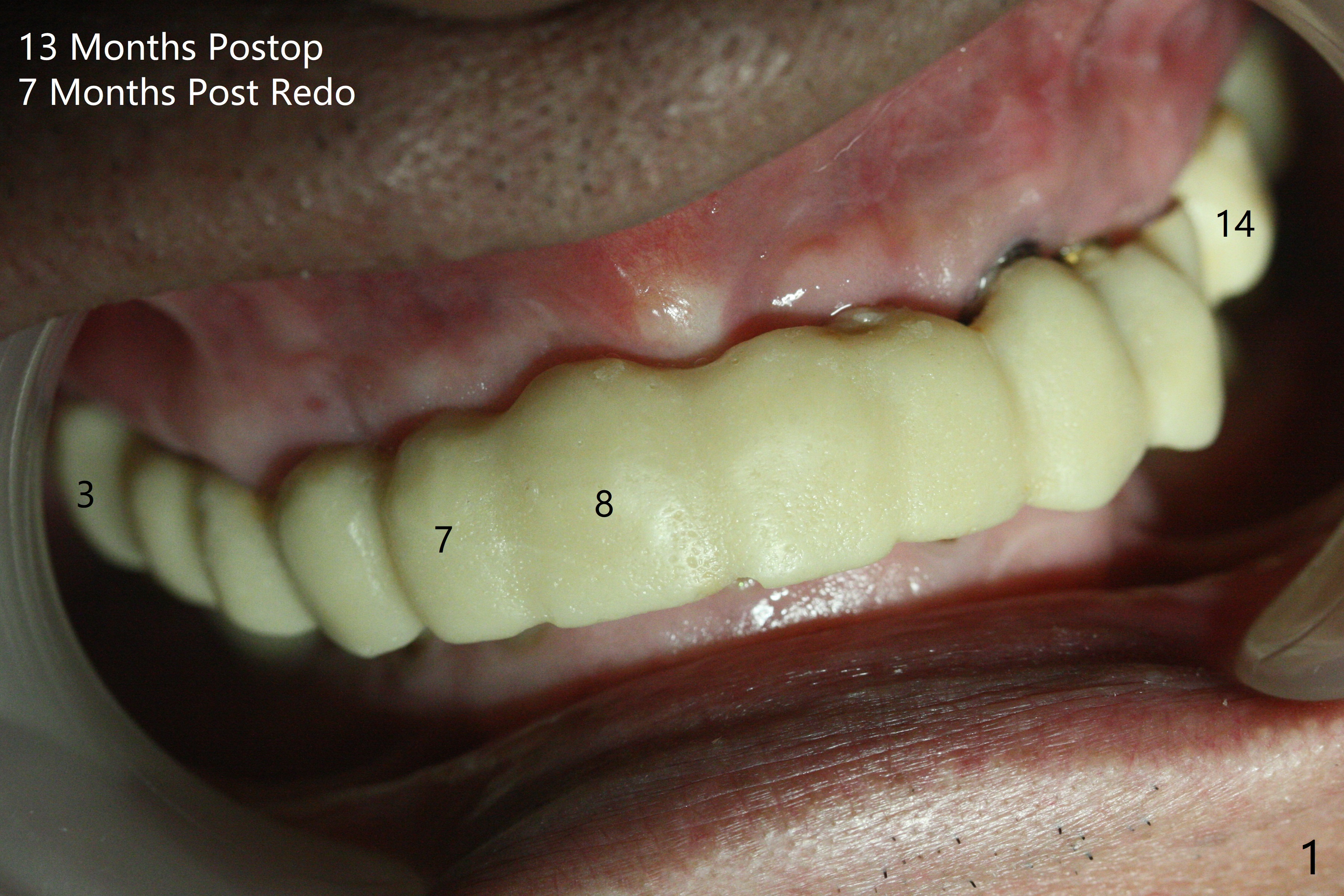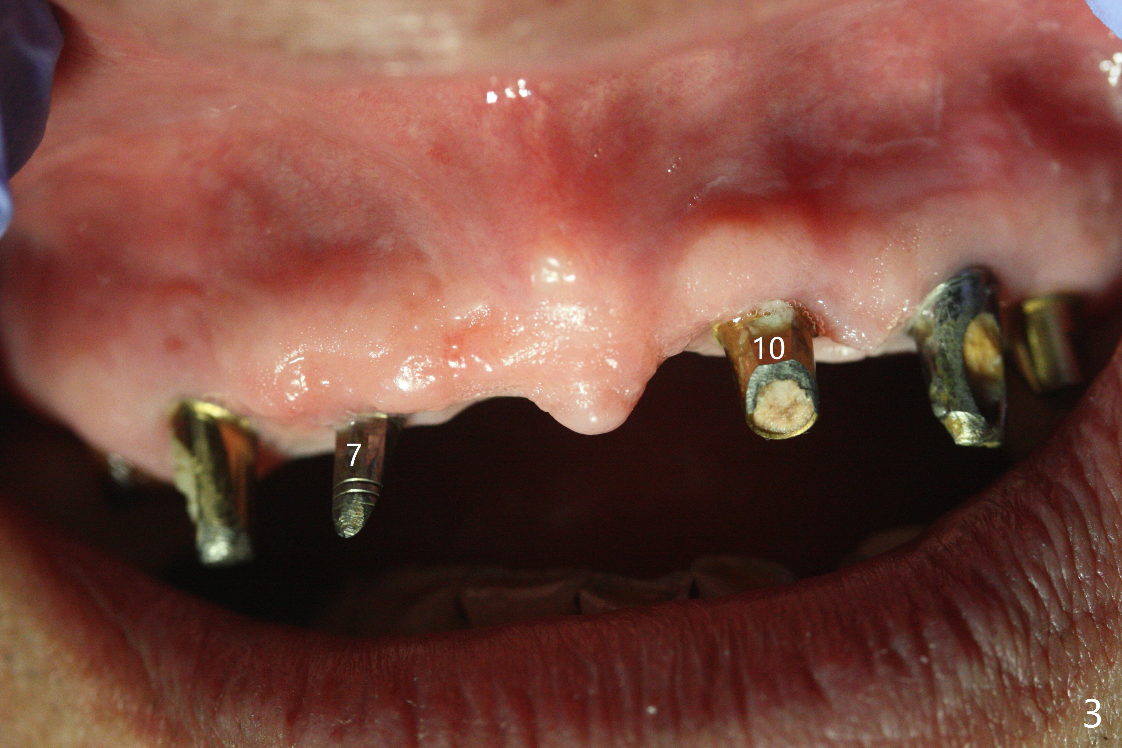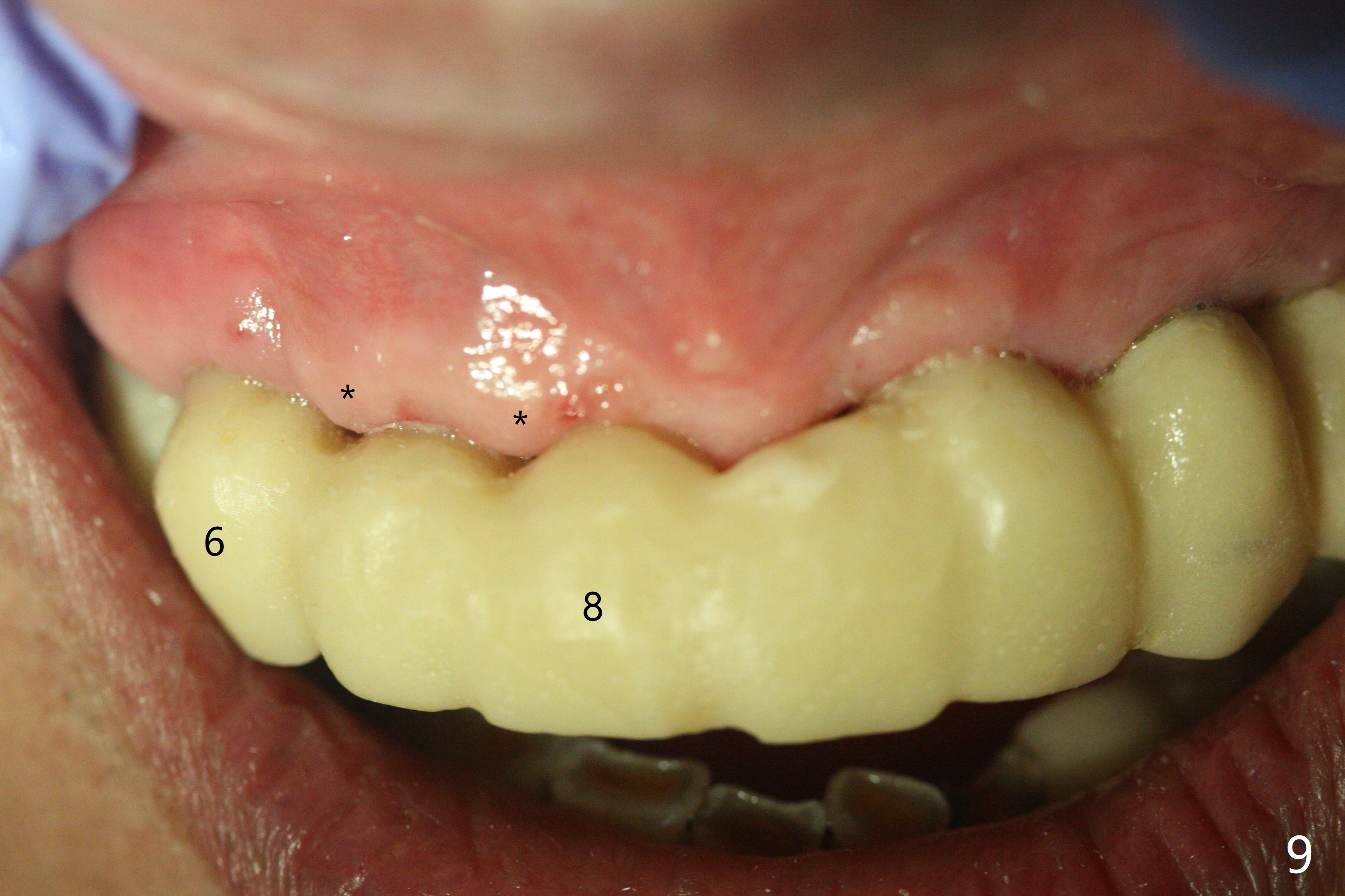With temporarization of #3,4,13-15 (Fig.1), the anterior clearance is maintained (Fig.2). When provisional is removed, there is no papilla between #7 and 8 (Fig.3,4). After confirmation of complete seating of the abutments at #6 and 10 (Fig.5,6), gingivectomy is conducted with Diode laser (Fig.7,8). Following provisional being relined and modified, the anterior papillae form (Fig.9).