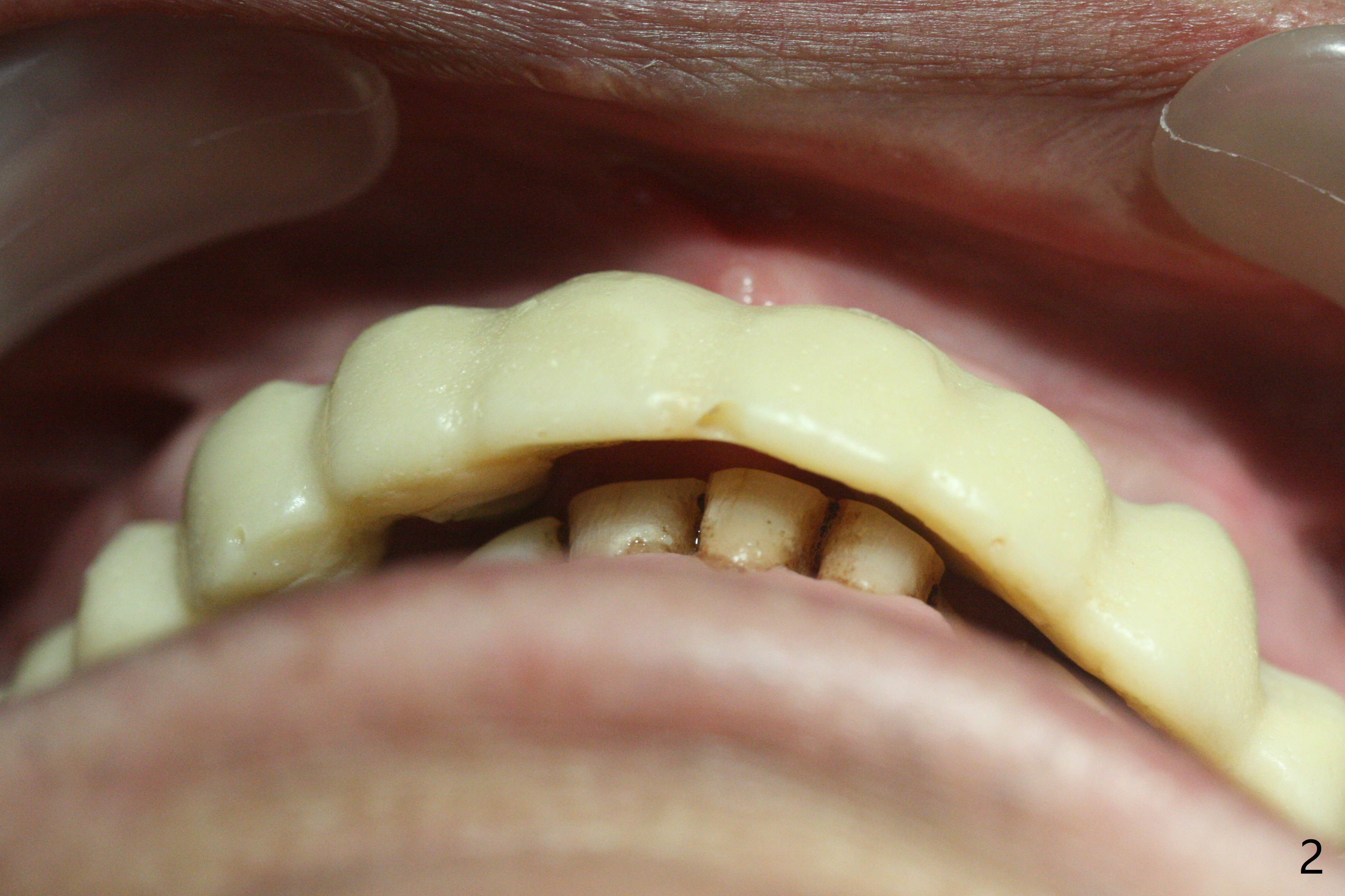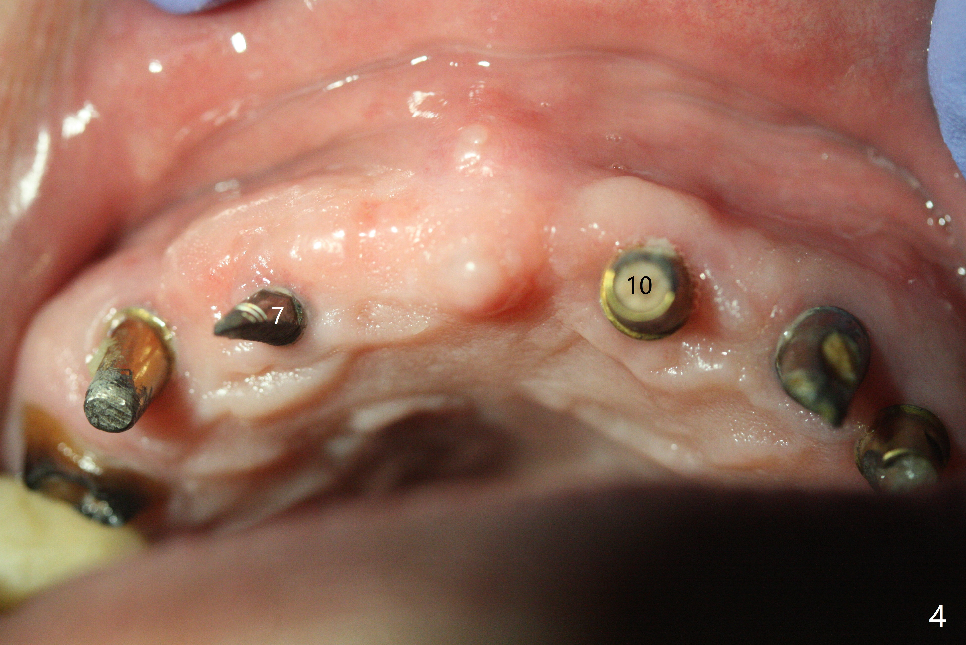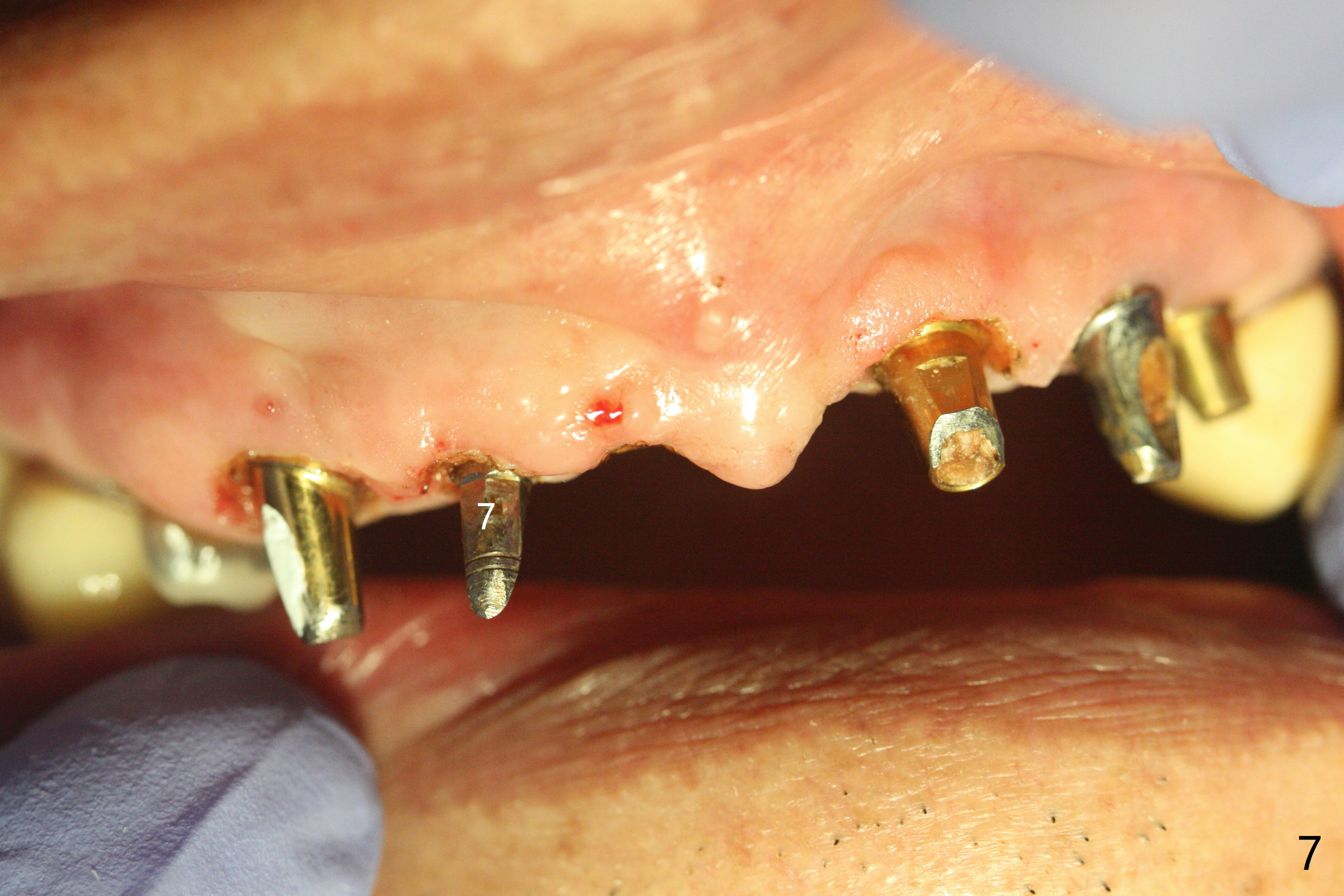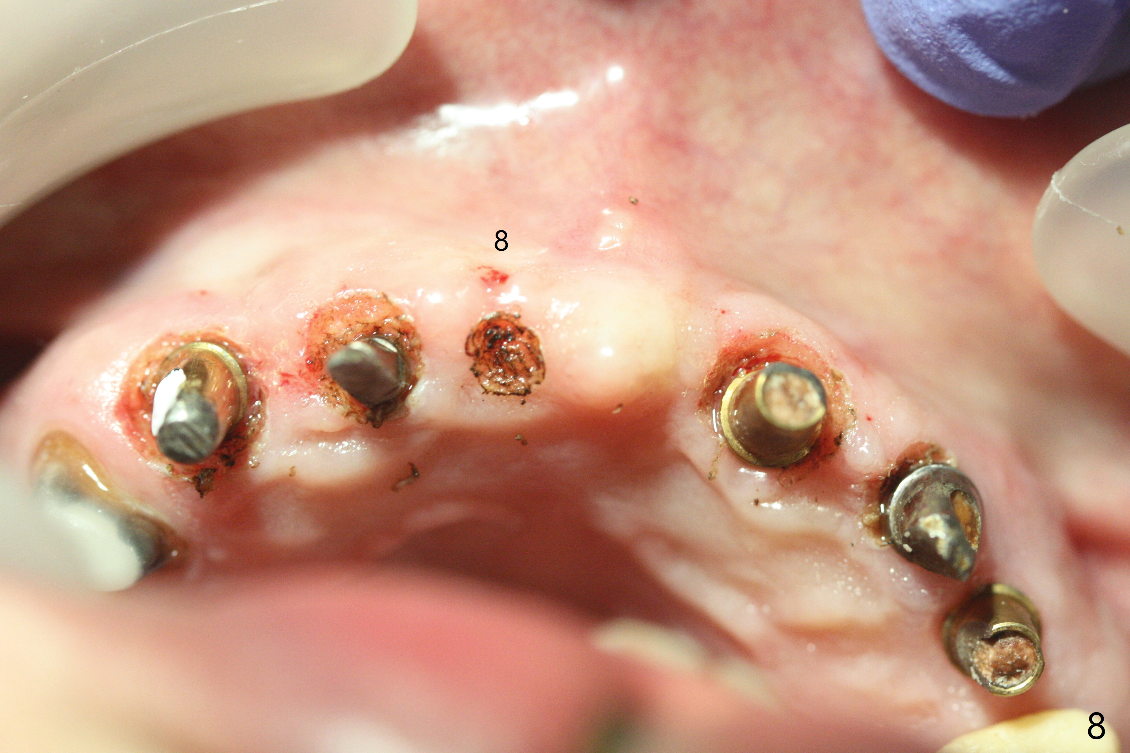 With temporarization of #3,4,13-15 (Fig.1), the anterior clearance is maintained (Fig.2). When provisional is removed, there is no papilla between #7 and 8 (Fig.3,4). After confirmation of complete seating of the abutments at #6 and 10 (Fig.5,6), gingivectomy is conducted with Diode laser (Fig.7,8). Following provisional being relined and modified, the anterior papillae form (Fig.9).