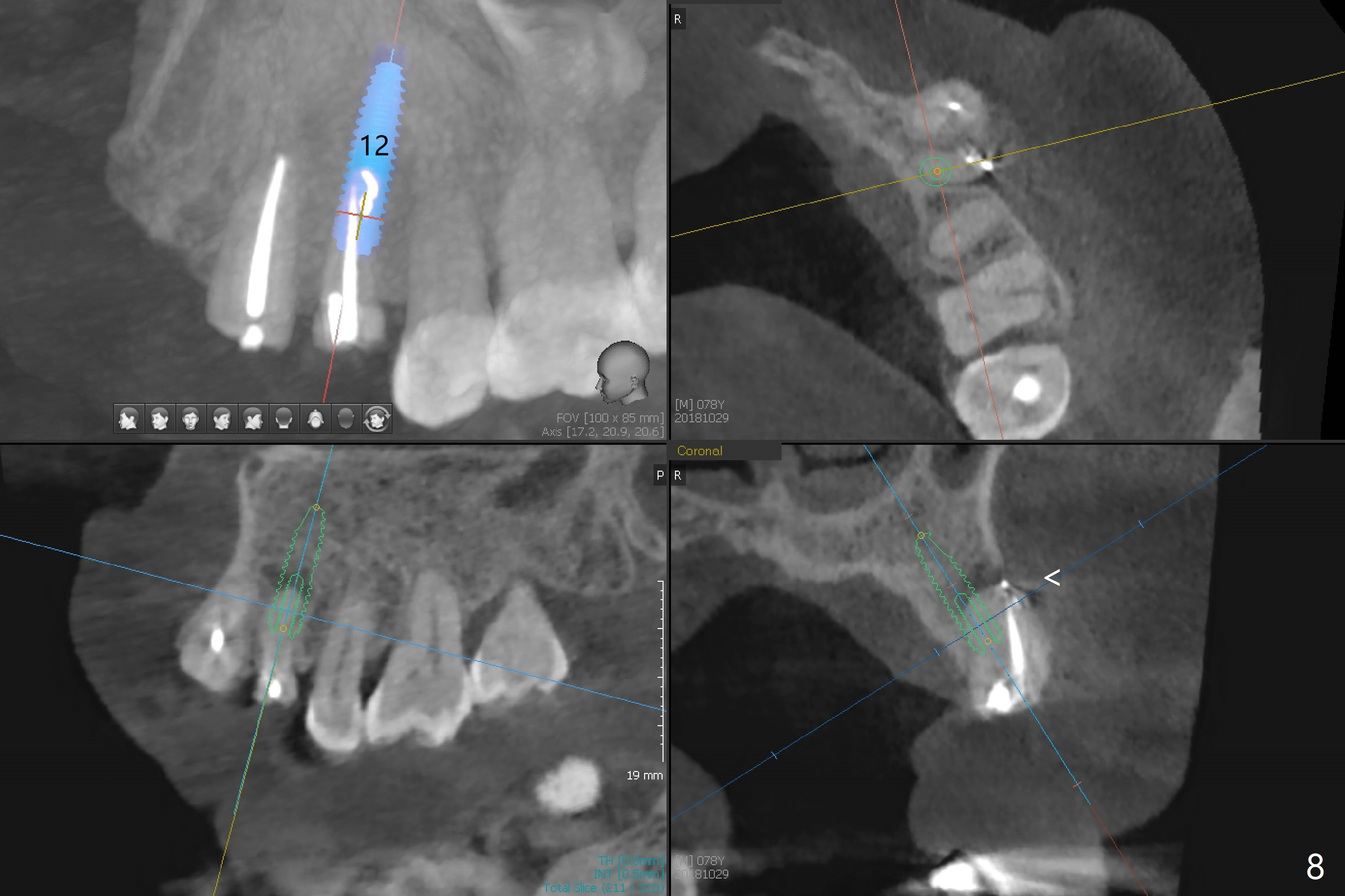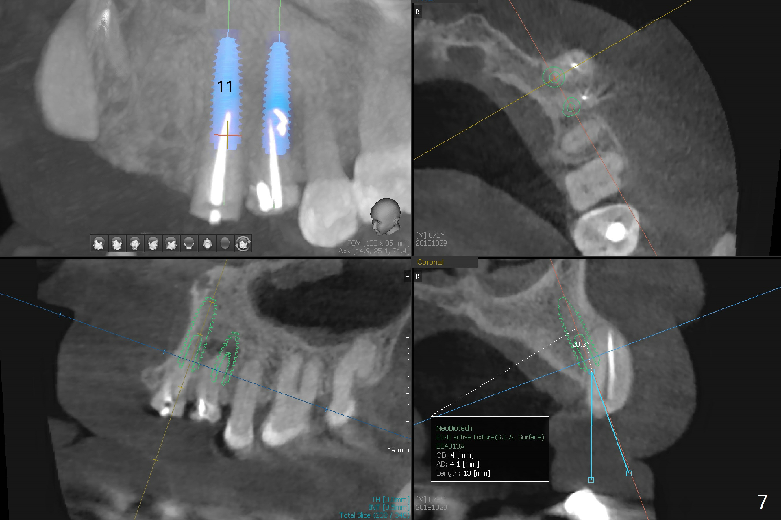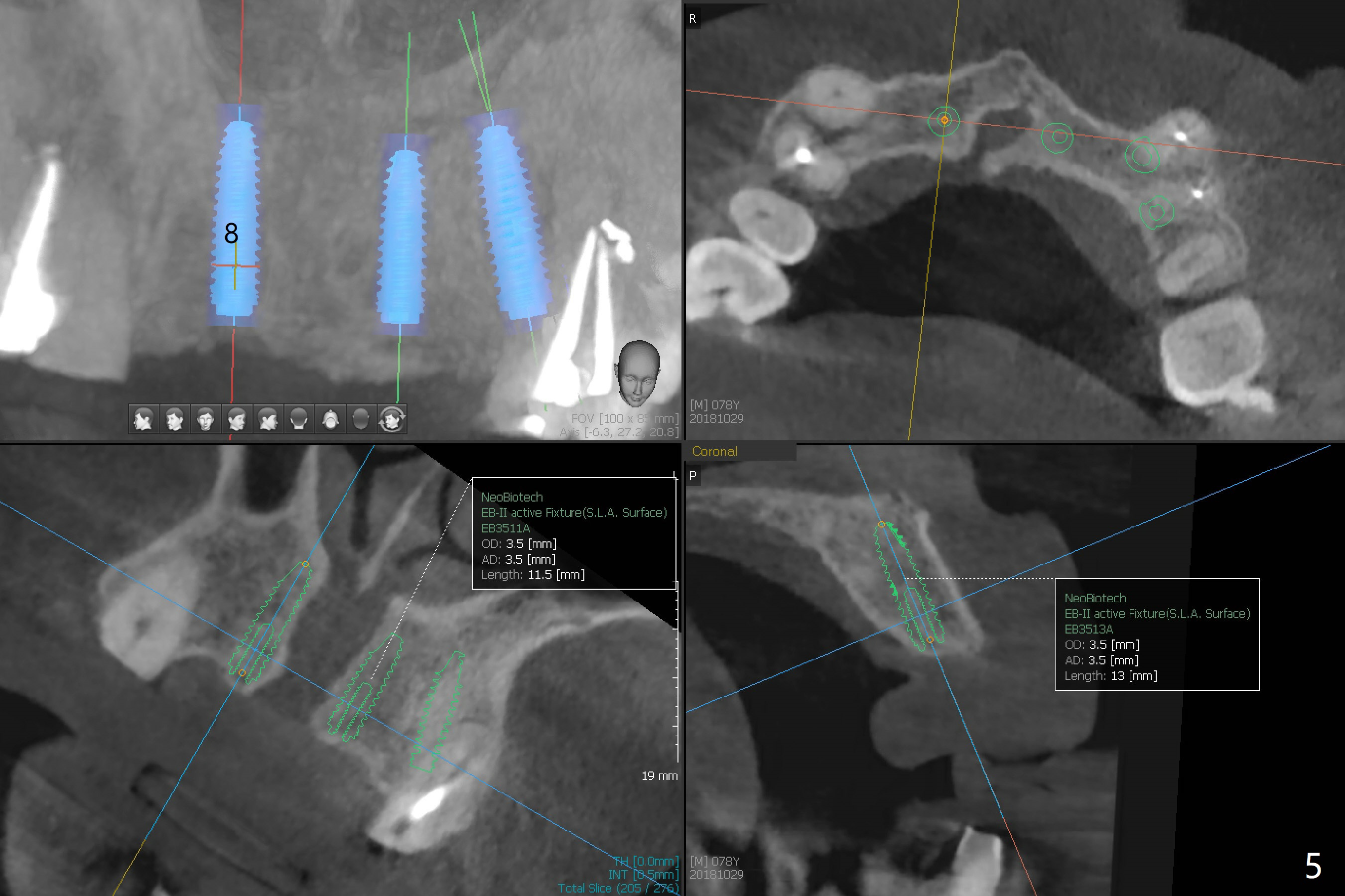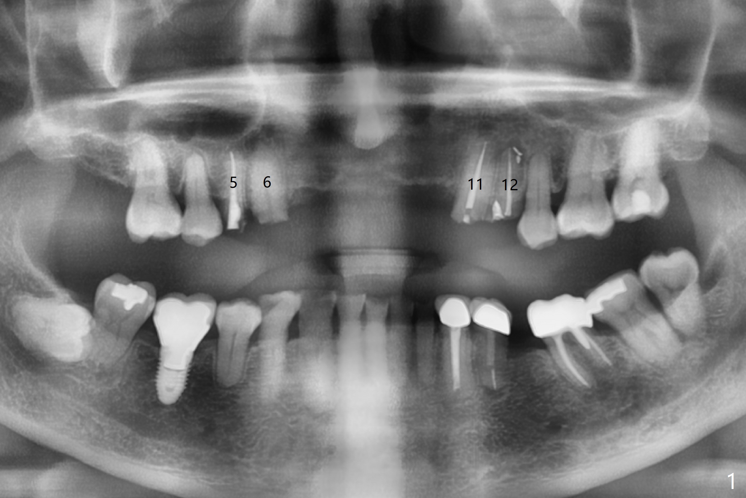 A 78-year-old man's 8 unit FPD dislodges (#5-12, Fig.1). Three of 4 abutments seem to be non-salvageable (#6,11,12 fractured equigingival, extraction, immediate implants). For restoration, implant will be placed at #8 and 9 as well. Implant FPDs will be fabricated at #6-8 and 9-11 (Fig.2) with #5 (with build up or prefabricated post) and 12 single unit crowns to better withstand deep overbite and overjet. After discussion with lab, a major change will be implants to be placed at #7 and 10 instead of #8 and 9 (narrow ridge). The implant at #7 will be a 1-piece (3 mm in diameter), whereas the rest 2-piece (3.5 mm). The abutment of IS 1-piece implant is 10 mm in length, while that of DIO's 5 mm. The former will be used if the vertical space is sufficient.