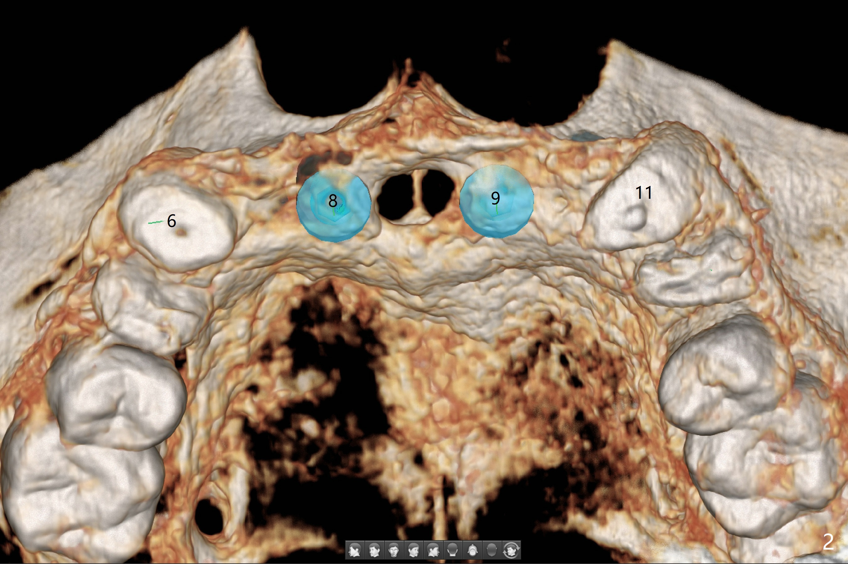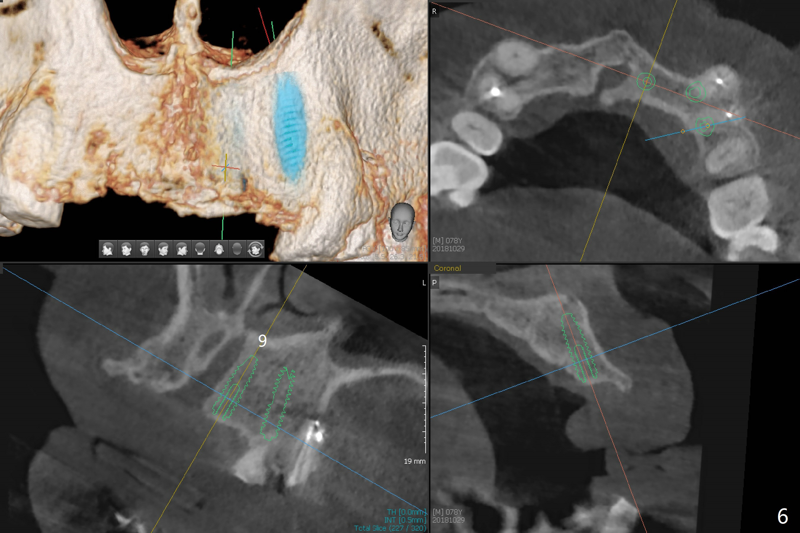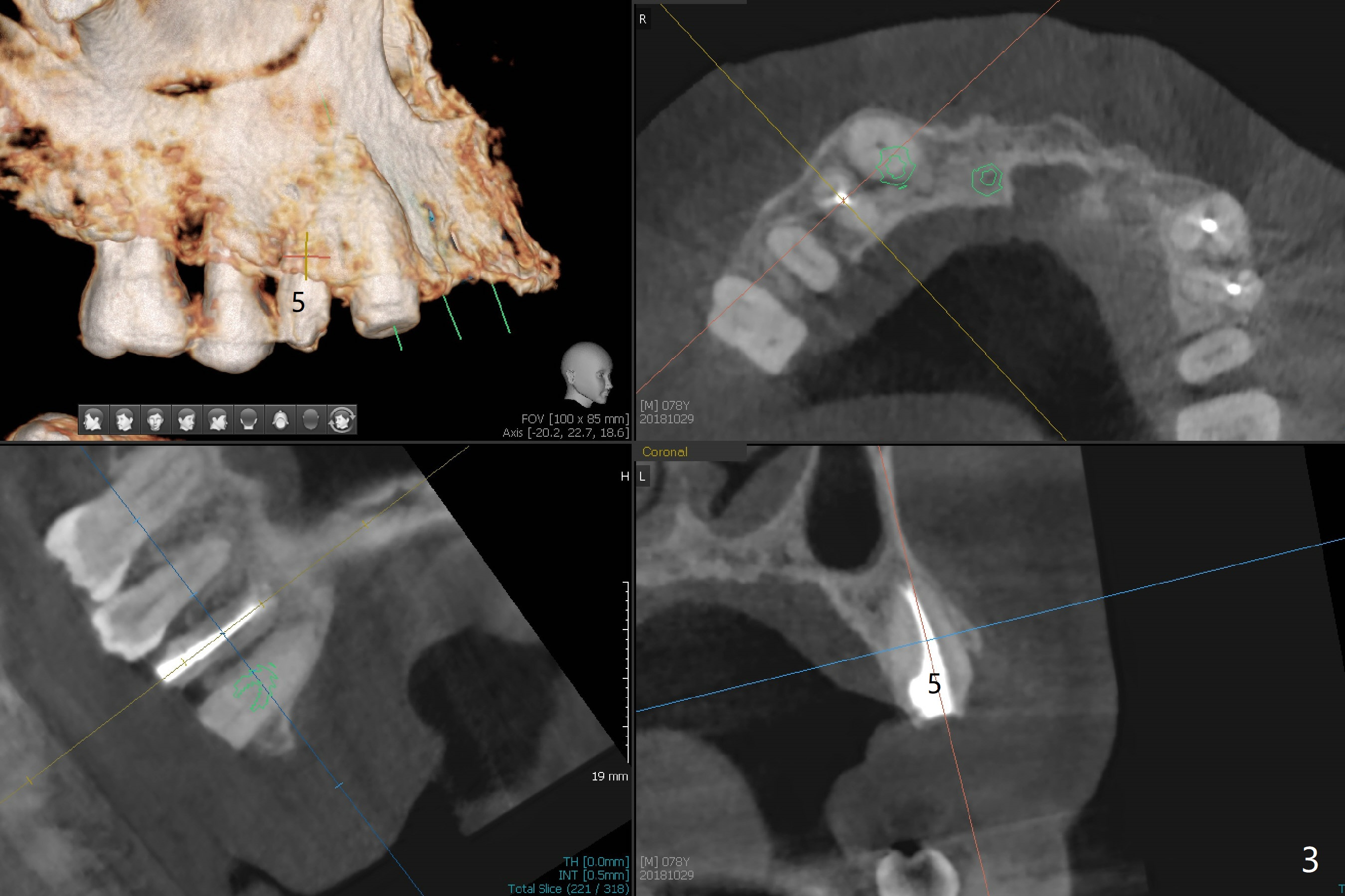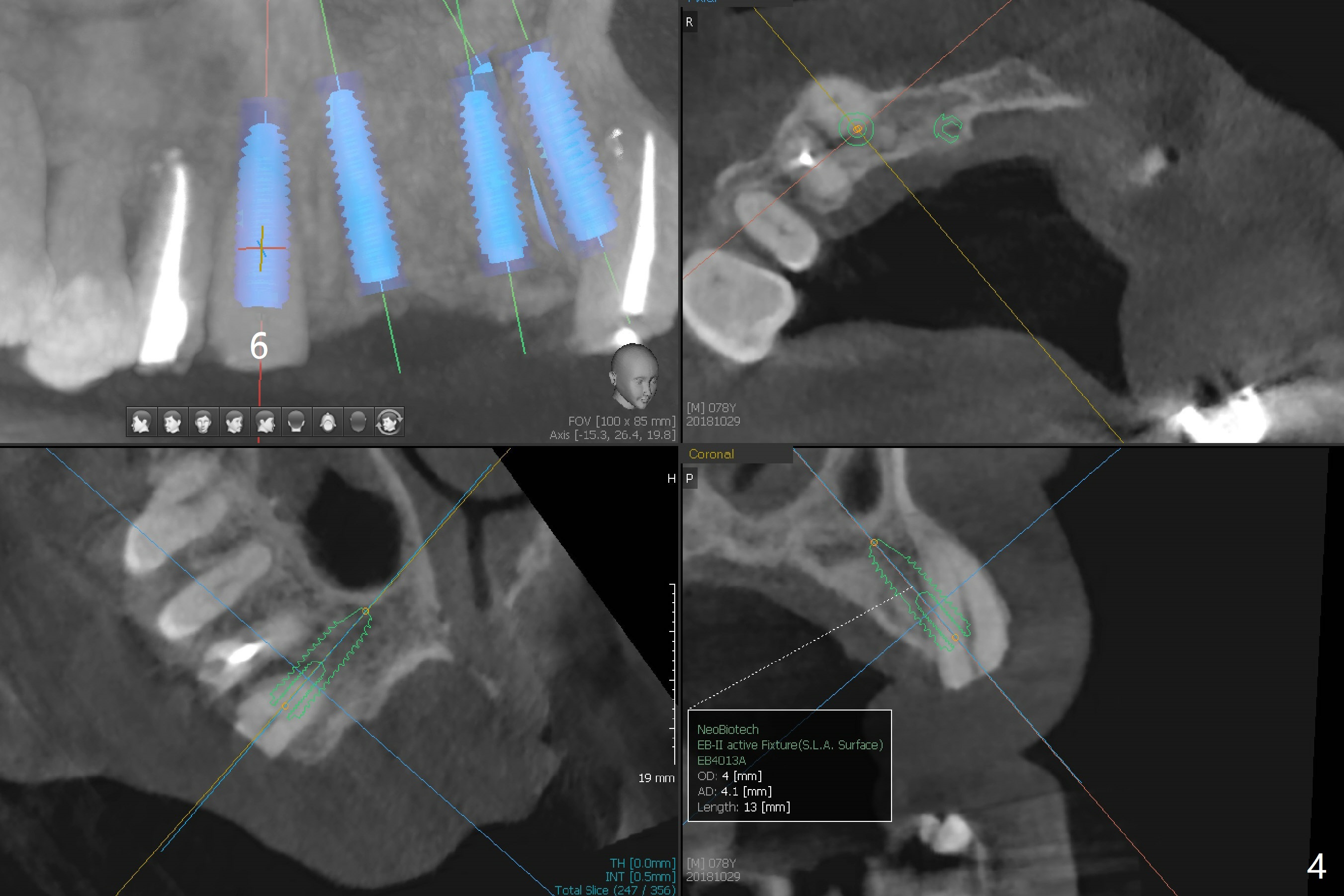 A 78-year-old man's 8 unit FPD dislodges (#5-12, Fig.1). Three of 4 abutments seem to be non-salvageable (#6,11,12 fractured equigingival, extraction, immediate implants). For restoration, implant will be placed at #8 and 9 as well. Implant FPDs will be fabricated at #6-8 and 9-11 (Fig.2) with #5 (with build up or prefabricated post) and 12 single unit crowns to better withstand deep overbite and overjet. After discussion with lab, a major change will be implants to be placed at #7 and 10 instead of #8 and 9 (narrow ridge). The implant at #7 will be a 1-piece (3 mm in diameter), whereas the rest 2-piece (3.5 mm). The abutment of IS 1-piece implant is 10 mm in length, while that of DIO's 5 mm. The former will be used if the vertical space is sufficient.
