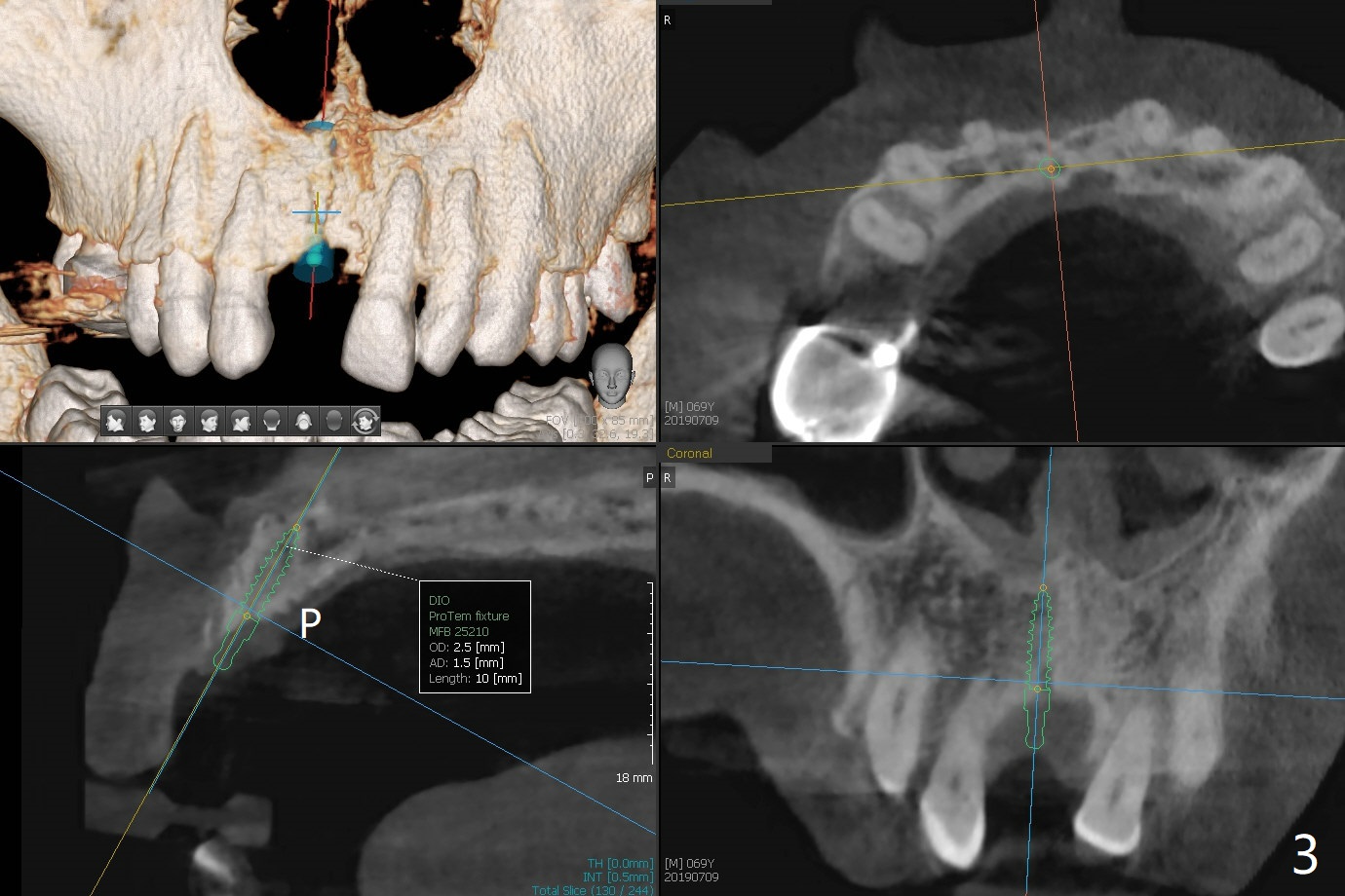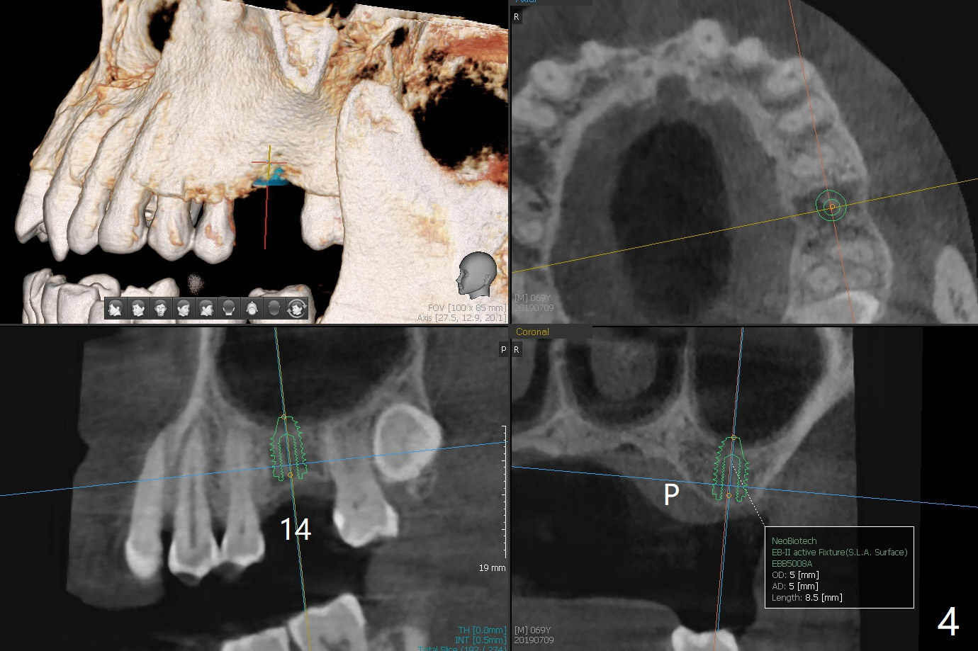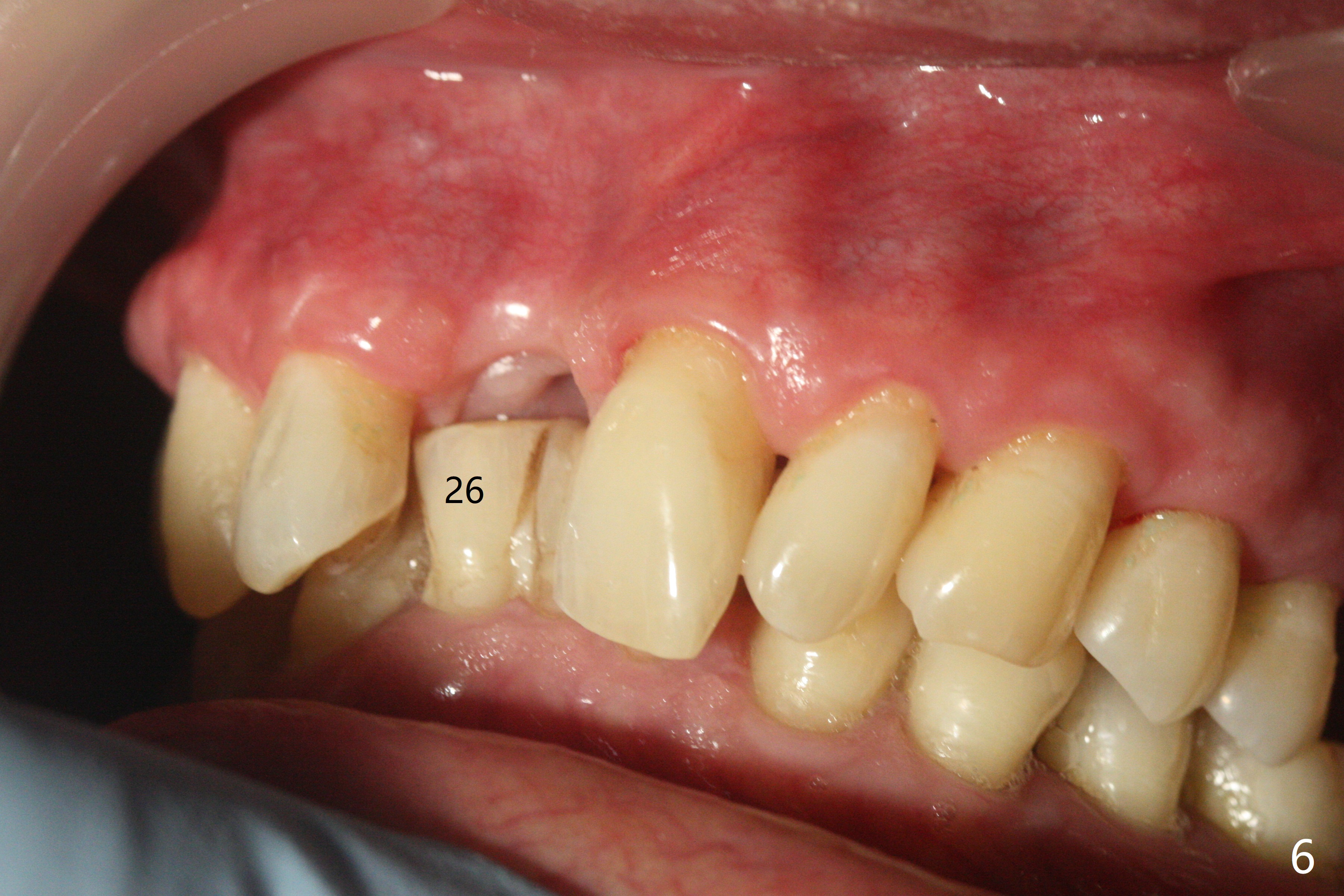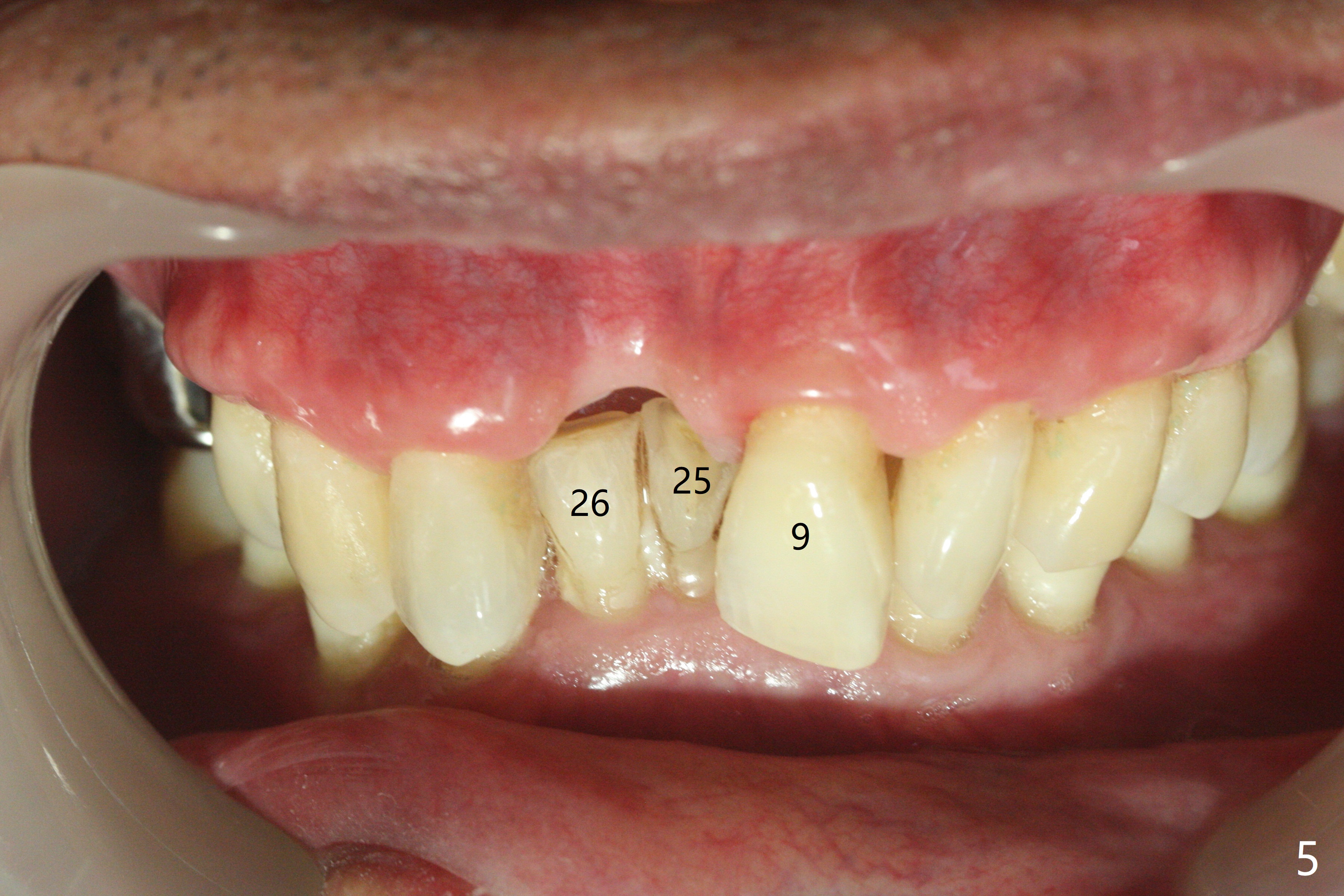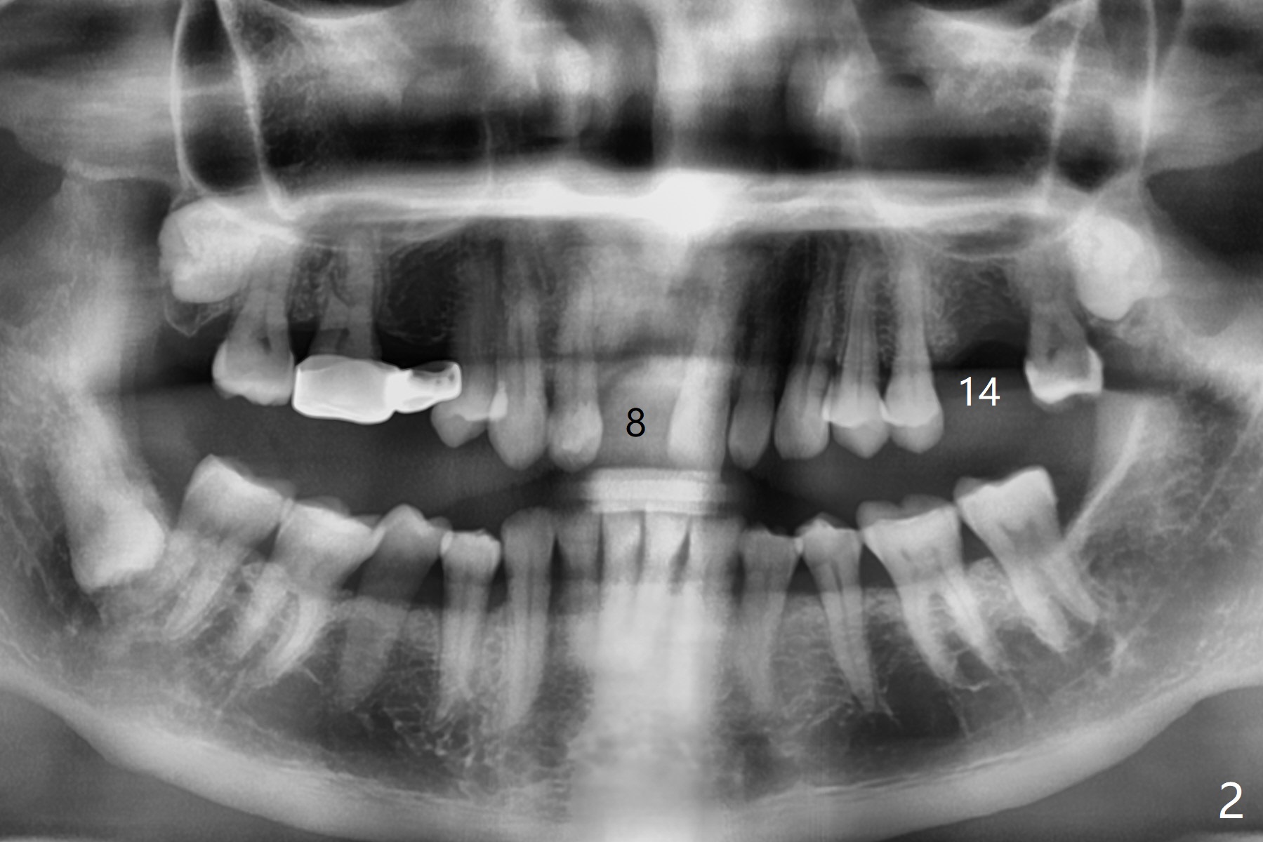 A 69-year-old man (ex-soldier) had the tooth #8 extracted for a flipper nearly 8 years earlier (Fig.1 (obliterated canal)). A denture tooth is added at #14 after extraction in NY a few years later (Fig.2). In spite of sufficient bone width at #8, a 2.5x10 mm mini implant will be chosen to reduce the chance of palatal thread exposure (Fig.3 P). A 5x8.5 mm implant will be placed at #14 to achieve enough stability and not cause sinus complication (Fig.4). Take preop photos to show the anterior deep overbite and overjet. In fact the patient canceled the surgery. Two years later, he returns with history of right TMJ dislocation, which may be related to reduced mastication efficiency and partial edentulism (Fig.5,6).