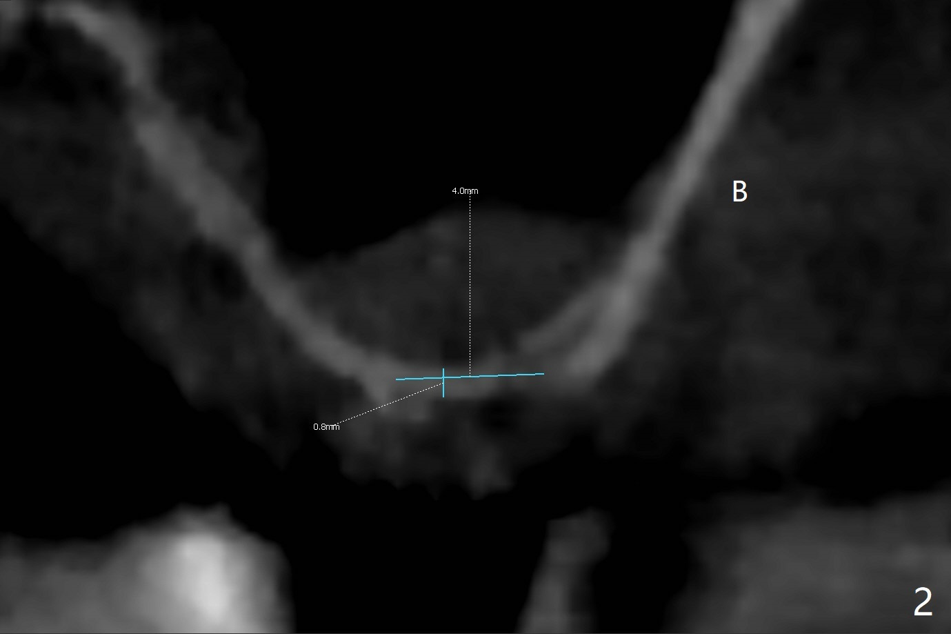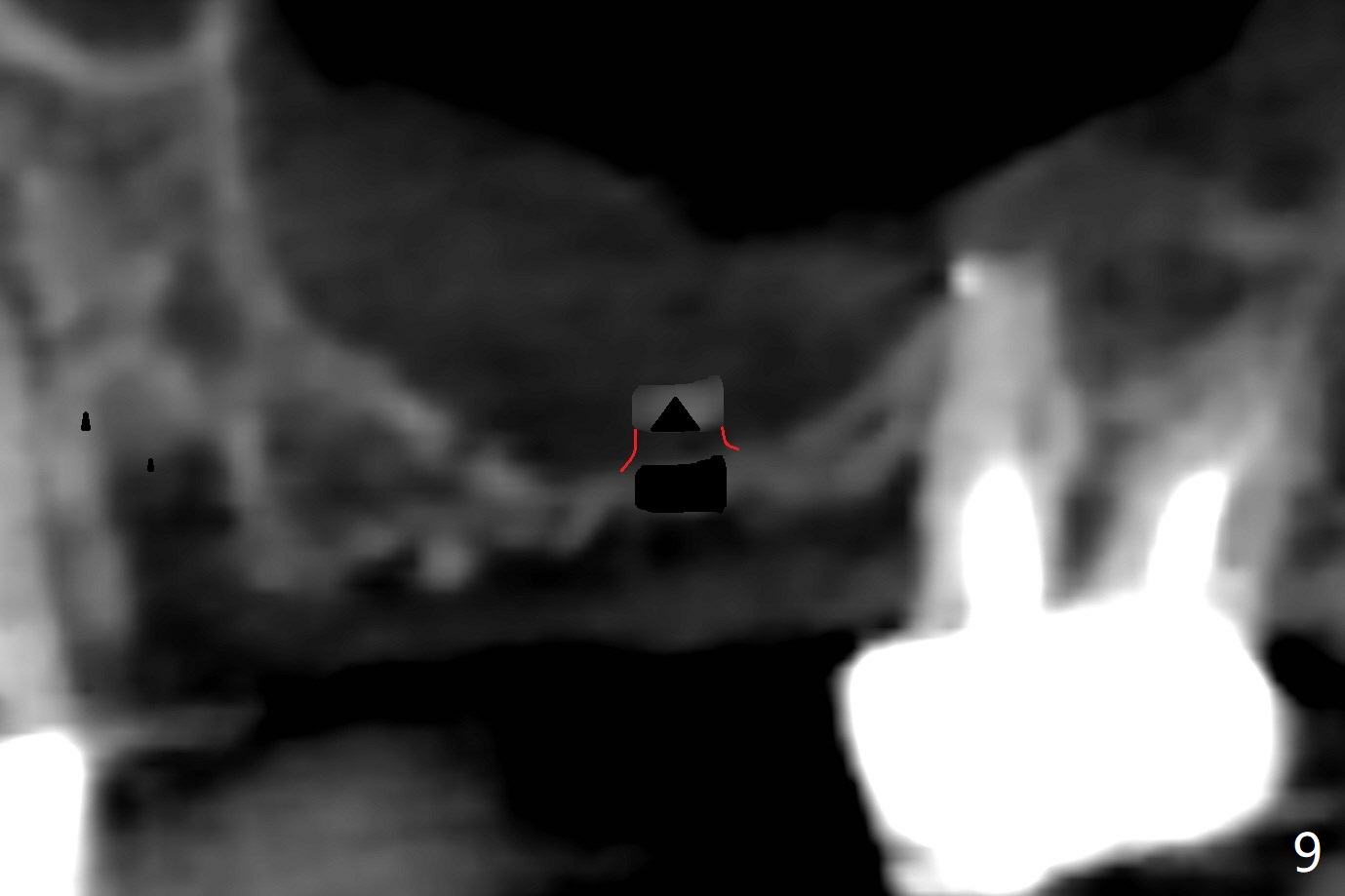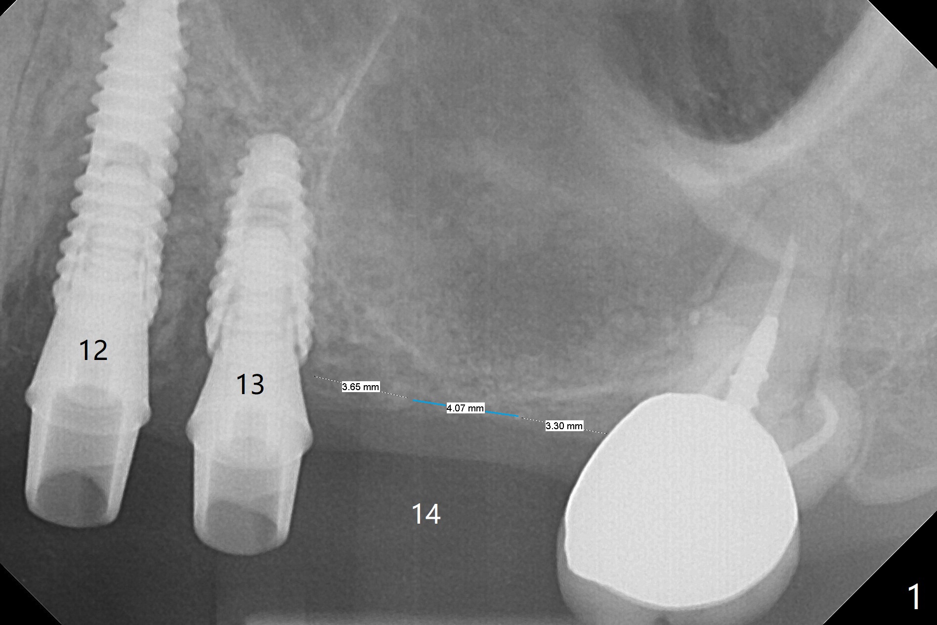 A 68-year-old timid woman is considering implant at #14 twenty months post cementation of #13 and 14 crown (Fig.1). Because of the narrow buccopalatal width (Fig.2 CT coronal section, B: buccal), a 4 mm implant (blue line) seems to be appropriate for the site (Fig.1). After crestal incision and flap reflection, a diamond round bur is used to thin the sinus floor until the bluish membrane is barely visible. An osteotome (Magic Sinus Lifter) is used for penetration. Water lift will be conducted if necessary, considering the already thickened sinus membrane (Fig.3 (CT sagittal section) M). Insert the first PRF membrane, followed by bone graft (not too sticky) repeatedly. Use sensor 1 to confirm lift degree. Try a 4x7 mm dummy FC to test stability. Place a definitive one (probably Magicore) if indicated. Use a second PRF membrane before closure of the wound. After nearly 15 month consideration (including coronovirus), the patient decides to get it done. With incision (Fig.4) and Marking Drill (Fig.5, the sinus membrane barely visible in the middle of the osteotomy (dimple, Fig.6 (black triangle)), the sinus floor does not break upon Magic Sinus Lifter). Later the patient complains of discomfort with tapping. In fact Magic Drill (similar to trephine bur, Fig.7) is used to break into the sinus without membrane perforation (Fig.8). Remember the thick membrane (Fig.2,3). In fact the fractured fragment is attached to the membrane (Fig.9 red lines, green sticky fracture). A small curette is used to further separate the membrane from the bony wall (Fig.10) before insertion of a small piece of PRF and sticky bone. When a 4.5x7 mm dummy implant is incompletely placed with stability (<10 Ncm), the membrane is stretched over the bone graft (Fig.11 M). After removal of the dummy, the major remaining piece of PRF (from 9 cc vial) and more allograft are placed before inserting a definitive implant (same size) with 15 Ncm; still the used to be thick membrane remains intact and stretched (Fig.12 M). The implant is equicrestal buccal, while slightly supracrestal palatal. To prevent implant dislodgement into the sinus and bone graft, a final abutment is placed (Fig.12). The wound is closed with 4-0 PGA, perio glue and perio dressing. The latter dislodges 3 days postop. The wound seems to be healing. No dressing is reapplied.