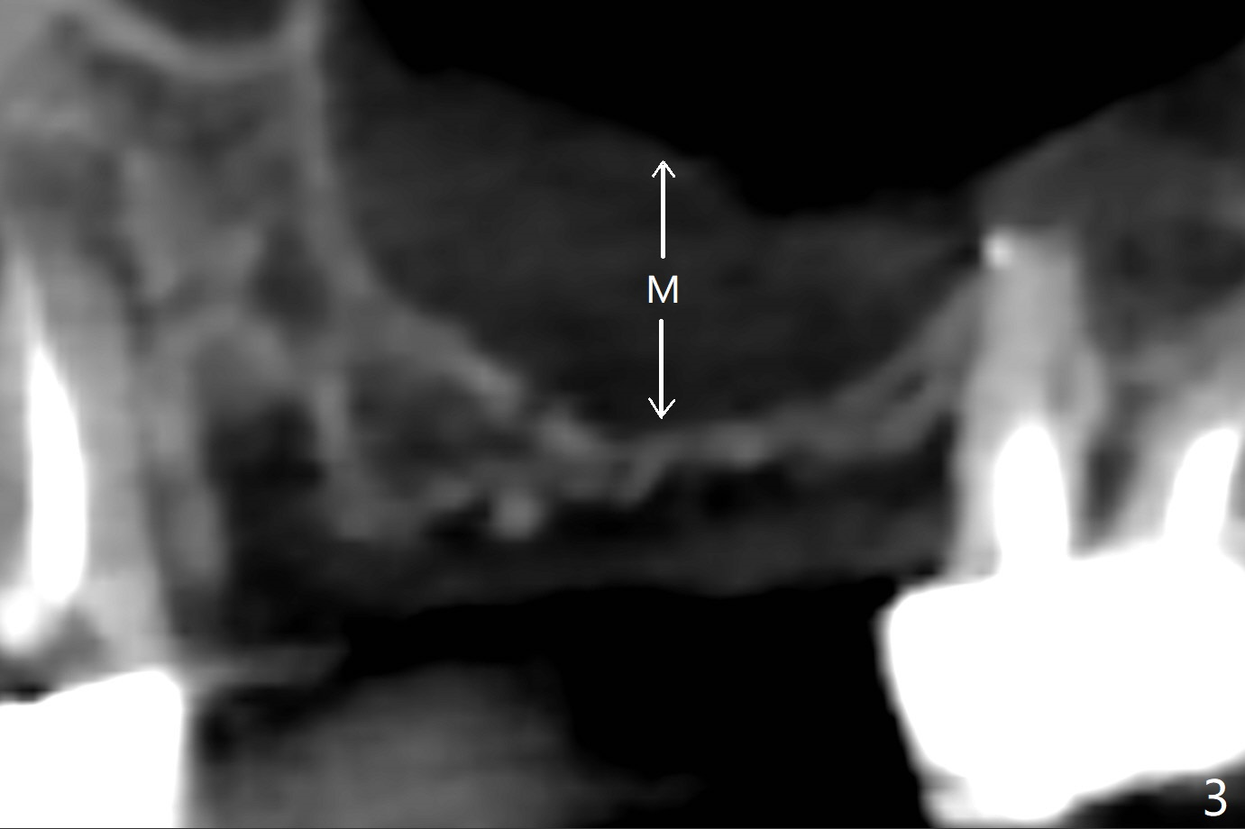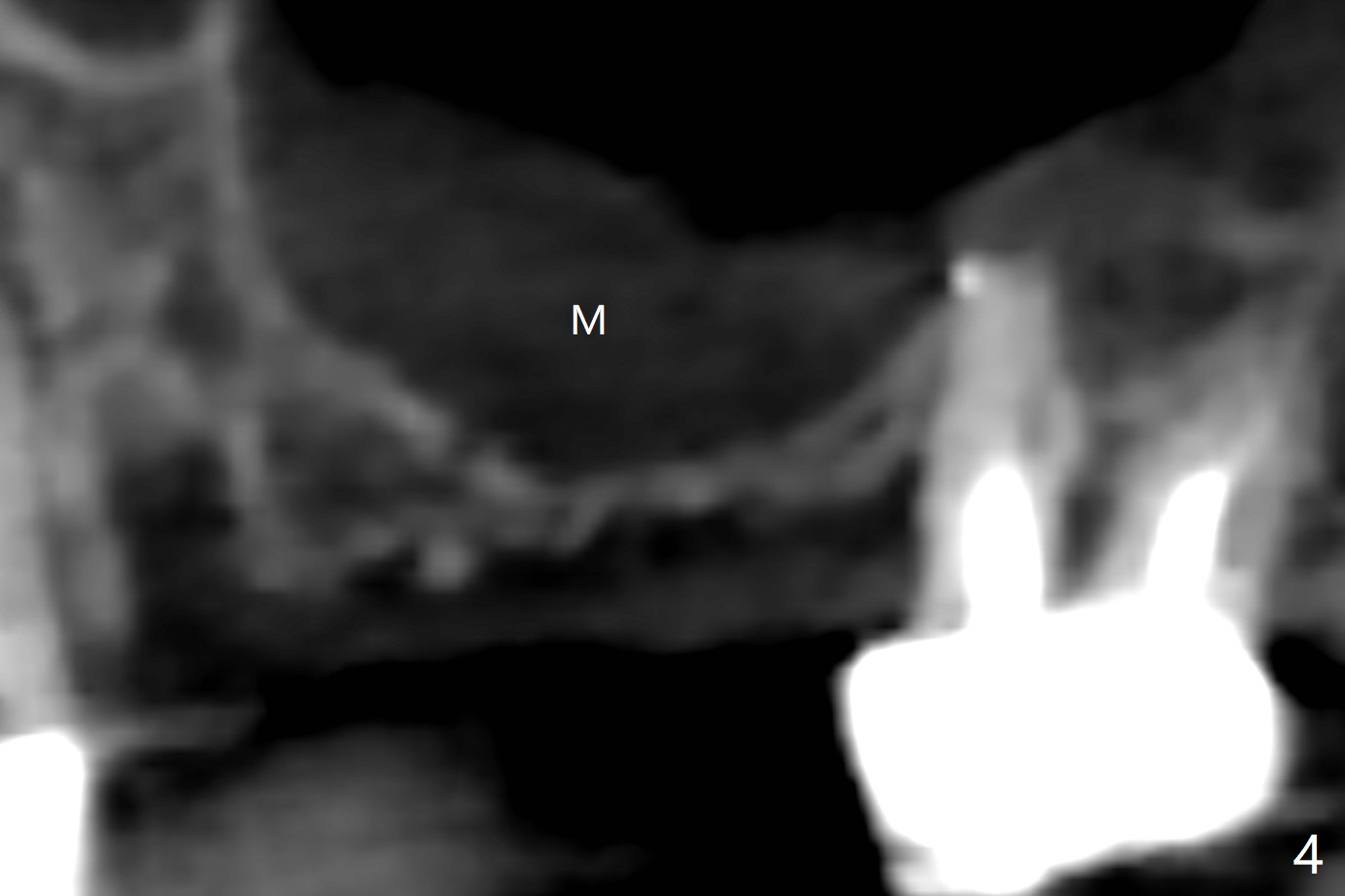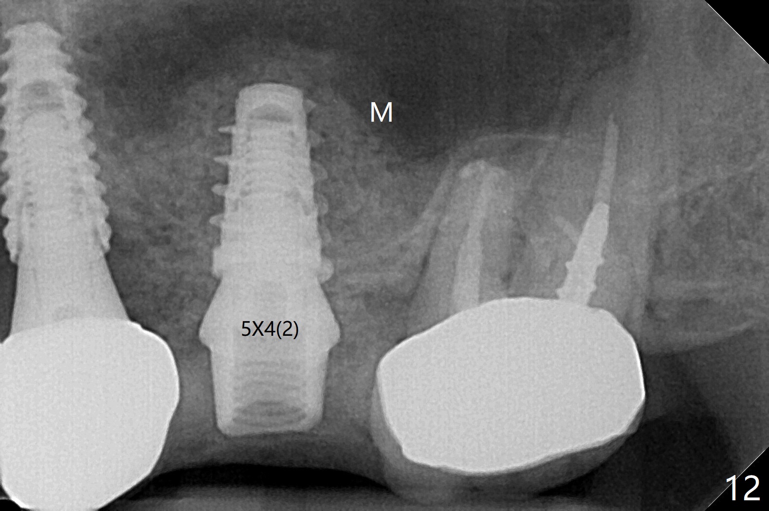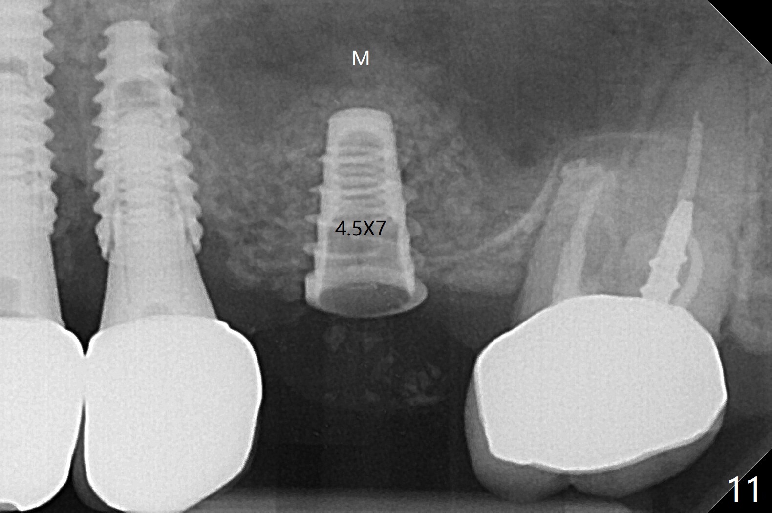 A 68-year-old timid woman is considering implant at #14 twenty months post cementation of #13 and 14 crown (Fig.1). Because of the narrow buccopalatal width (Fig.2 CT coronal section, B: buccal), a 4 mm implant (blue line) seems to be appropriate for the site (Fig.1). After crestal incision and flap reflection, a diamond round bur is used to thin the sinus floor until the bluish membrane is barely visible. An osteotome (Magic Sinus Lifter) is used for penetration. Water lift will be conducted if necessary, considering the already thickened sinus membrane (Fig.3 (CT sagittal section) M). Insert the first PRF membrane, followed by bone graft (not too sticky) repeatedly. Use sensor 1 to confirm lift degree. Try a 4x7 mm dummy FC to test stability. Place a definitive one (probably Magicore) if indicated. Use a second PRF membrane before closure of the wound. After nearly 15 month consideration (including coronovirus), the patient decides to get it done. With incision (Fig.4) and Marking Drill (Fig.5, the sinus membrane barely visible in the middle of the osteotomy (dimple, Fig.6 (black triangle)), the sinus floor does not break upon Magic Sinus Lifter). Later the patient complains of discomfort with tapping. In fact Magic Drill (similar to trephine bur, Fig.7) is used to break into the sinus without membrane perforation (Fig.8). Remember the thick membrane (Fig.2,3). In fact the fractured fragment is attached to the membrane (Fig.9 red lines, green sticky fracture). A small curette is used to further separate the membrane from the bony wall (Fig.10) before insertion of a small piece of PRF and sticky bone. When a 4.5x7 mm dummy implant is incompletely placed with stability (<10 Ncm), the membrane is stretched over the bone graft (Fig.11 M). After removal of the dummy, the major remaining piece of PRF (from 9 cc vial) and more allograft are placed before inserting a definitive implant (same size) with 15 Ncm; still the used to be thick membrane remains intact and stretched (Fig.12 M). The implant is equicrestal buccal, while slightly supracrestal palatal. To prevent implant dislodgement into the sinus and bone graft, a final abutment is placed (Fig.12). The wound is closed with 4-0 PGA, perio glue and perio dressing. The latter dislodges 3 days postop. The wound seems to be healing. No dressing is reapplied.