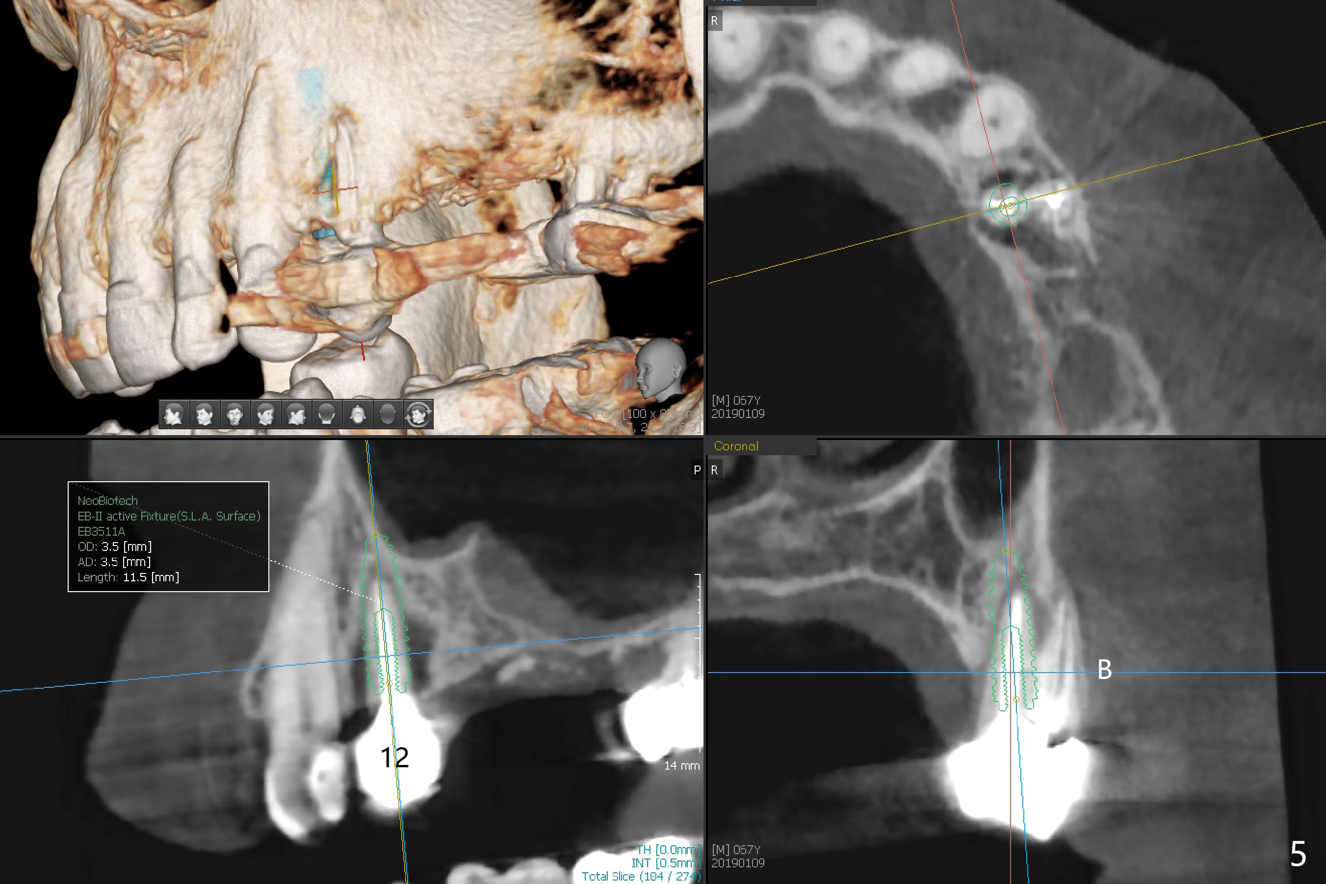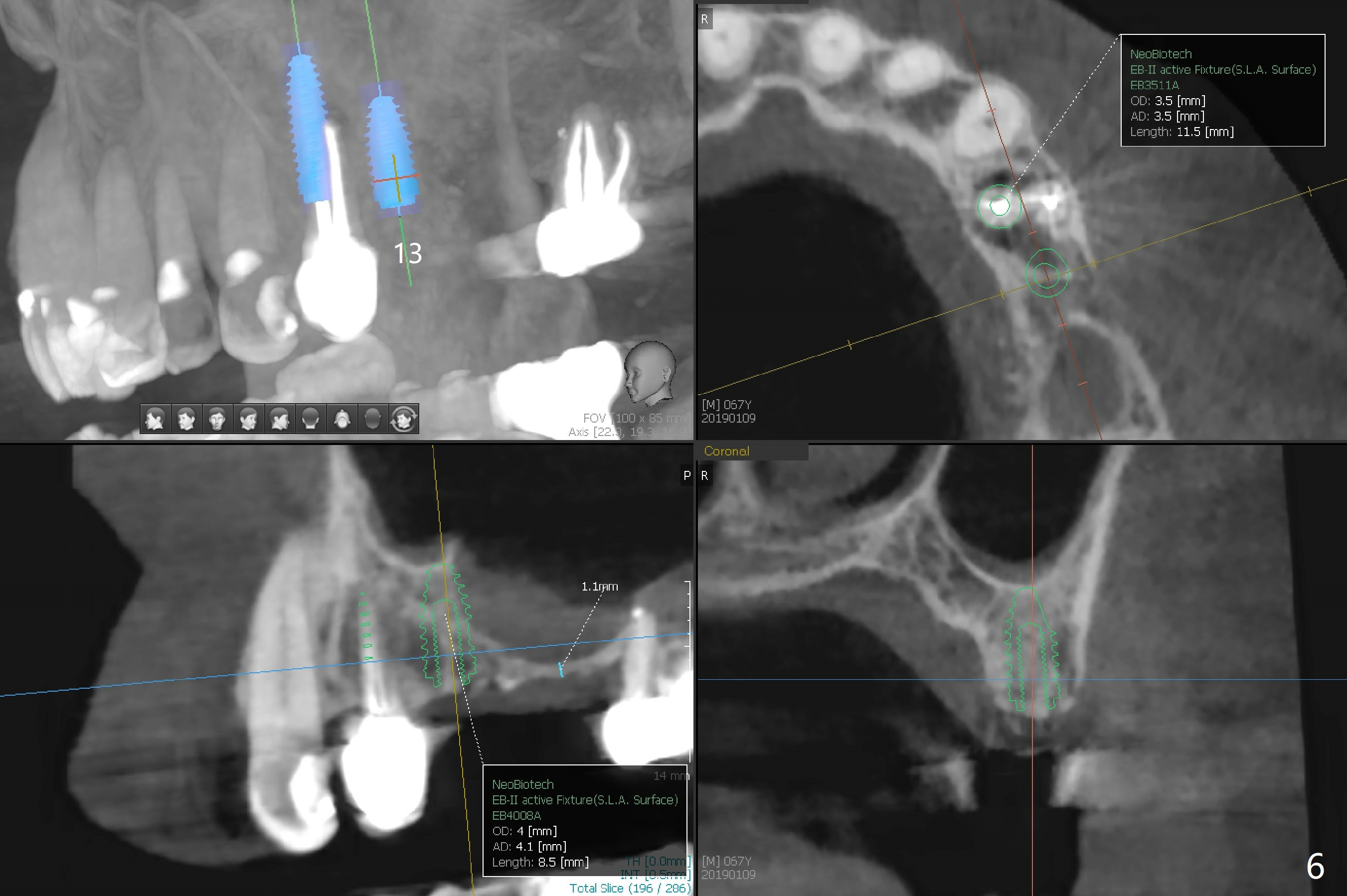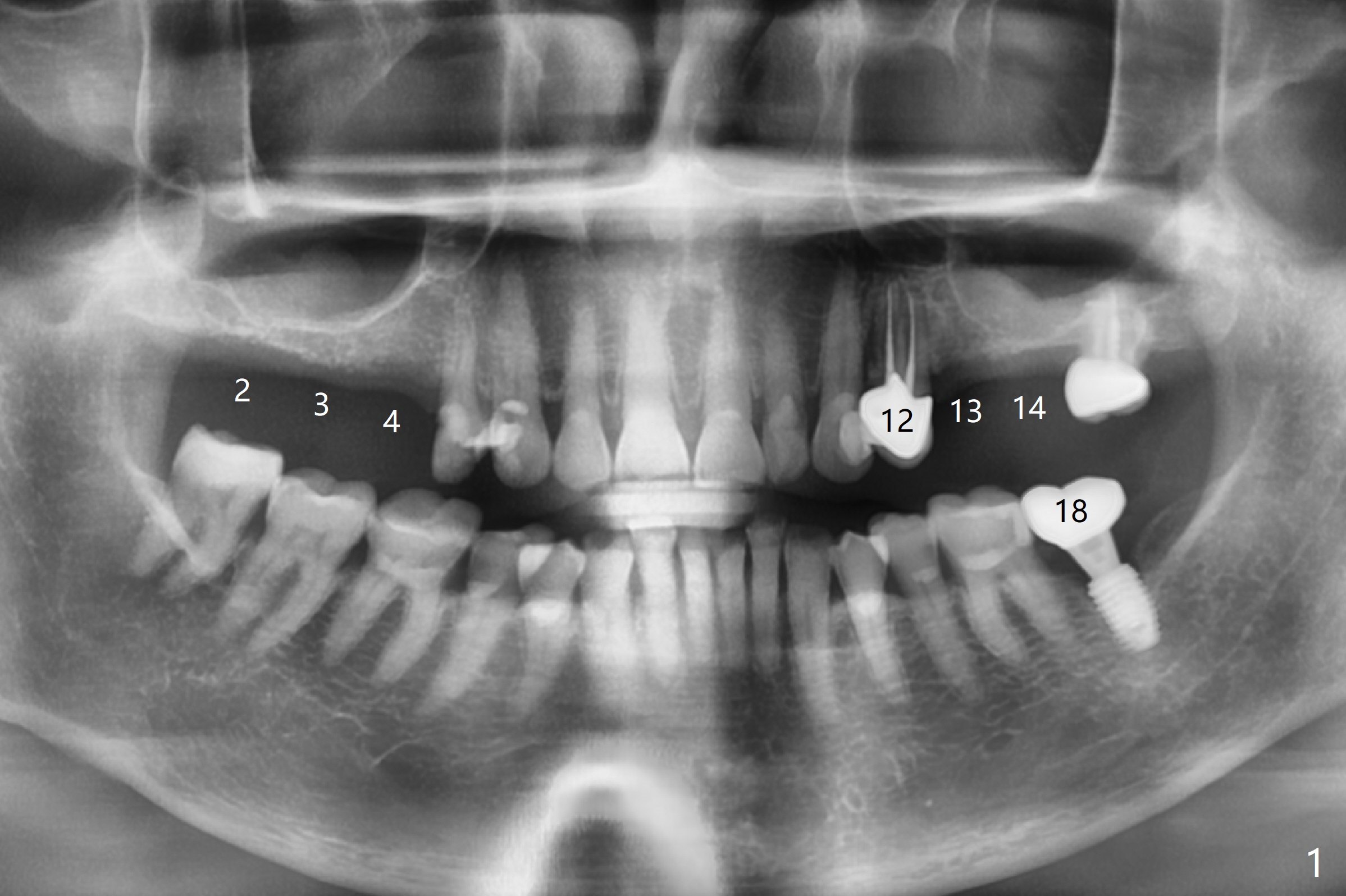 A 63-year-old woman wants to change upper RPD (for #2-4, 13 and 14) to implants because of denture-associated candidiasis. She is afraid of osteoporosis, although the implant at #18 is doing fine almost 3 months post cementation (Fig.1). One way to restore the upper right quadrant is to place 3 short implants (7.3 or 8.5 mm) with guide with simultaneous internal or external sinus lift (Fig.2-4). The tooth #12 appears to have root fracture with periradicular radiolucency (Fig.5); an immediate implant will be placed. While a short implant will be placed at #13, no implant will be placed at #14 because of 1 mm bone (Fig.6). A cantilever FPD will be fabricated in the upper left quadrant. The thick left sinus membrane is a problem as related to a lift?