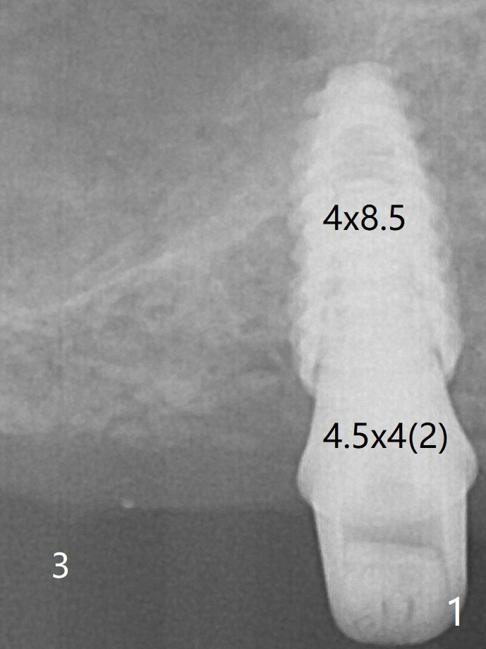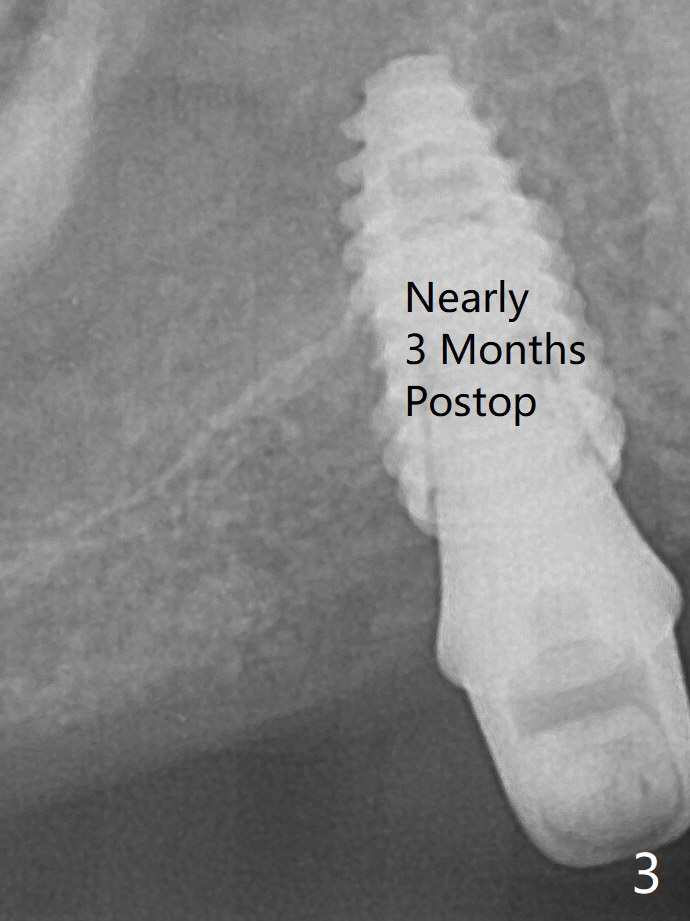 Osteotomy at #3 is performed last (Fig.1,2); as planned, a 4 mm cortical tap is used with guide for sinus lift. Unfortunately the sinus membrane is perforated. Implant placement is aborted. Instead Osteogen plug is inserted into the osteotomy, which is fixed in place by acrylic extending from the provisional at #4. Osteotomy for #3 implant will be attempted with control of the depth in 4 months. The patient has allergy to Amoxcillin (rash). When switching to Clindamycin, she develops diarrhea and loses 10 pounds. There is no abnormality at the site of #3 or 4 nearly 3 months postop (Fig.3). The next surgery will be most likely conducted without antibiotic.