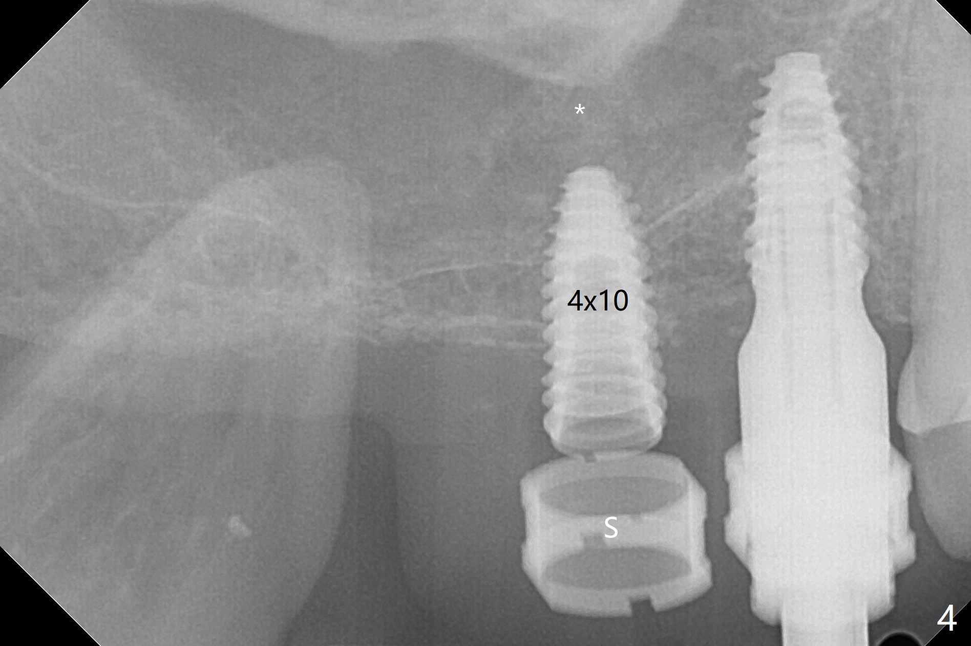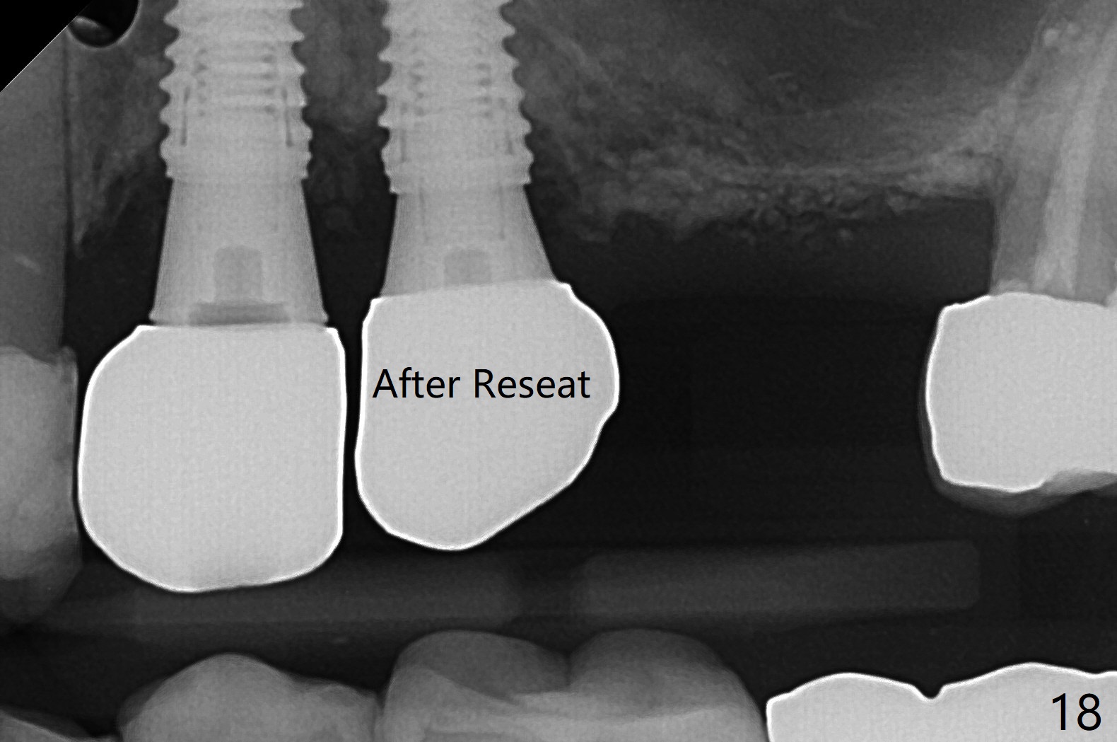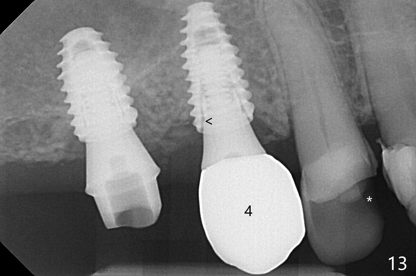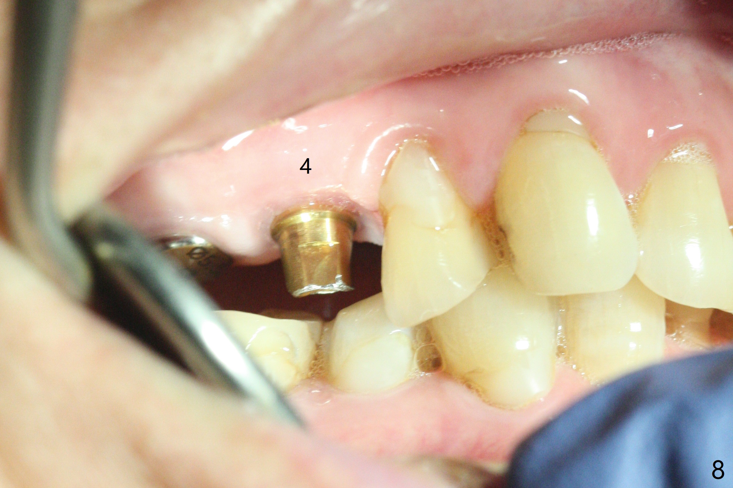 Osteotomy at #3 is performed last (Fig.1,2); as planned, a 4 mm cortical tap is used with guide for sinus lift. Unfortunately the sinus membrane is perforated. Implant placement is aborted. Instead Osteogen plug is inserted into the osteotomy, which is fixed in place by acrylic extending from the provisional at #4. Osteotomy for #3 implant will be attempted with control of the depth in 4 months. The patient has allergy to Amoxicillin (rash). When switching to Clindamycin, she develops diarrhea and loses 10 pounds. There is no abnormality at the site of #3 or 4 nearly 3 months postop (Fig.3). The next surgery will be most likely conducted without antibiotic 4 months postop. Try to draw blood for PRF. Take PA for #12 and 13 for possible impression. Remove the 3 temporary crowns, seat the guide across the arch and use no-stop fixture mounts at #4, and possibly 12 and 13. Follow the original drill sequence (check perforation after each drill, Fig.11) and use DIONavi sinus approach kit. Also load an appropriate stop for the round bur for sinus lift before hand. Mixture allograft with Metronidazole and PRF. In fact everything goes on as smoothly as planned. Osteotomy at #3 is underprep (3.5 mm in diameter drill instead of 4.0). The sinus floor appears to remain to be absent; 3.2 mm round bur is used for lift, alternating with water pumping. Following insertion of 3 pieces of PRF membranes and Vanilla Graft (Fig.4 *), a 4x10 mm dummy implant is placed. After additional bone graft (Fig.5 *), a final 4.5x7.3 mm implant is placed ~10 Ncm. The implant is placed deeper ~ 1 mm, followed by a 5.5x3 mm healing abutment (Fig.6). The implants at #12 and 13 seem to have osteointegrated (Fig.7). Impression is taken for #4, 12 and 13 with limited vertical space (Fig.8,9). An implant at #14 is being considered. There is faint bone graft around the apex of the implant 4 months postop (Fig.10). The implant sustains 25-30 Ncm torque when a 5.2x4(3) mm cemented abutment is placed. A permanent crown is cemented nearly 5 months postop (Fig.11). For the best cosmetic and masticating results, the occlusal surface should have certain degree of morphology, such as the buccal cusps (Fig.12 white curved lines). The abutment at #3 is placed and torqued to 30 Ncm before re-cementation of the repaired crown (increased occlusal surface contact). In fact the abutment at #4 is incompletely seated with a gap (Fig.13 <). The composite at #5 is dislodged while #3 crown is being repaired (*). The abutment at #4 is loose >1 year post cementation. The abutment remains incompletely seated (gap and longer apical space (double arrows)) when the abutment/crown complex rotates lingual mesiobuccal (Fig.14 curved arrow). Further proximal reduction and lingual rotation distobuccal leads to complete seating (Fig.15). It appears that incomplete seating at #13 is associated with hex mismatch (Fig.16, large apical space), which will be fixed next visit. One week later, the crown and abutment of #4 are seated together after crown repair (Fig.17). Since the abutment margin is subgingival, the crown is cemented, removed with abutment for residual cement removal and reseated with the abutment with torque at 30 Ncm. After this, the crown and abutment of #13 is reseated after mesiobuccal surface is trimmed (Fig.18), followed by pick up impression. A few days later, the crown/abutment are inserted together smoothly, the former cemented and the complex unscrewed for residual cement removal and last torqued at 30 Ncm without any X-ray confirmation.