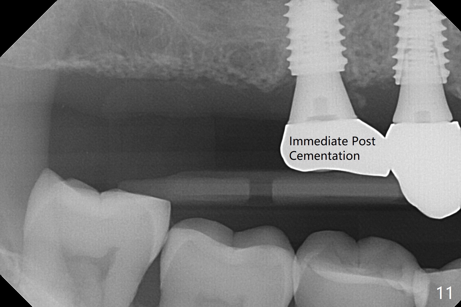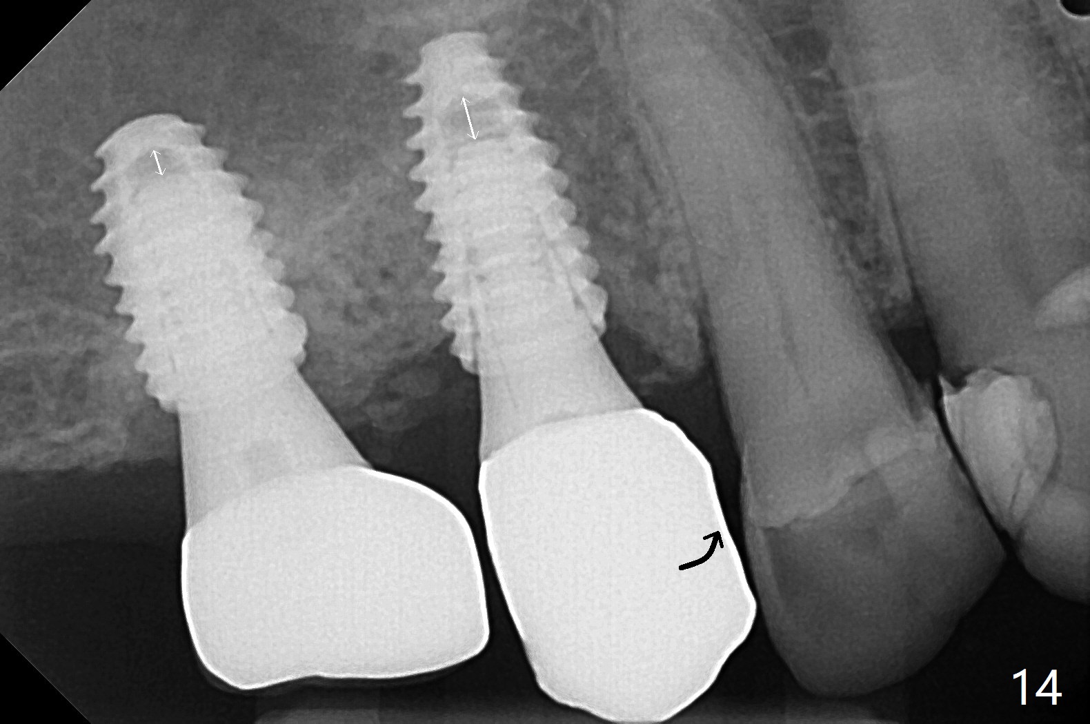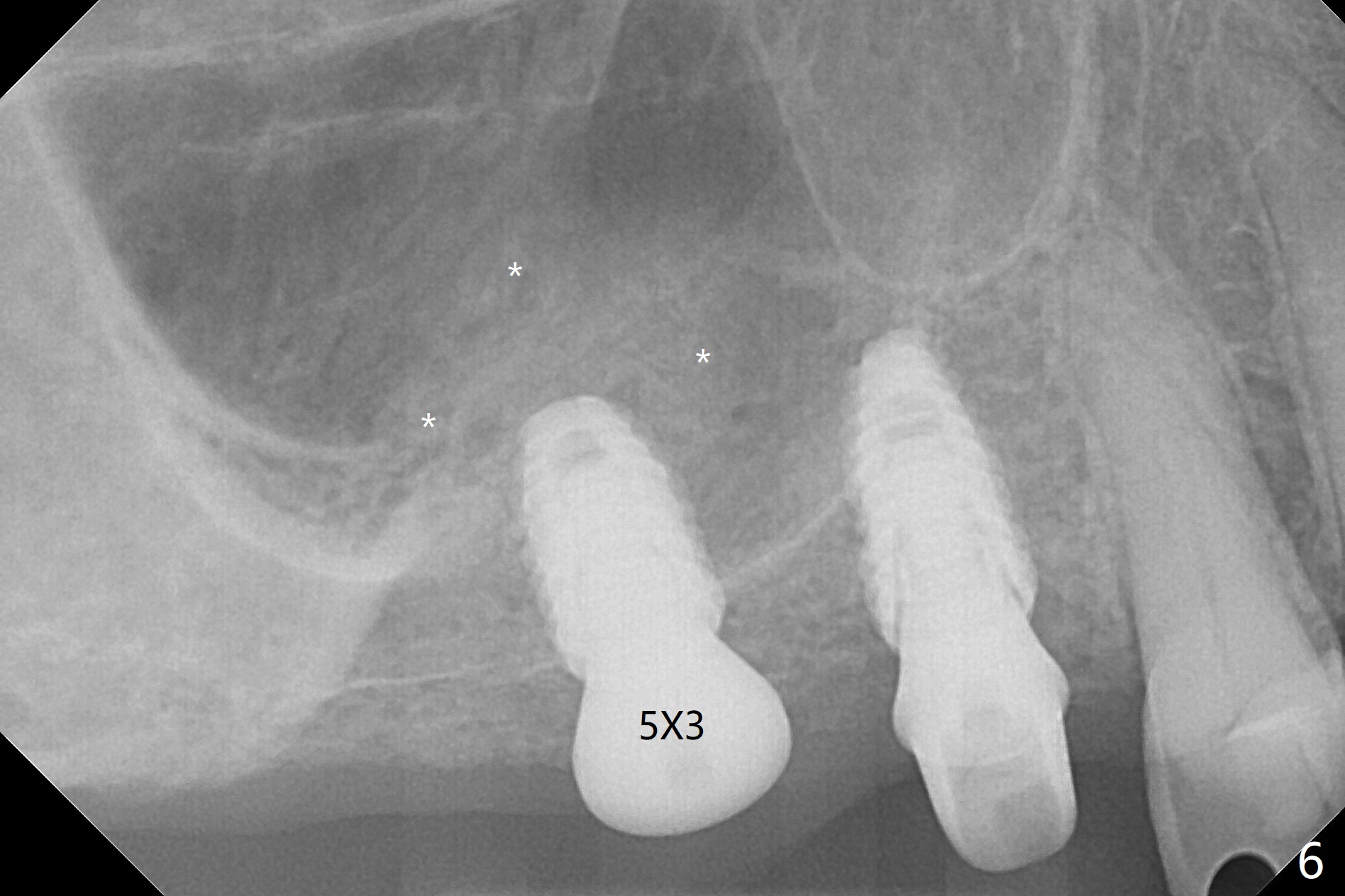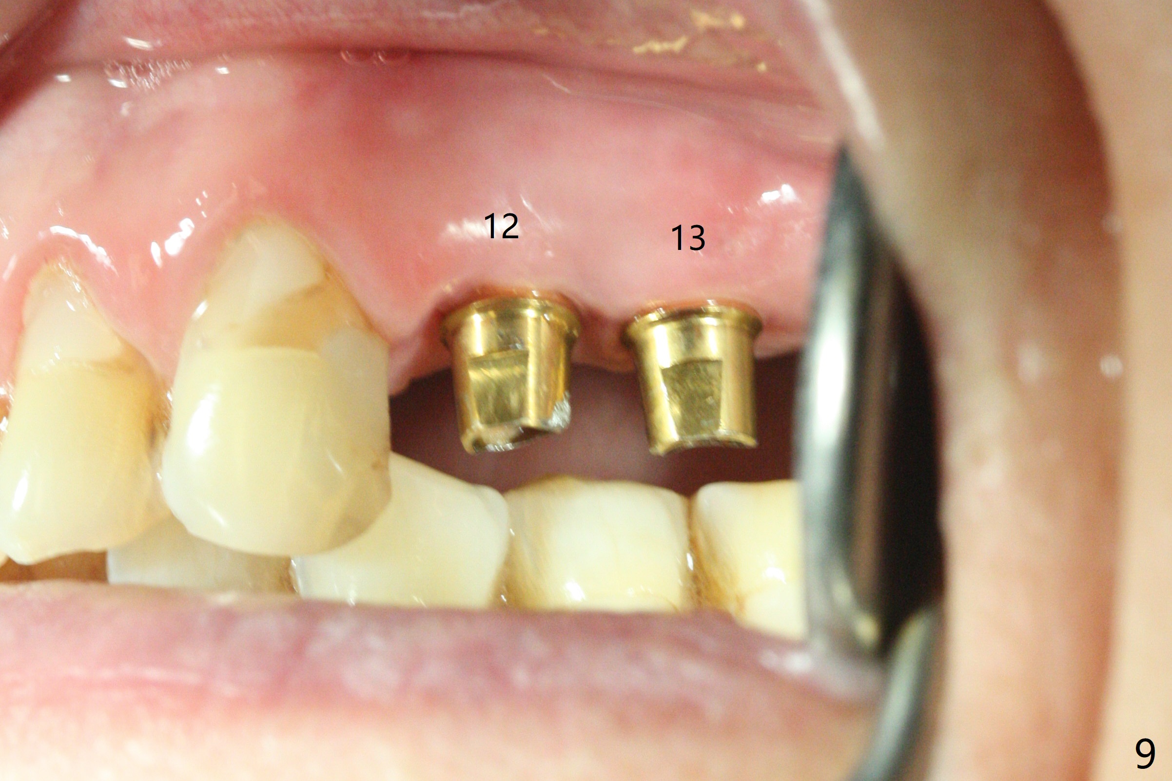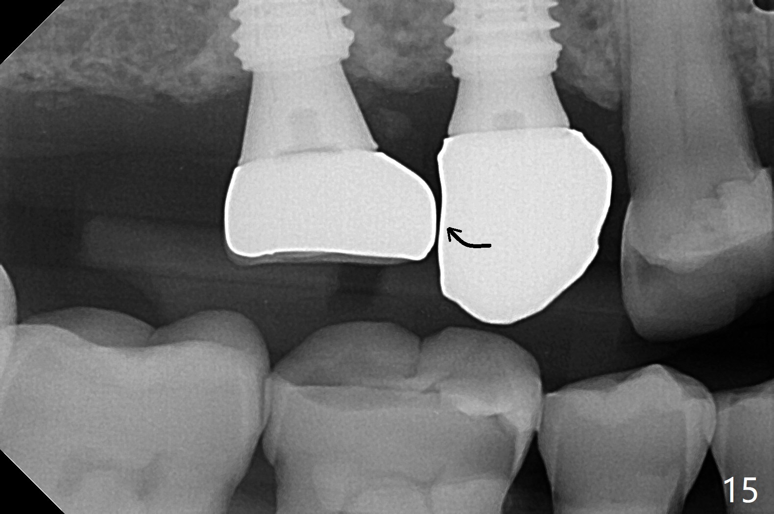 Osteotomy at #3 is performed last (Fig.1,2); as planned, a 4 mm cortical tap is used with guide for sinus lift. Unfortunately the sinus membrane is perforated. Implant placement is aborted. Instead Osteogen plug is inserted into the osteotomy, which is fixed in place by acrylic extending from the provisional at #4. Osteotomy for #3 implant will be attempted with control of the depth in 4 months. The patient has allergy to Amoxicillin (rash). When switching to Clindamycin, she develops diarrhea and loses 10 pounds. There is no abnormality at the site of #3 or 4 nearly 3 months postop (Fig.3). The next surgery will be most likely conducted without antibiotic 4 months postop. Try to draw blood for PRF. Take PA for #12 and 13 for possible impression. Remove the 3 temporary crowns, seat the guide across the arch and use no-stop fixture mounts at #4, and possibly 12 and 13. Follow the original drill sequence (check perforation after each drill, Fig.11) and use DIONavi sinus approach kit. Also load an appropriate stop for the round bur for sinus lift before hand. Mixture allograft with Metronidazole and PRF. In fact everything goes on as smoothly as planned. Osteotomy at #3 is underprep (3.5 mm in diameter drill instead of 4.0). The sinus floor appears to remain to be absent; 3.2 mm round bur is used for lift, alternating with water pumping. Following insertion of 3 pieces of PRF membranes and Vanilla Graft (Fig.4 *), a 4x10 mm dummy implant is placed. After additional bone graft (Fig.5 *), a final 4.5x7.3 mm implant is placed ~10 Ncm. The implant is placed deeper ~ 1 mm, followed by a 5.5x3 mm healing abutment (Fig.6). The implants at #12 and 13 seem to have osteointegrated (Fig.7). Impression is taken for #4, 12 and 13 with limited vertical space (Fig.8,9). An implant at #14 is being considered. There is faint bone graft around the apex of the implant 4 months postop (Fig.10). The implant sustains 25-30 Ncm torque when a 5.2x4(3) mm cemented abutment is placed. A permanent crown is cemented nearly 5 months postop (Fig.11). For the best cosmetic and masticating results, the occlusal surface should have certain degree of morphology, such as the buccal cusps (Fig.12 white curved lines). The abutment at #3 is placed and torqued to 30 Ncm before re-cementation of the repaired crown (increased occlusal surface contact). In fact the abutment at #4 is incompletely seated with a gap (Fig.13 <). The composite at #5 is dislodged while #3 crown is being repaired (*). The abutment at #4 is loose >1 year post cementation. The abutment remains incompletely seated (gap and longer apical space (double arrows)) when the abutment/crown complex rotates lingual mesiobuccal (Fig.14 curved arrow). Further proximal reduction and lingual rotation distobuccal leads to complete seating (Fig.15). It appears that incomplete seating at #13 is associated with hex mismatch (Fig.16, large apical space), which will be fixed next visit. One week later, the crown and abutment of #4 are seated together after crown repair (Fig.17). Since the abutment margin is subgingival, the crown is cemented, removed with abutment for residual cement removal and reseated with the abutment with torque at 30 Ncm. After this, the crown and abutment of #13 is reseated after mesiobuccal surface is trimmed (Fig.18), followed by pick up impression. A few days later, the crown/abutment are inserted together smoothly, the former cemented and the complex unscrewed for residual cement removal and last torqued at 30 Ncm without any X-ray confirmation.