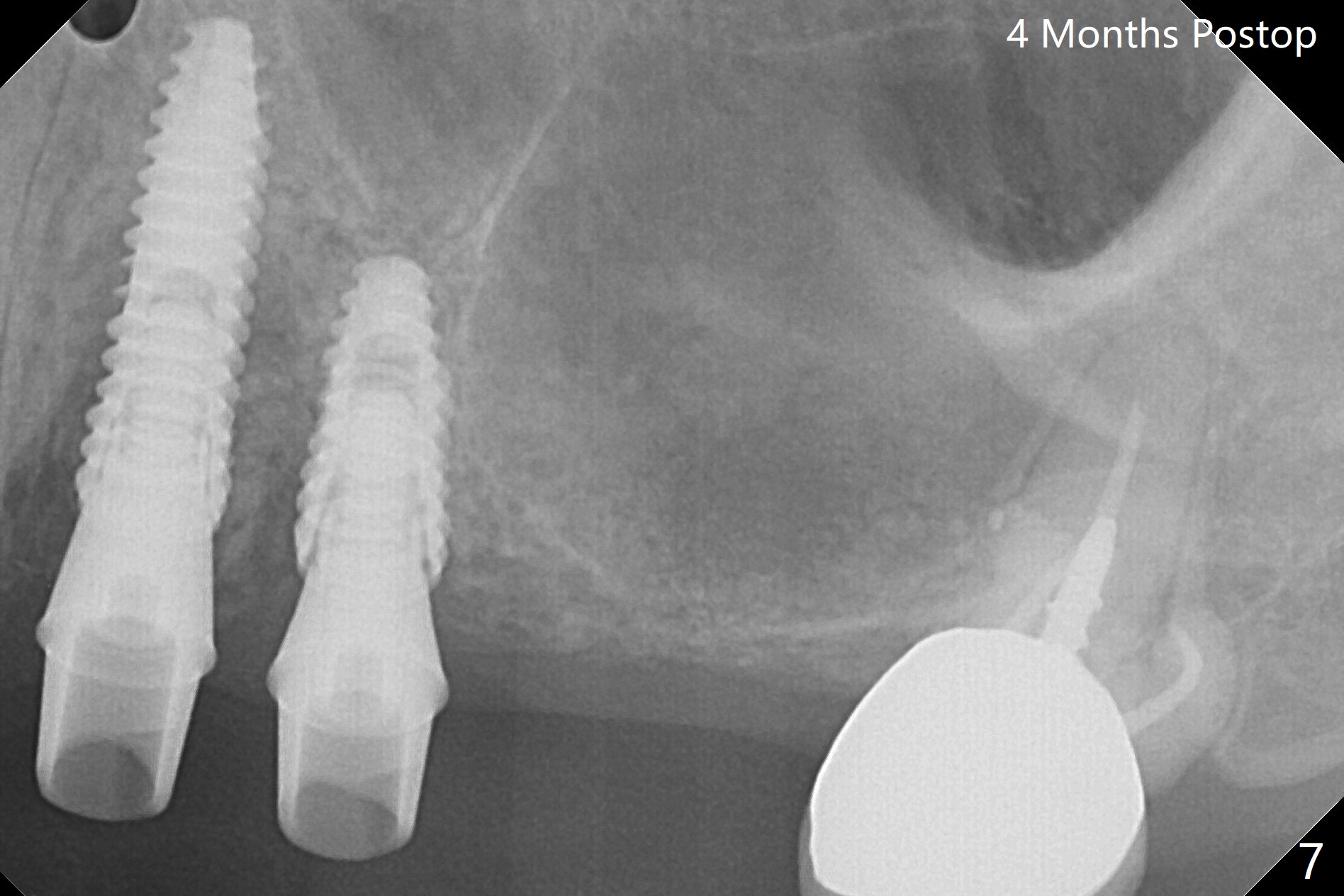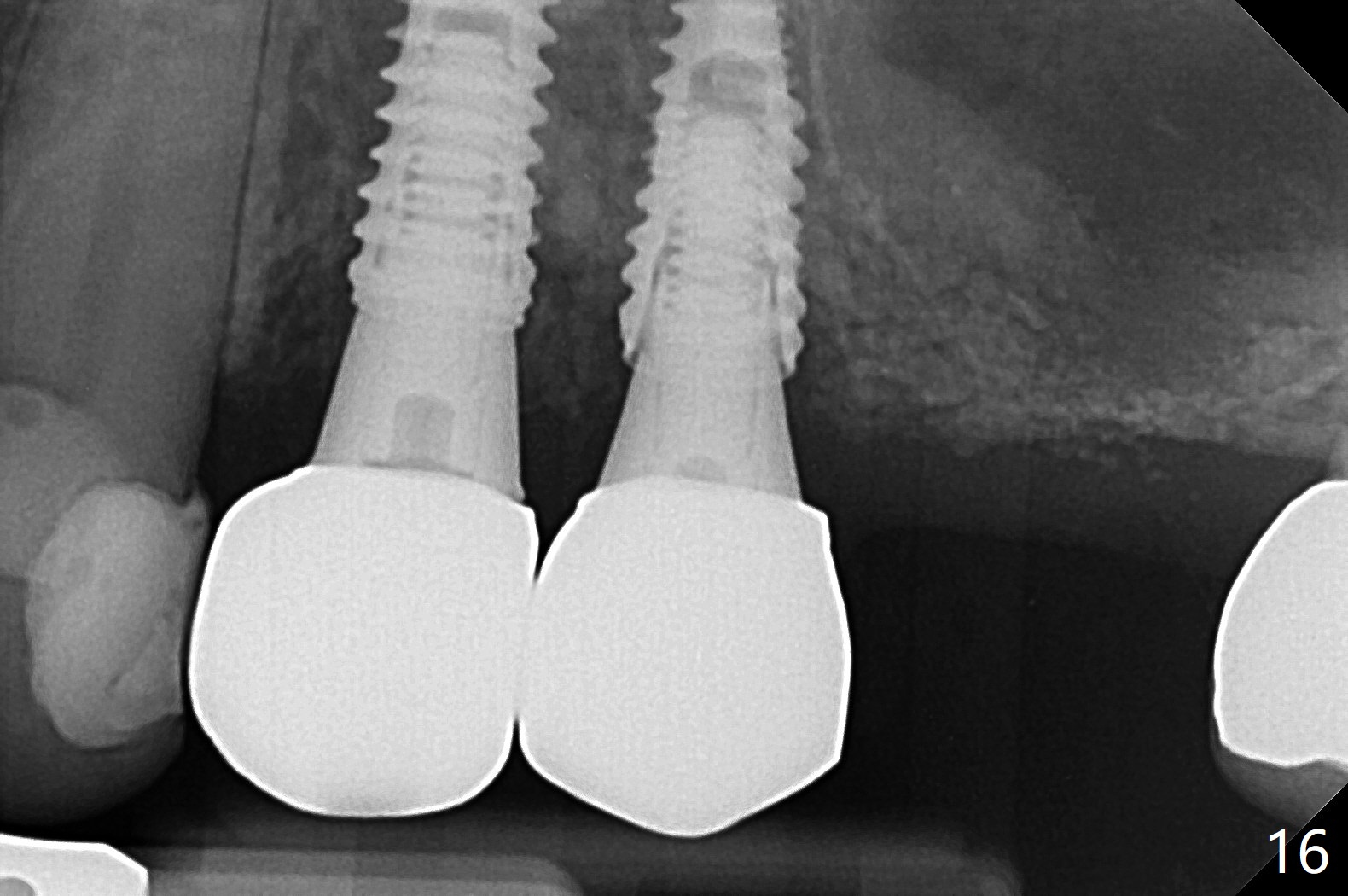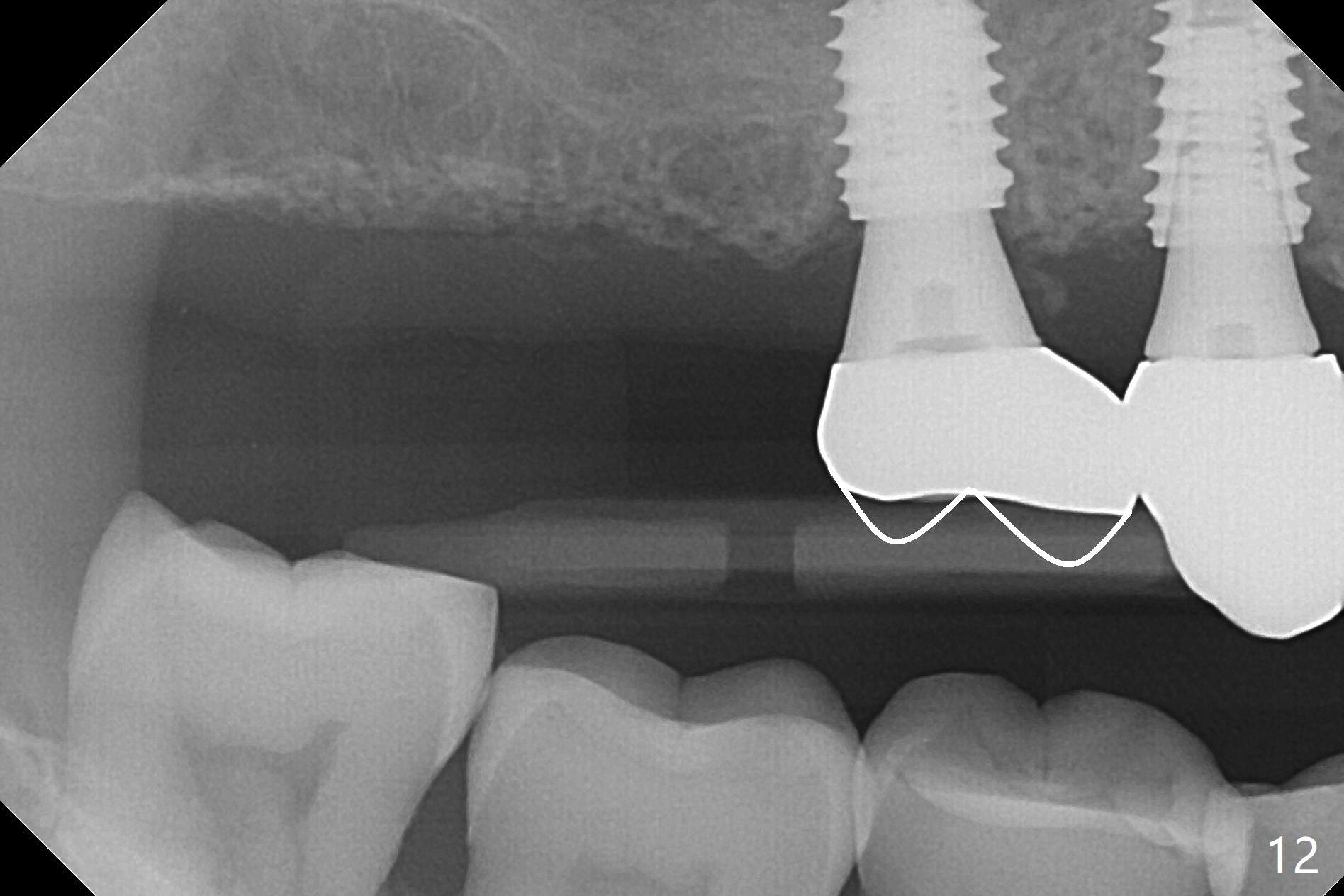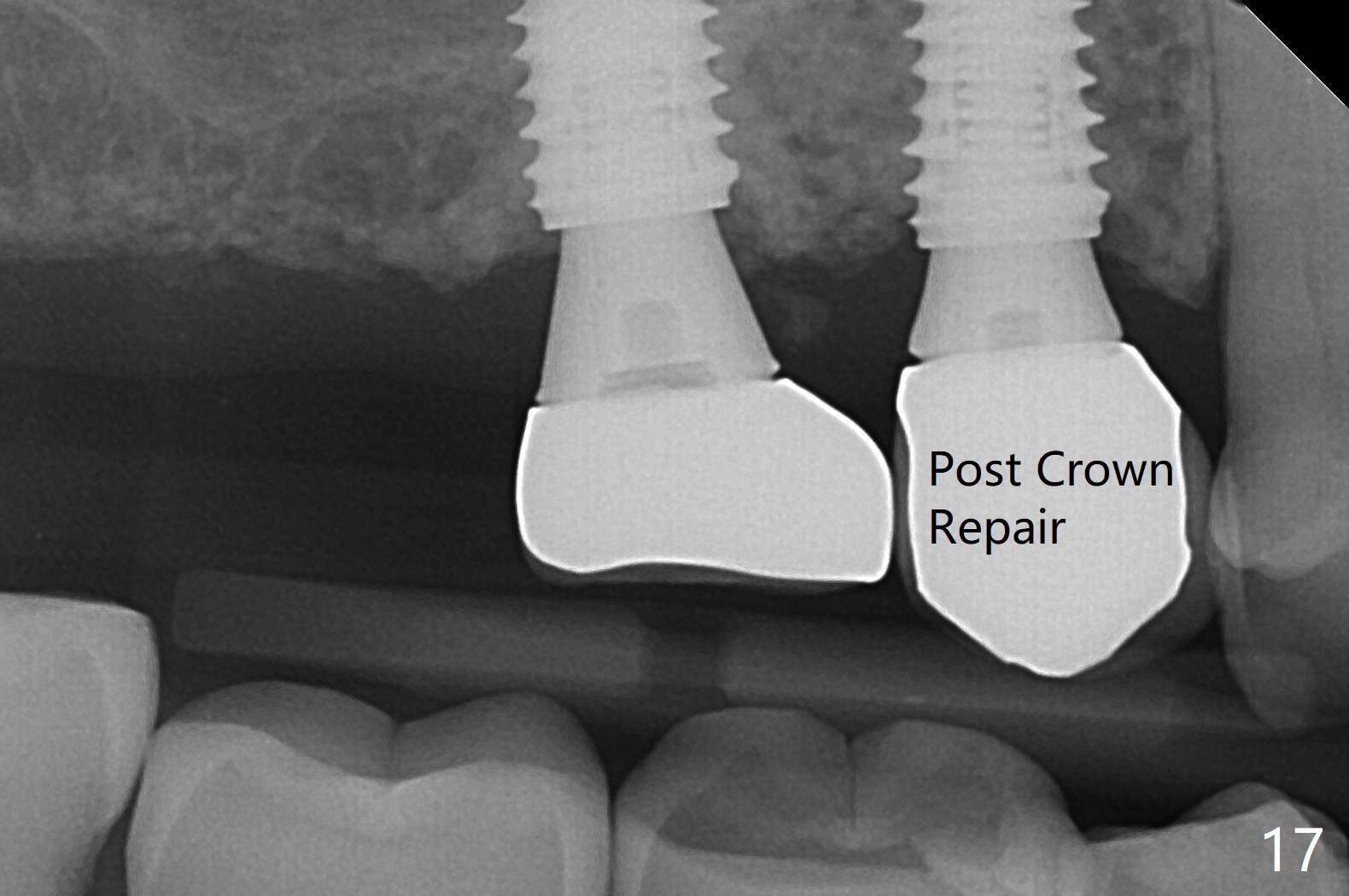 Osteotomy at #3 is performed last (Fig.1,2); as planned, a 4 mm cortical tap is used with guide for sinus lift. Unfortunately the sinus membrane is perforated. Implant placement is aborted. Instead Osteogen plug is inserted into the osteotomy, which is fixed in place by acrylic extending from the provisional at #4. Osteotomy for #3 implant will be attempted with control of the depth in 4 months. The patient has allergy to Amoxicillin (rash). When switching to Clindamycin, she develops diarrhea and loses 10 pounds. There is no abnormality at the site of #3 or 4 nearly 3 months postop (Fig.3). The next surgery will be most likely conducted without antibiotic 4 months postop. Try to draw blood for PRF. Take PA for #12 and 13 for possible impression. Remove the 3 temporary crowns, seat the guide across the arch and use no-stop fixture mounts at #4, and possibly 12 and 13. Follow the original drill sequence (check perforation after each drill, Fig.11) and use DIONavi sinus approach kit. Also load an appropriate stop for the round bur for sinus lift before hand. Mixture allograft with Metronidazole and PRF. In fact everything goes on as smoothly as planned. Osteotomy at #3 is underprep (3.5 mm in diameter drill instead of 4.0). The sinus floor appears to remain to be absent; 3.2 mm round bur is used for lift, alternating with water pumping. Following insertion of 3 pieces of PRF membranes and Vanilla Graft (Fig.4 *), a 4x10 mm dummy implant is placed. After additional bone graft (Fig.5 *), a final 4.5x7.3 mm implant is placed ~10 Ncm. The implant is placed deeper ~ 1 mm, followed by a 5.5x3 mm healing abutment (Fig.6). The implants at #12 and 13 seem to have osteointegrated (Fig.7). Impression is taken for #4, 12 and 13 with limited vertical space (Fig.8,9). An implant at #14 is being considered. There is faint bone graft around the apex of the implant 4 months postop (Fig.10). The implant sustains 25-30 Ncm torque when a 5.2x4(3) mm cemented abutment is placed. A permanent crown is cemented nearly 5 months postop (Fig.11). For the best cosmetic and masticating results, the occlusal surface should have certain degree of morphology, such as the buccal cusps (Fig.12 white curved lines). The abutment at #3 is placed and torqued to 30 Ncm before re-cementation of the repaired crown (increased occlusal surface contact). In fact the abutment at #4 is incompletely seated with a gap (Fig.13 <). The composite at #5 is dislodged while #3 crown is being repaired (*). The abutment at #4 is loose >1 year post cementation. The abutment remains incompletely seated (gap and longer apical space (double arrows)) when the abutment/crown complex rotates lingual mesiobuccal (Fig.14 curved arrow). Further proximal reduction and lingual rotation distobuccal leads to complete seating (Fig.15). It appears that incomplete seating at #13 is associated with hex mismatch (Fig.16, large apical space), which will be fixed next visit. One week later, the crown and abutment of #4 are seated together after crown repair (Fig.17). Since the abutment margin is subgingival, the crown is cemented, removed with abutment for residual cement removal and reseated with the abutment with torque at 30 Ncm. After this, the crown and abutment of #13 is reseated after mesiobuccal surface is trimmed (Fig.18), followed by pick up impression. A few days later, the crown/abutment are inserted together smoothly, the former cemented and the complex unscrewed for residual cement removal and last torqued at 30 Ncm without any X-ray confirmation.