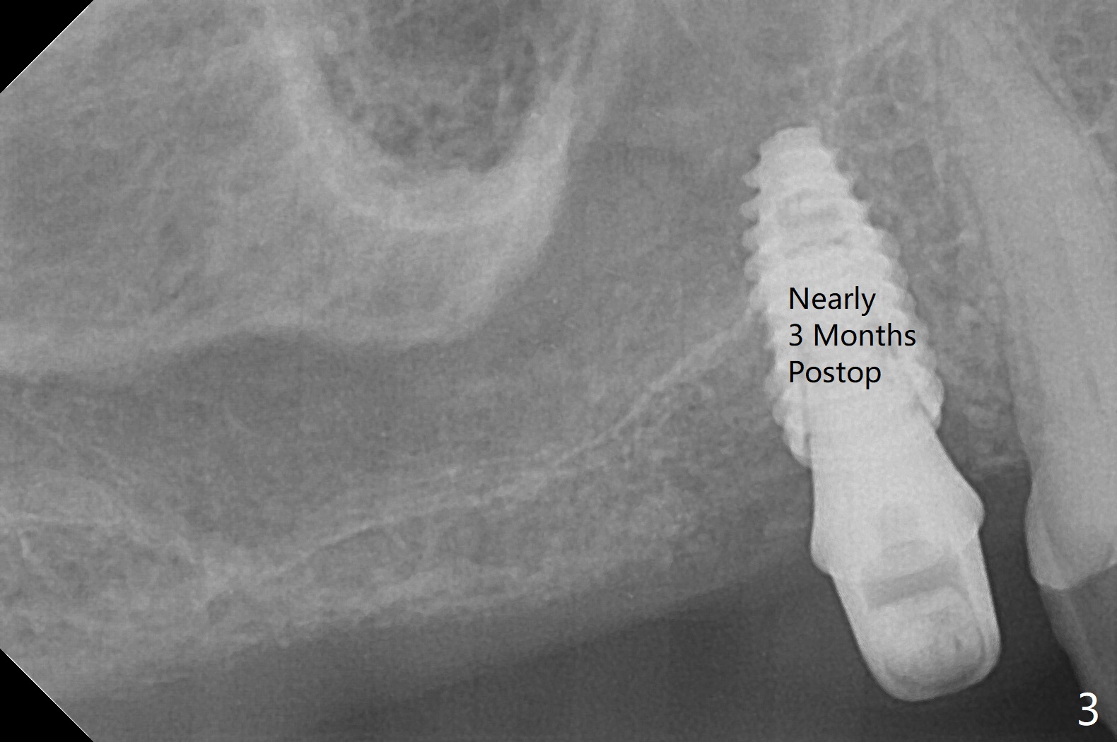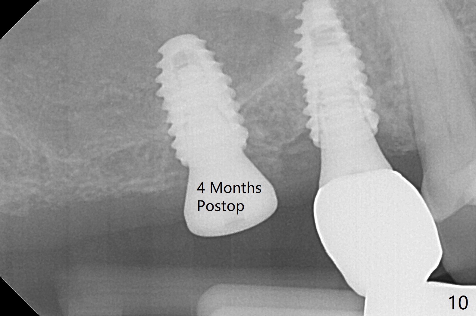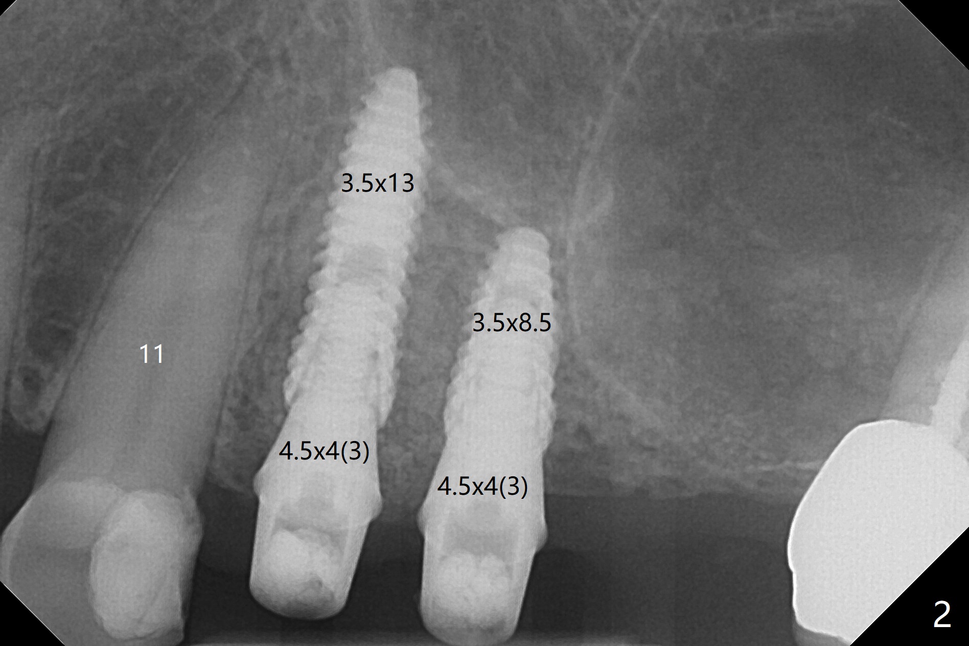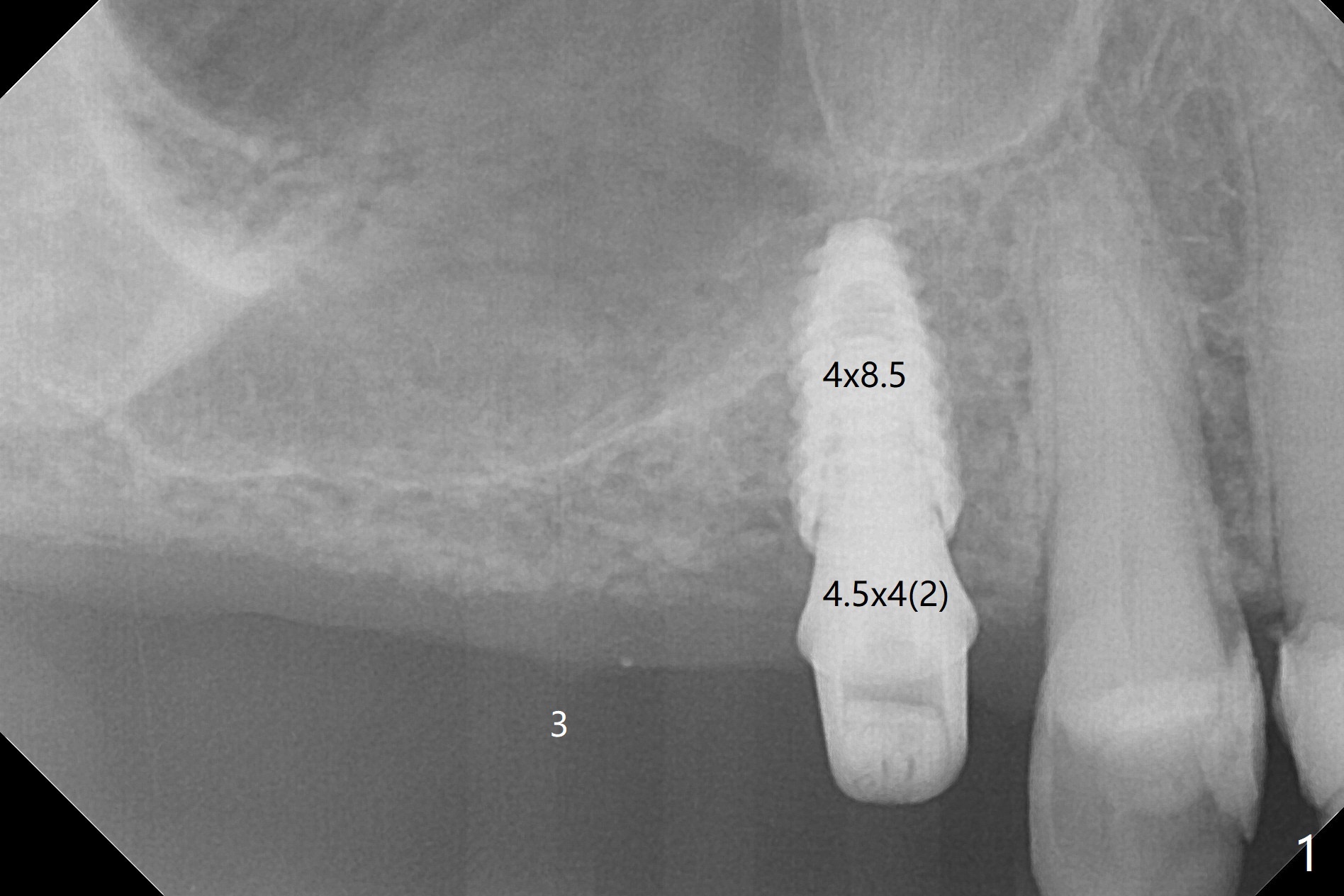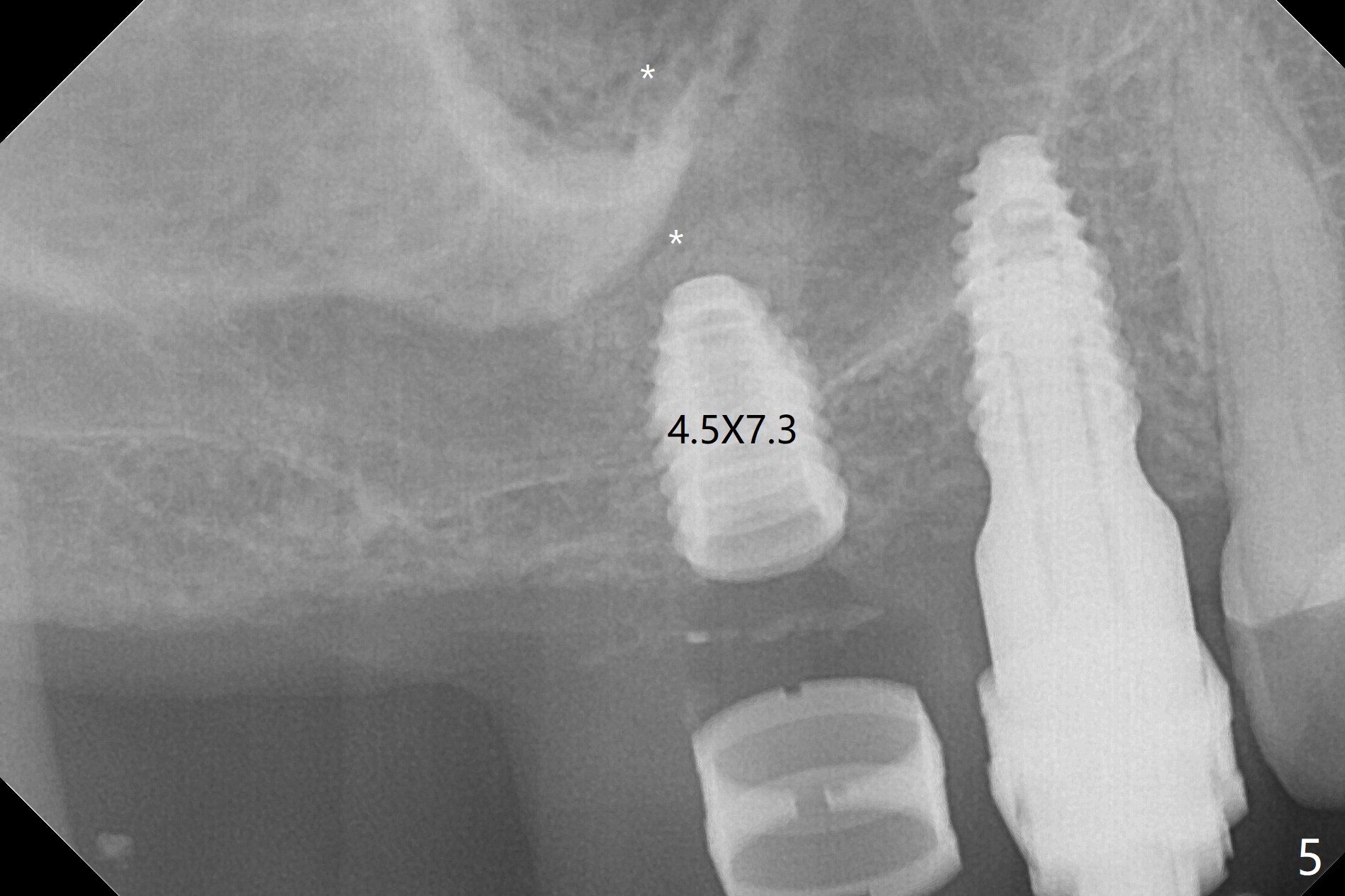 Osteotomy at #3 is performed last (Fig.1,2); as planned, a 4 mm cortical tap is used with guide for sinus lift. Unfortunately the sinus membrane is perforated. Implant placement is aborted. Instead Osteogen plug is inserted into the osteotomy, which is fixed in place by acrylic extending from the provisional at #4. Osteotomy for #3 implant will be attempted with control of the depth in 4 months. The patient has allergy to Amoxicillin (rash). When switching to Clindamycin, she develops diarrhea and loses 10 pounds. There is no abnormality at the site of #3 or 4 nearly 3 months postop (Fig.3). The next surgery will be most likely conducted without antibiotic 4 months postop. Try to draw blood for PRF. Take PA for #12 and 13 for possible impression. Remove the 3 temporary crowns, seat the guide across the arch and use no-stop fixture mounts at #4, and possibly 12 and 13. Follow the original drill sequence (check perforation after each drill, Fig.11) and use DIONavi sinus approach kit. Also load an appropriate stop for the round bur for sinus lift before hand. Mixture allograft with Metronidazole and PRF. In fact everything goes on as smoothly as planned. Osteotomy at #3 is underprep (3.5 mm in diameter drill instead of 4.0). The sinus floor appears to remain to be absent; 3.2 mm round bur is used for lift, alternating with water pumping. Following insertion of 3 pieces of PRF membranes and Vanilla Graft (Fig.4 *), a 4x10 mm dummy implant is placed. After additional bone graft (Fig.5 *), a final 4.5x7.3 mm implant is placed ~10 Ncm. The implant is placed deeper ~ 1 mm, followed by a 5.5x3 mm healing abutment (Fig.6). The implants at #12 and 13 seem to have osteointegrated (Fig.7). Impression is taken for #4, 12 and 13 with limited vertical space (Fig.8,9). An implant at #14 is being considered. There is faint bone graft around the apex of the implant 4 months postop (Fig.10). The implant sustains 25-30 Ncm torque when a 5.2x4(3) mm cemented abutment is placed. A permanent crown is cemented nearly 5 months postop (Fig.11). For the best cosmetic and masticating results, the occlusal surface should have certain degree of morphology, such as the buccal cusps (Fig.12 white curved lines). The abutment at #3 is placed and torqued to 30 Ncm before re-cementation of the repaired crown (increased occlusal surface contact). In fact the abutment at #4 is incompletely seated with a gap (Fig.13 <). The composite at #5 is dislodged while #3 crown is being repaired (*). The abutment at #4 is loose >1 year post cementation. The abutment remains incompletely seated (gap and longer apical space (double arrows)) when the abutment/crown complex rotates lingual mesiobuccal (Fig.14 curved arrow). Further proximal reduction and lingual rotation distobuccal leads to complete seating (Fig.15). It appears that incomplete seating at #13 is associated with hex mismatch (Fig.16, large apical space), which will be fixed next visit. One week later, the crown and abutment of #4 are seated together after crown repair (Fig.17). Since the abutment margin is subgingival, the crown is cemented, removed with abutment for residual cement removal and reseated with the abutment with torque at 30 Ncm. After this, the crown and abutment of #13 is reseated after mesiobuccal surface is trimmed (Fig.18), followed by pick up impression. A few days later, the crown/abutment are inserted together smoothly, the former cemented and the complex unscrewed for residual cement removal and last torqued at 30 Ncm without any X-ray confirmation.
