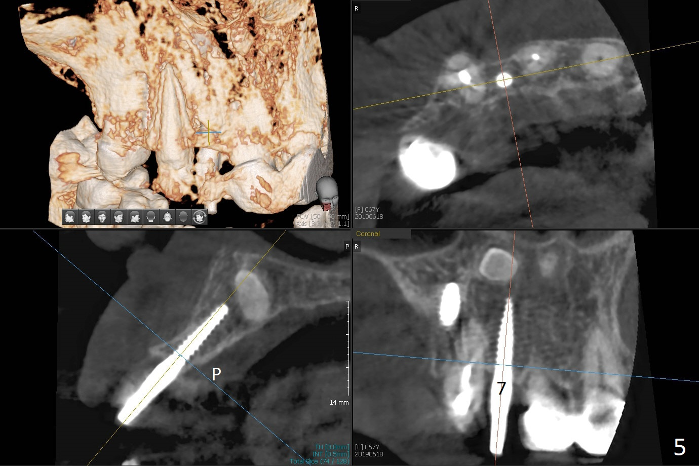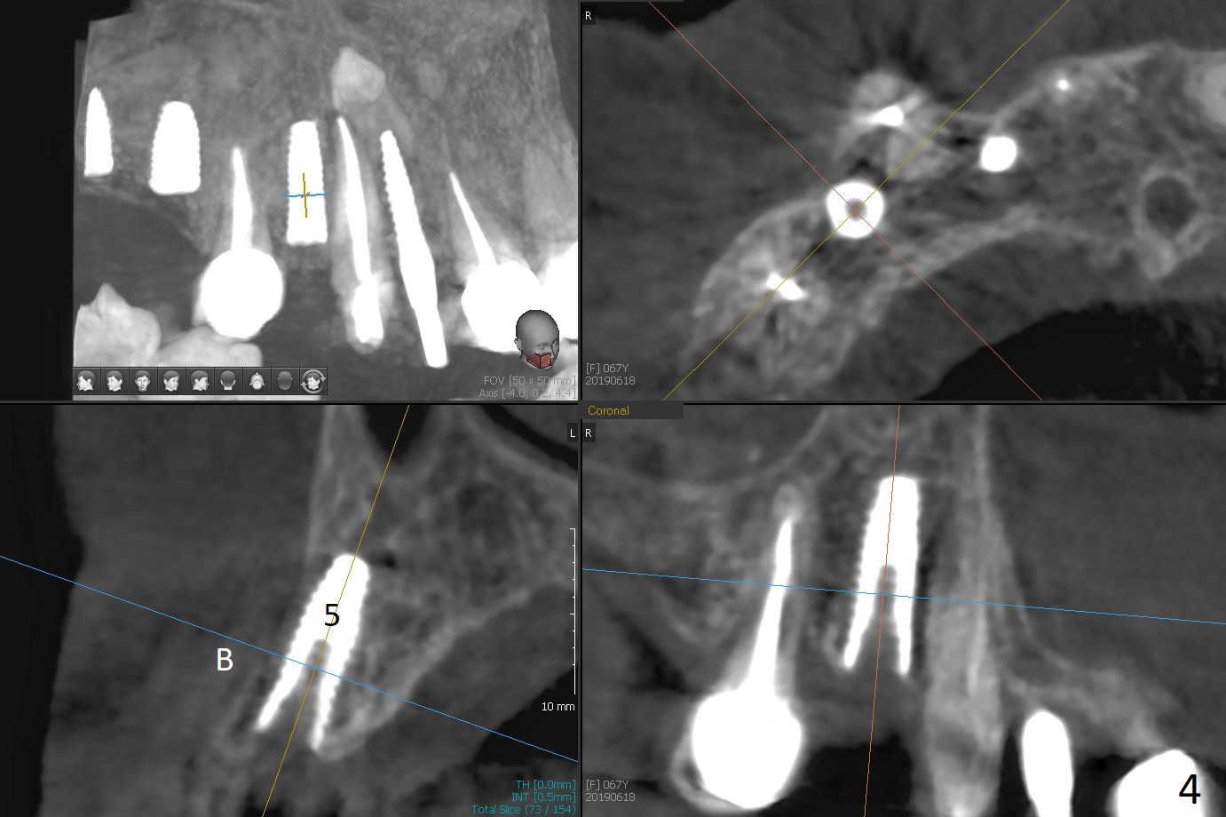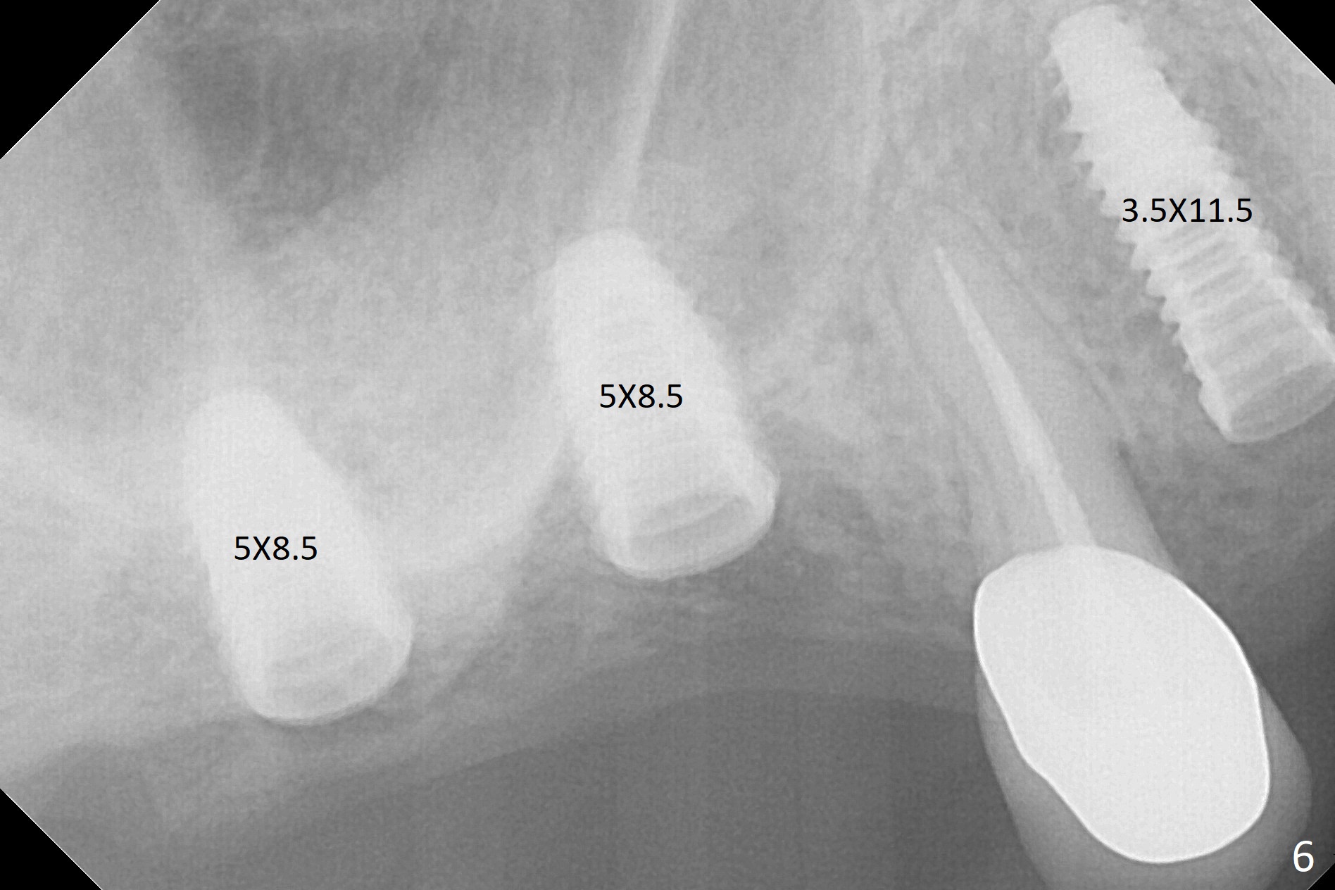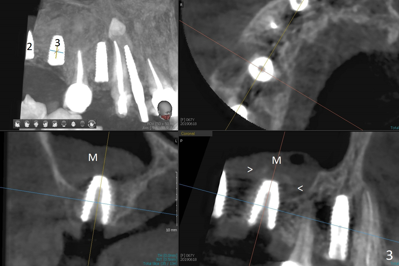 Two of 5x8.5 mm implants are placed at #2 and 3 with sinus lift using water ballooning technique; to avoid invading the neighboring root tips, an intraop PA is taken with a 2.2x11.5 mm drill at #5 (Fig.1). When a 2.5x11.5 mm 1-piece implant is placed at #7, there is 2.4 mm clearance from the impacted tooth (Fig.2). Following 1 mm deeper placement of the 1-piece implant, CT is taken to make sure that the threads are completely covered palatally (Fig.5 P). Interesting is that the sinus membrane is thickened at #2 and 3 (Fig.3 M), as compared to the clear sinus before surgery (Fig.3'). Bone graft is limited in the sinus (Fig.3 arrowheads). The implant at #5 (3.5x11.5 mm) is precisely placed subcrest bucco(B)-palatally (Fig.4). Since the limited field viewed CT does not cover the implant at #2 (Fig.3), immediate postop PA is taken (Fig.6). In fact all of the implants are placed subcrestal, as shown by intraoral X-ray 4 months postop (Fig.7-9). The abutments at #2, 3 and 5 are retorqued (30 Ncm) after crowns' try in and adjustment (Fig.10,11). There is a vertical gap between the implant and abutment at #2 (Fig.11 ^) and a horizontal one at #5 (<). There is apparently no bone loss 1 year 5 months post cementation (Fig.12).