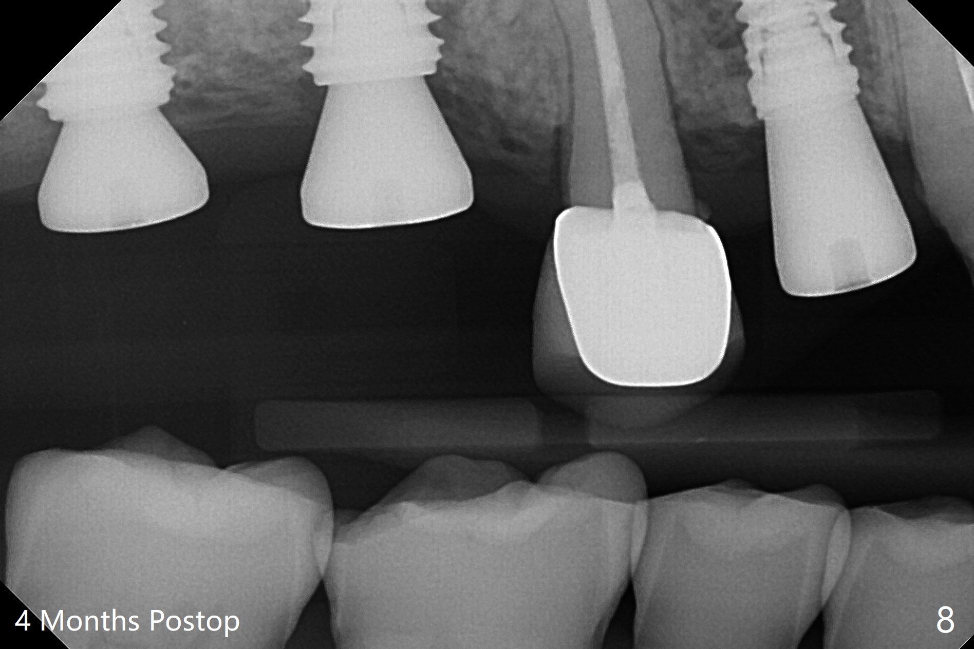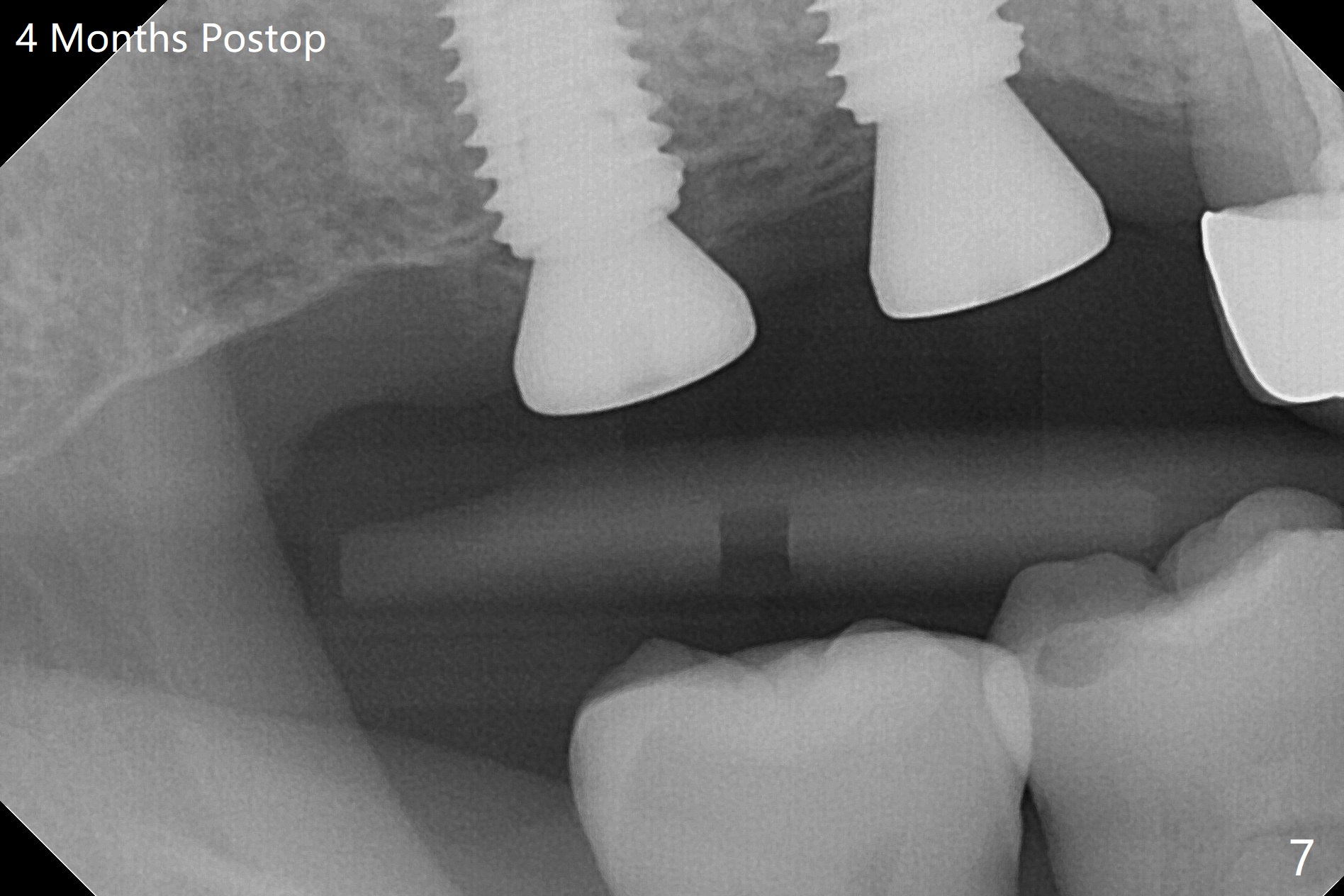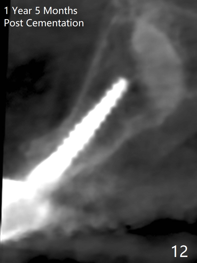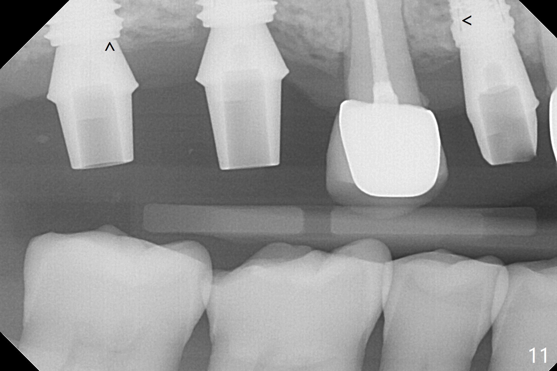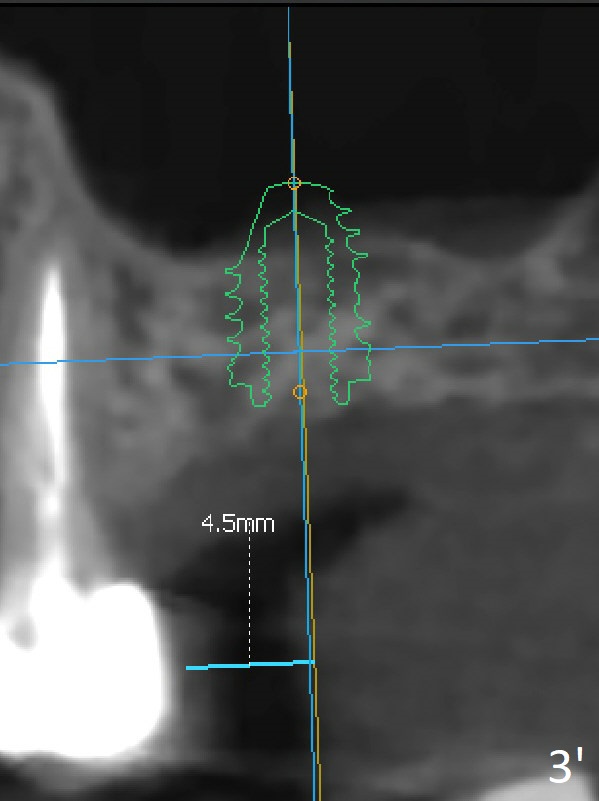 Two of 5x8.5 mm implants are placed at #2 and 3 with sinus lift using water ballooning technique; to avoid invading the neighboring root tips, an intraop PA is taken with a 2.2x11.5 mm drill at #5 (Fig.1). When a 2.5x11.5 mm 1-piece implant is placed at #7, there is 2.4 mm clearance from the impacted tooth (Fig.2). Following 1 mm deeper placement of the 1-piece implant, CT is taken to make sure that the threads are completely covered palatally (Fig.5 P). Interesting is that the sinus membrane is thickened at #2 and 3 (Fig.3 M), as compared to the clear sinus before surgery (Fig.3'). Bone graft is limited in the sinus (Fig.3 arrowheads). The implant at #5 (3.5x11.5 mm) is precisely placed subcrest bucco(B)-palatally (Fig.4). Since the limited field viewed CT does not cover the implant at #2 (Fig.3), immediate postop PA is taken (Fig.6). In fact all of the implants are placed subcrestal, as shown by intraoral X-ray 4 months postop (Fig.7-9). The abutments at #2, 3 and 5 are retorqued (30 Ncm) after crowns' try in and adjustment (Fig.10,11). There is a vertical gap between the implant and abutment at #2 (Fig.11 ^) and a horizontal one at #5 (<). There is apparently no bone loss 1 year 5 months post cementation (Fig.12).