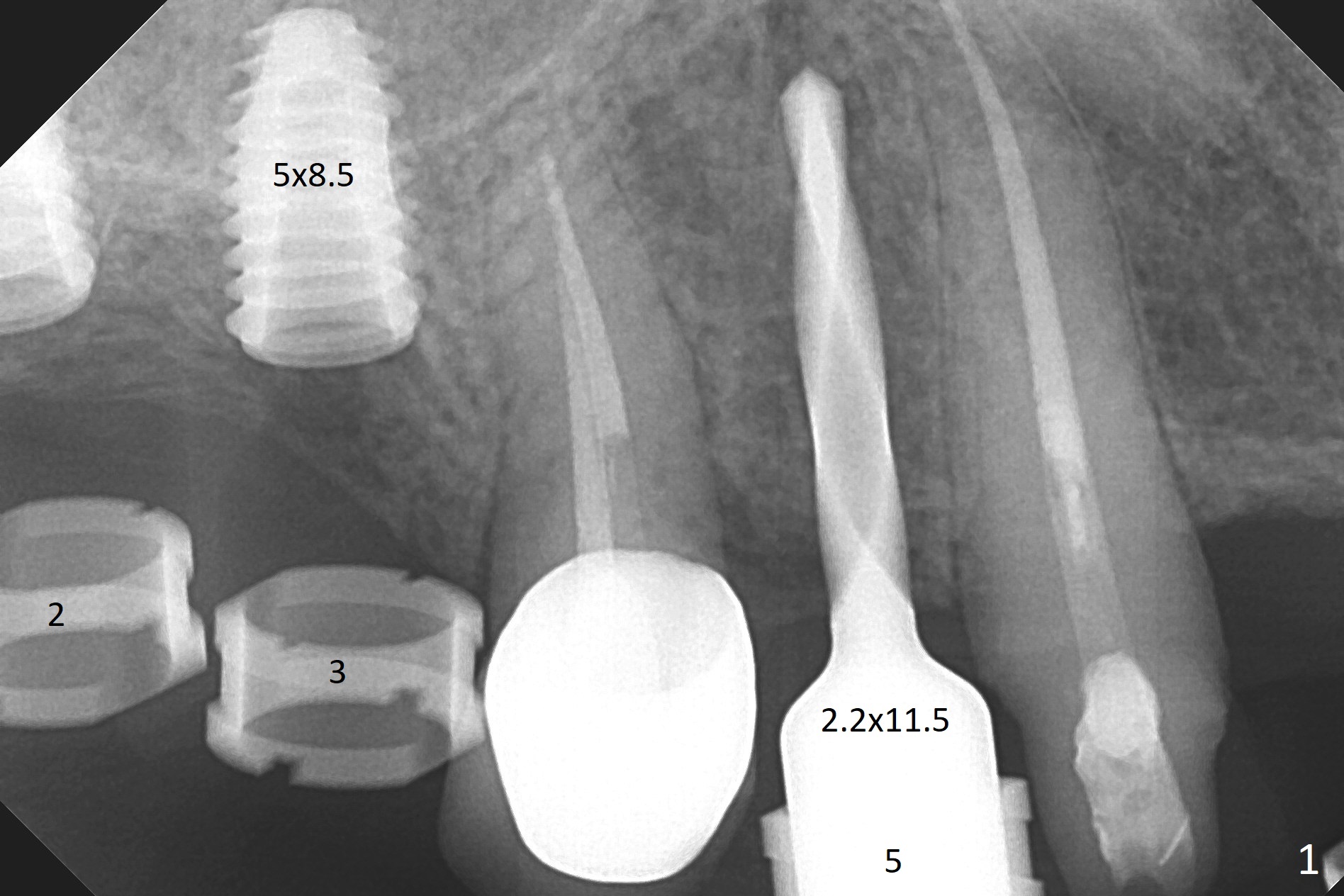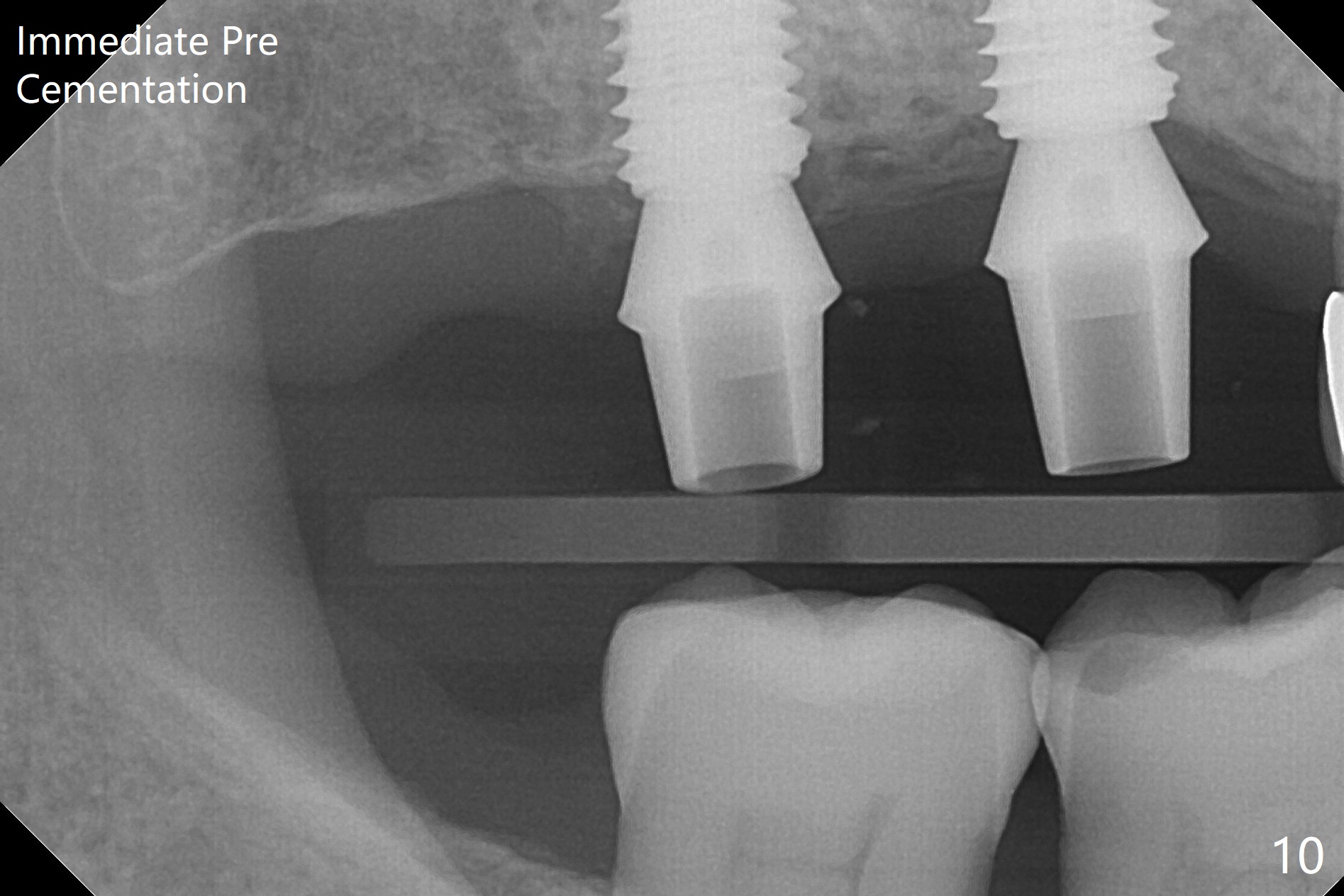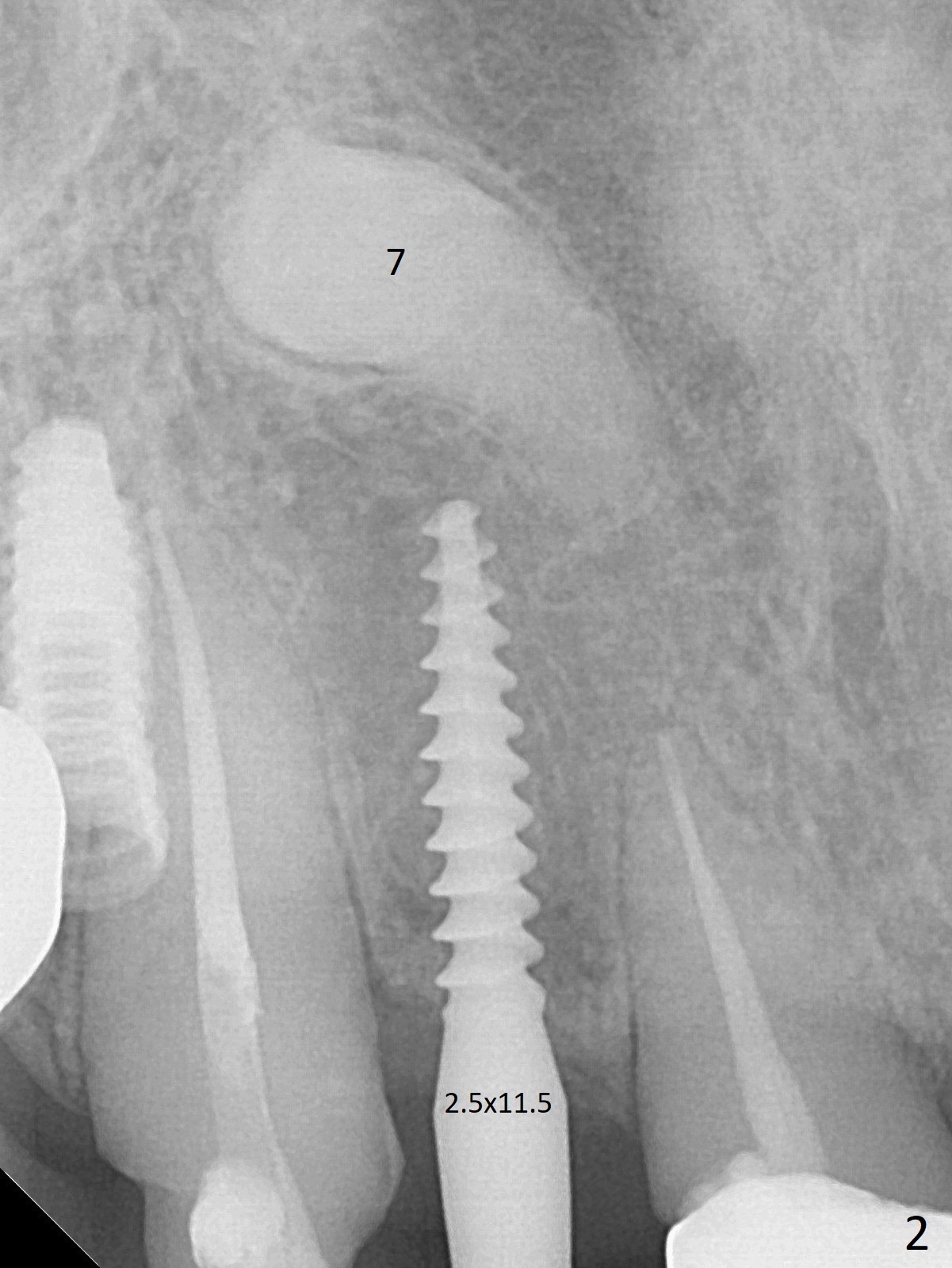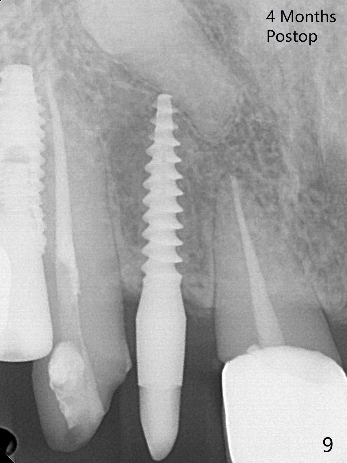 Two of 5x8.5 mm implants are placed at #2 and 3 with sinus lift using water ballooning technique; to avoid invading the neighboring root tips, an intraop PA is taken with a 2.2x11.5 mm drill at #5 (Fig.1). When a 2.5x11.5 mm 1-piece implant is placed at #7, there is 2.4 mm clearance from the impacted tooth (Fig.2). Following 1 mm deeper placement of the 1-piece implant, CT is taken to make sure that the threads are completely covered palatally (Fig.5 P). Interesting is that the sinus membrane is thickened at #2 and 3 (Fig.3 M), as compared to the clear sinus before surgery (Fig.3'). Bone graft is limited in the sinus (Fig.3 arrowheads). The implant at #5 (3.5x11.5 mm) is precisely placed subcrest bucco(B)-palatally (Fig.4). Since the limited field viewed CT does not cover the implant at #2 (Fig.3), immediate postop PA is taken (Fig.6). In fact all of the implants are placed subcrestal, as shown by intraoral X-ray 4 months postop (Fig.7-9). The abutments at #2, 3 and 5 are retorqued (30 Ncm) after crowns' try in and adjustment (Fig.10,11). There is a vertical gap between the implant and abutment at #2 (Fig.11 ^) and a horizontal one at #5 (<). There is apparently no bone loss 1 year 5 months post cementation (Fig.12).