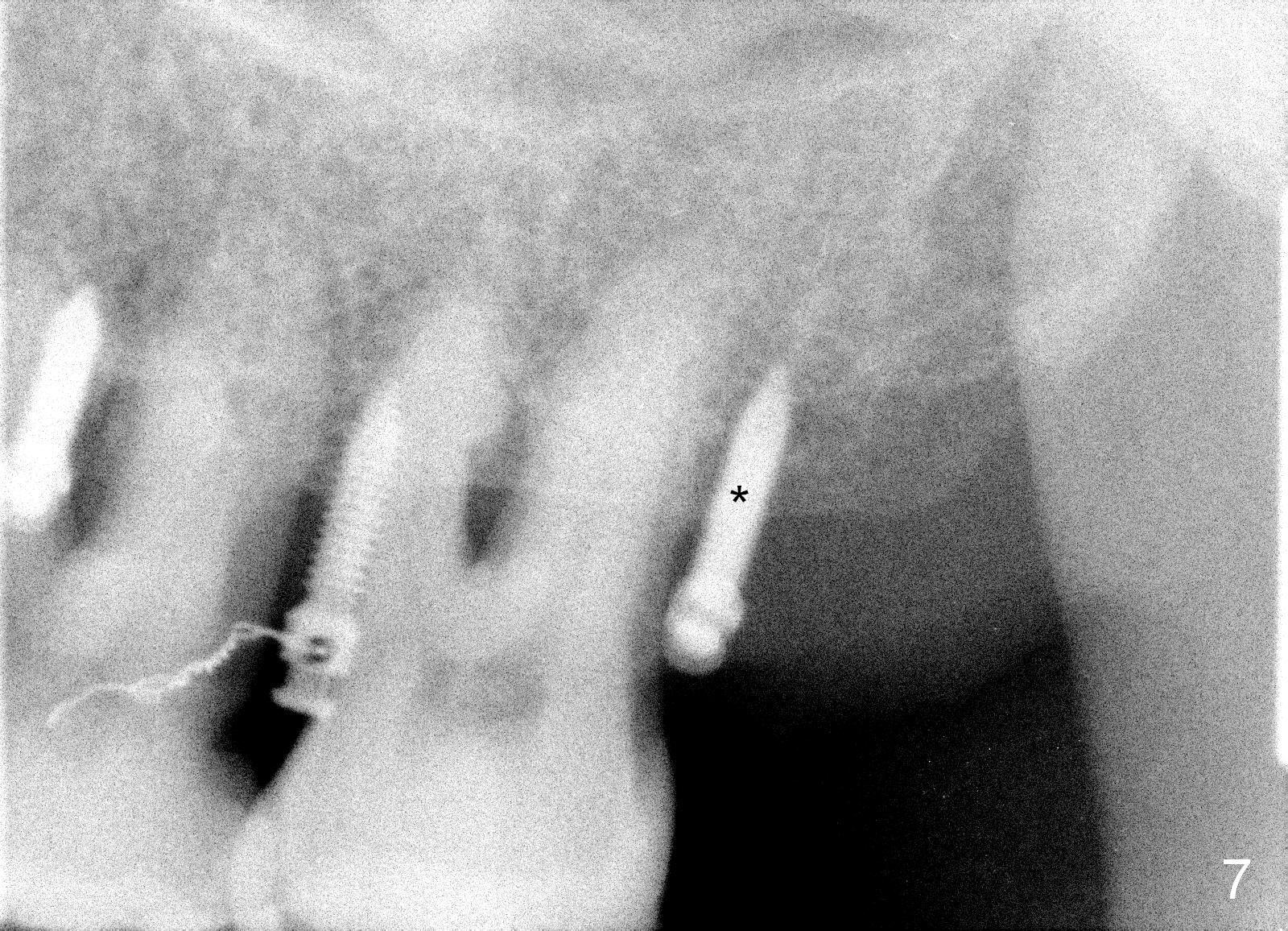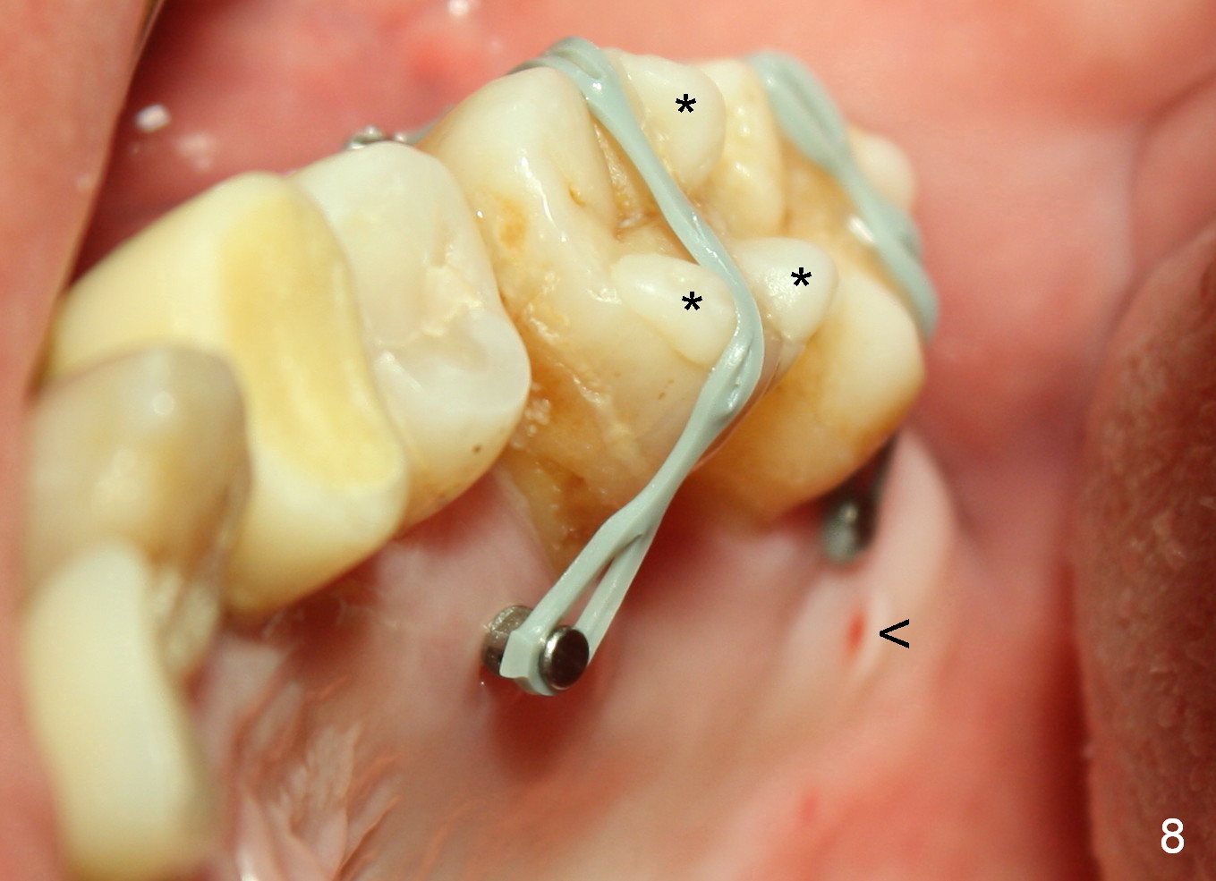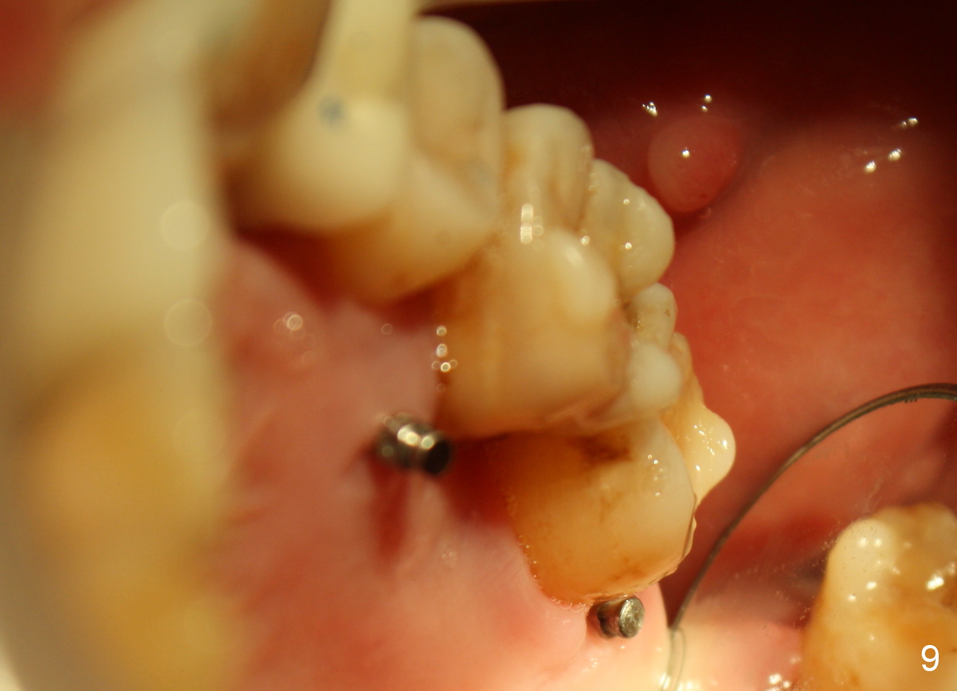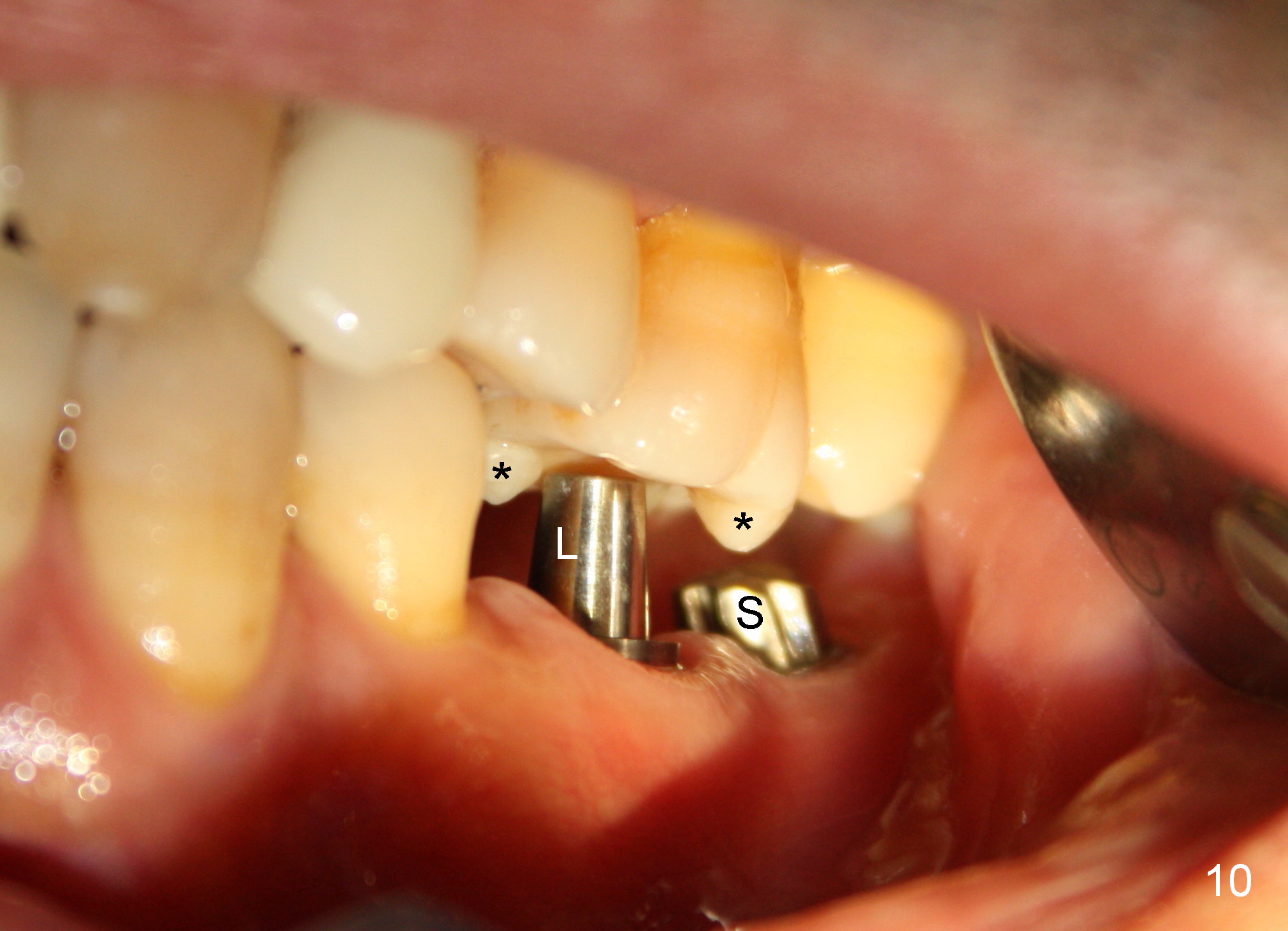 A 41-year-old man has chronic periodontits with bruxism. The teeth #14 and 15 are supraerupted (Fig.1 arrows) with furcal lesion (Fig.2 (CT) *). These 2 molars have guarded to poor prognosis. Due to insurance benefit limitation, we plan to save them temporarily with periodontal surgery so that bone loss would not get worse when the teeth are being intruded. After opposing implant placement (Fig.3), flaps are raised to remove calculus and granulation tissue (Fig.4, no bone graft). Twenty days later, three mini-implants are placed (Fig.5,6). The implant distopalatal to #15 is loose nearly 2 months postop (Fig.7 *) and retightened. The following month the same implant is placed higher for stability (Fig.8). The Intrusion takes <5.5 months (Fig.9,10).