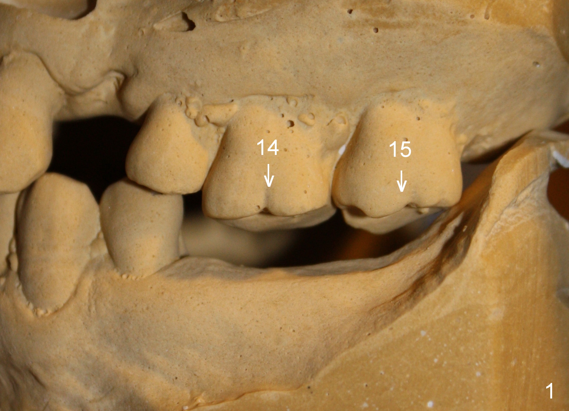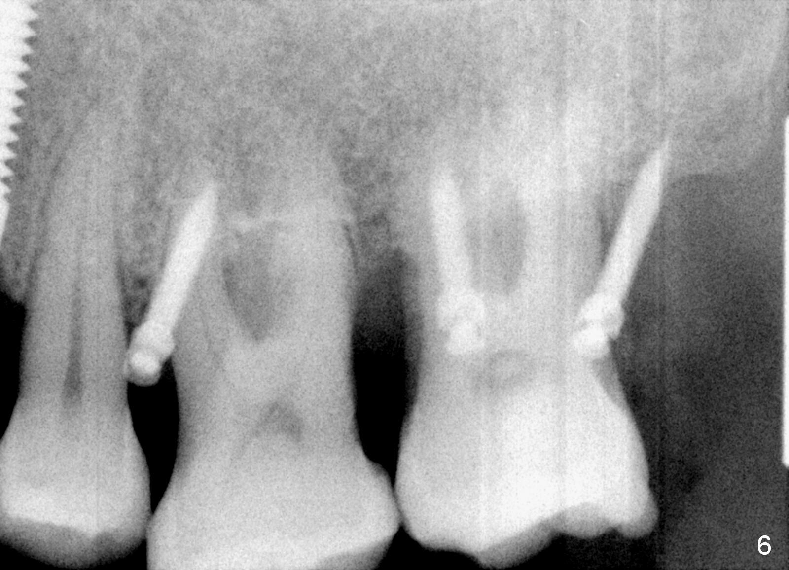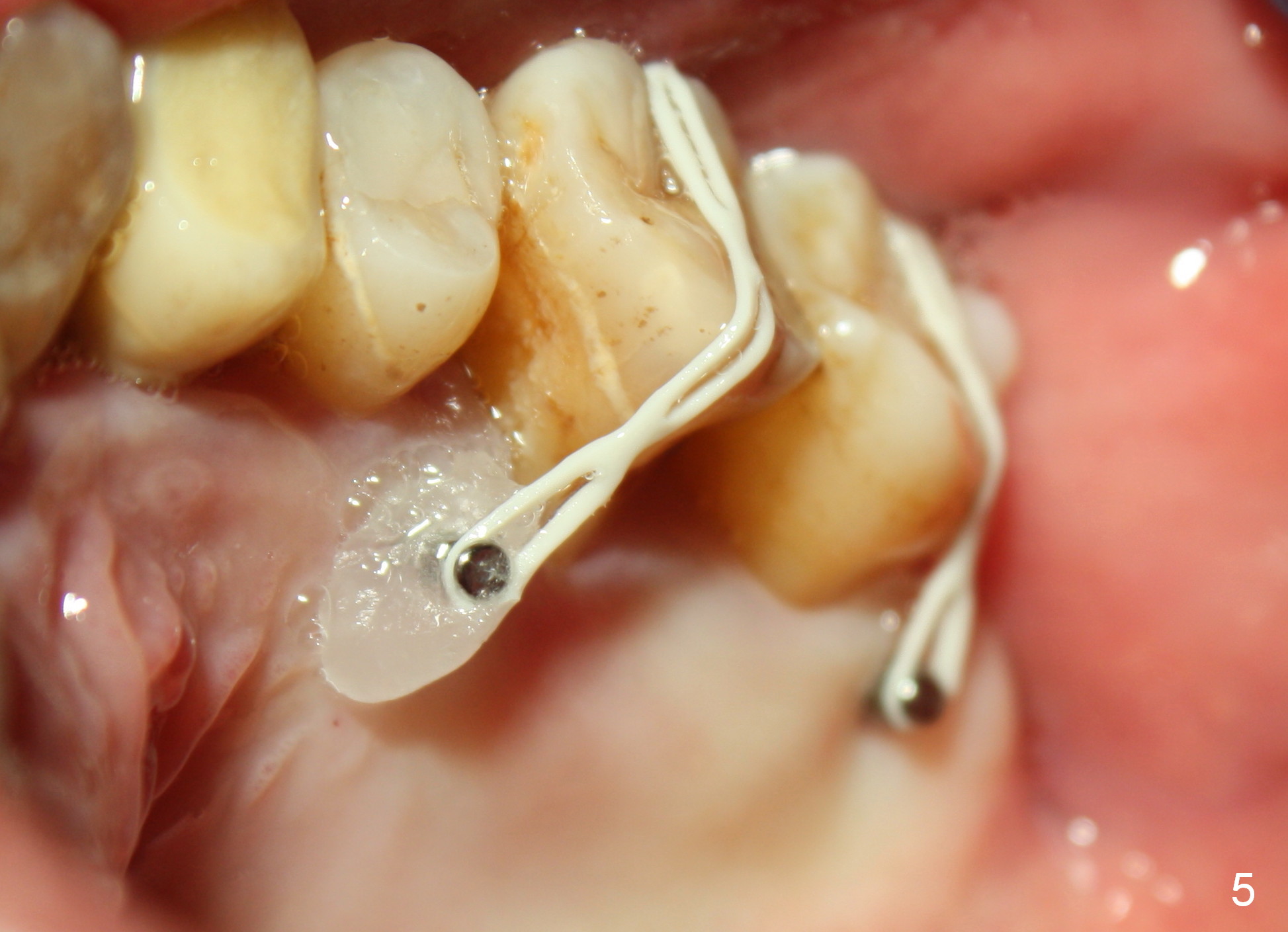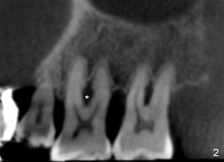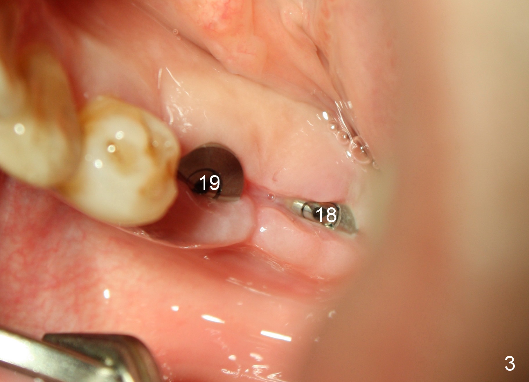 A 41-year-old man has chronic periodontits with bruxism. The teeth #14 and 15 are supraerupted (Fig.1 arrows) with furcal lesion (Fig.2 (CT) *). These 2 molars have guarded to poor prognosis. Due to insurance benefit limitation, we plan to save them temporarily with periodontal surgery so that bone loss would not get worse when the teeth are being intruded. After opposing implant placement (Fig.3), flaps are raised to remove calculus and granulation tissue (Fig.4, no bone graft). Twenty days later, three mini-implants are placed (Fig.5,6). The implant distopalatal to #15 is loose nearly 2 months postop (Fig.7 *) and retightened. The following month the same implant is placed higher for stability (Fig.8). The Intrusion takes <5.5 months (Fig.9,10).
