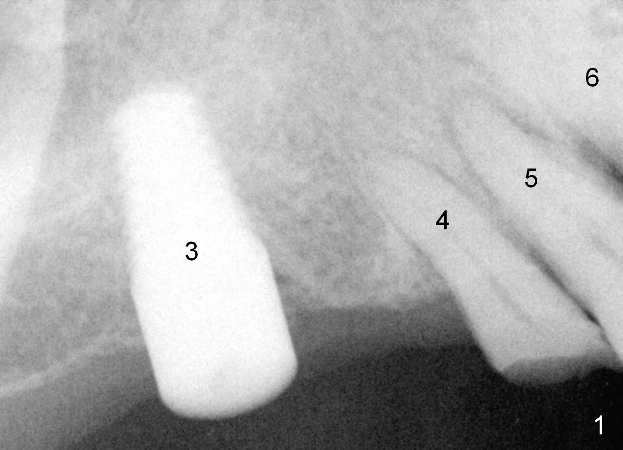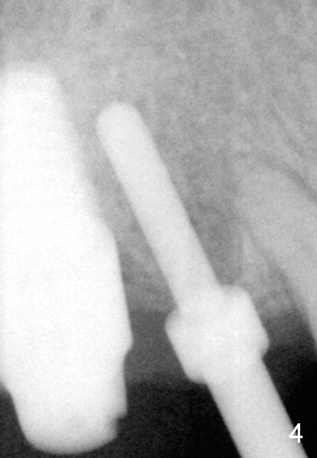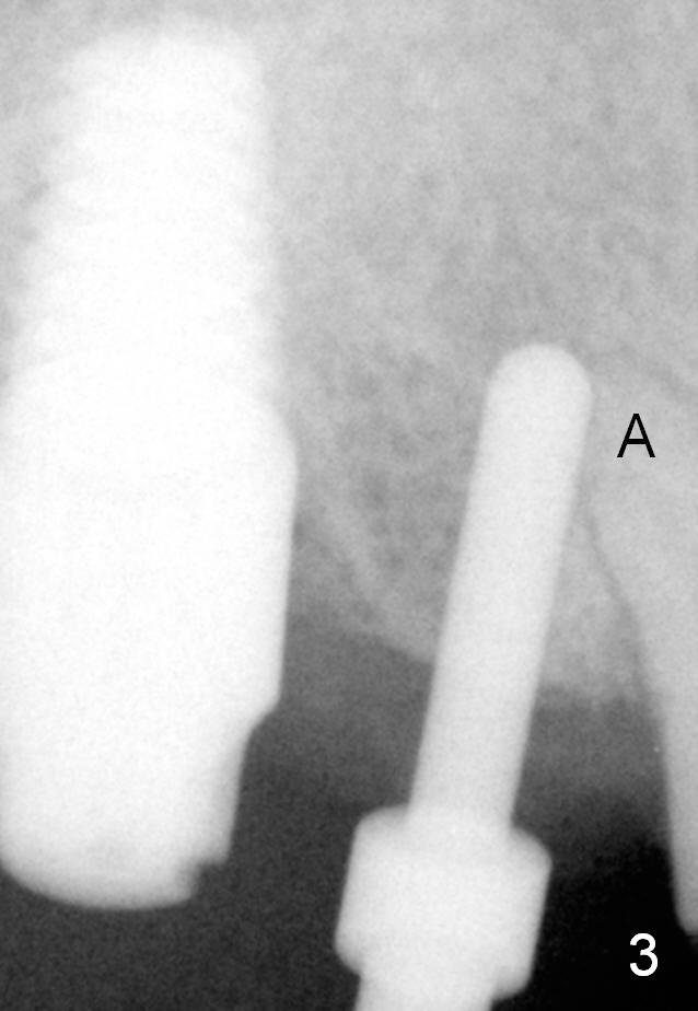 The implant at the site of #3 is intentionally placed distal as part of a plan to distalize the teeth #4-6 (Fig.1). Ortho started, but the patient did not want to pursue it. The most efficient way to terminate it is to dislodge every one of brackets/bands. When it is time for restoration for implants at the sites of #3 and 30, it is a challenge to deal with the space mesial to #3. The patient is planning to leave the country in 20 days. Fortunately he agrees to have an extra implant (Fig.2). It must be small in diameter. The initial osteotomy does not go on smoothly, approaching the apex of the tooth #4 (Fig.3 A). The osteotomy is moved distally and the trajectory is changed. It appears to be overcorrected (Fig.4). After re-adjustment, a 3.5x14 mm implant is placed with insertion torque between 15 and 20 Ncm (Fig.5). An abutment is placed with perio dressing applied around it as well as #3 after suturing. When the wound heals and before the patient leaves the country, the abutment is removed.