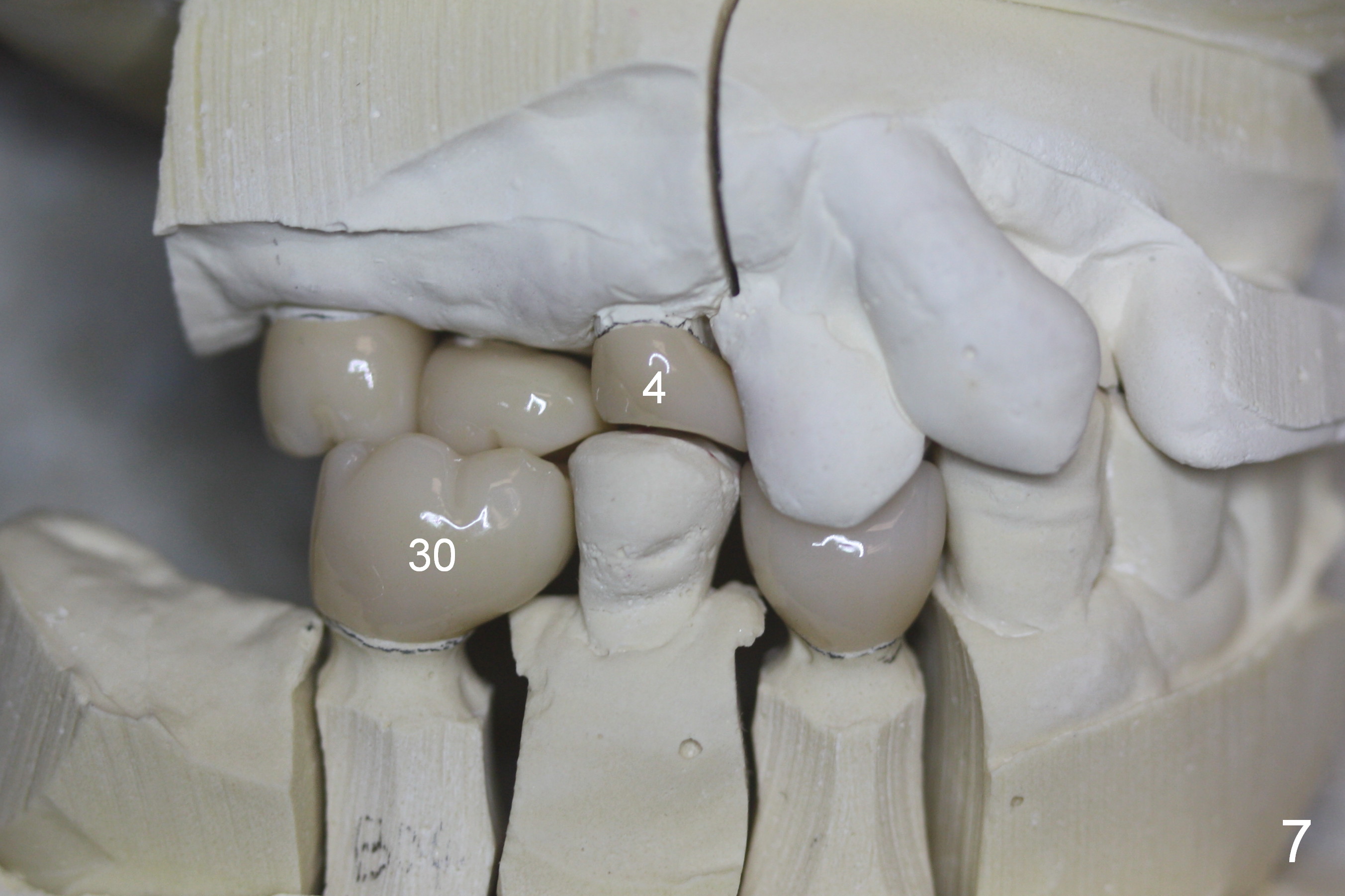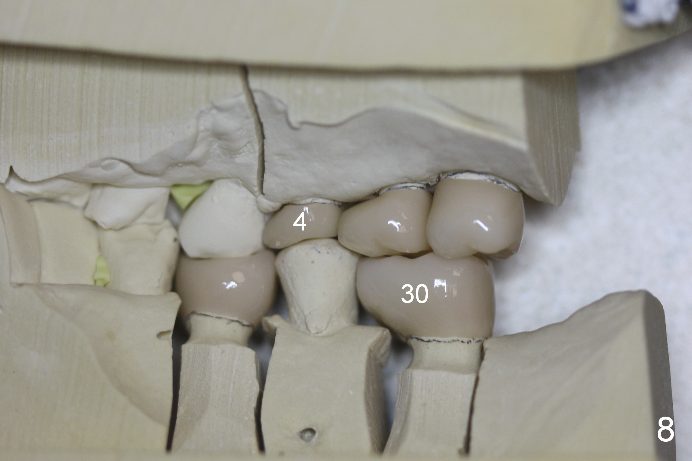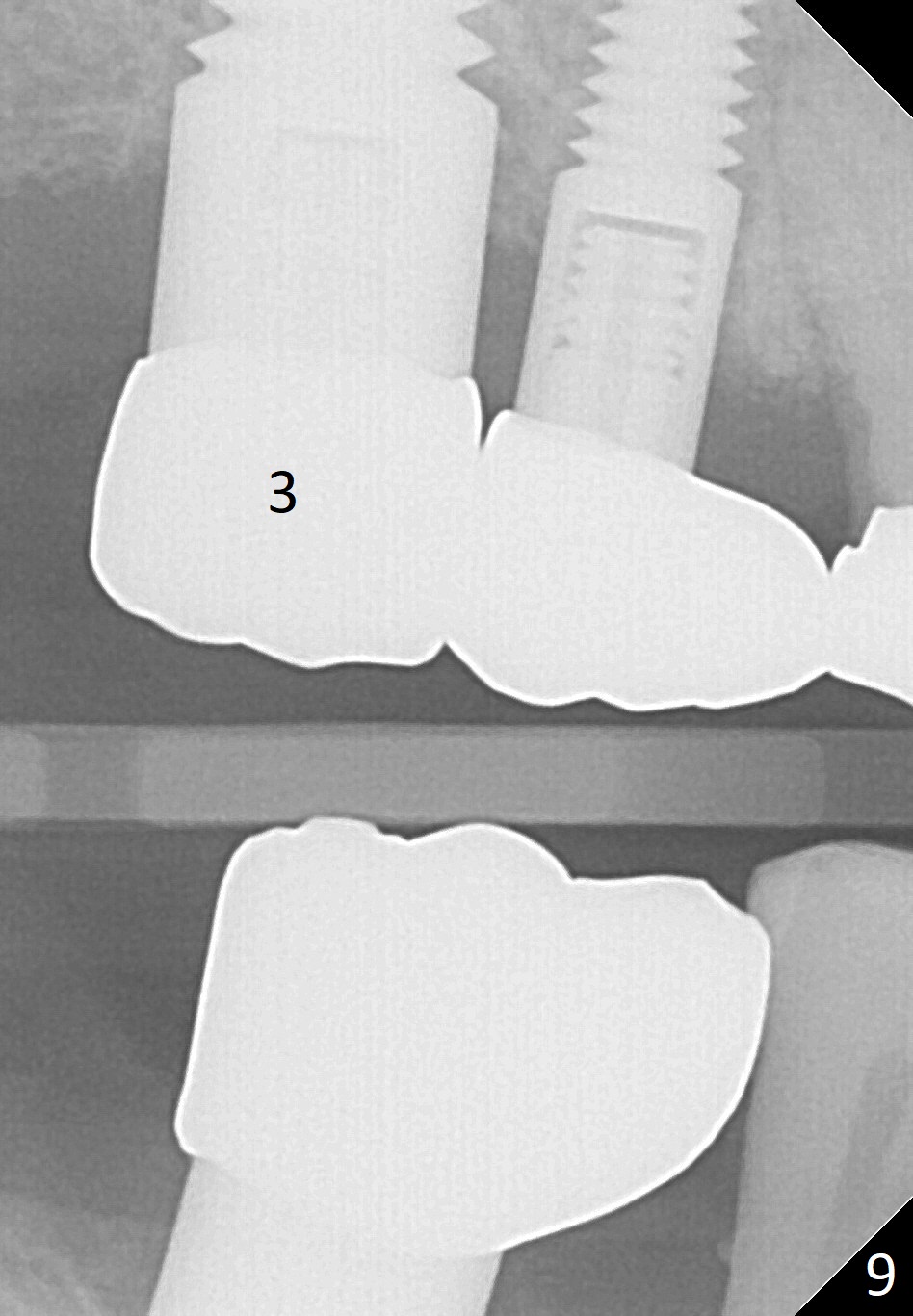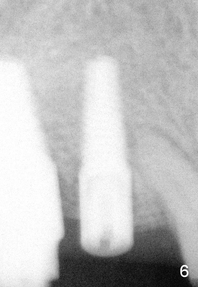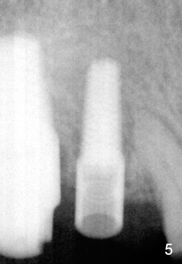 Eight months postop (Fig.6), he returns for final restorations (Fig.7 (buccal), 8 (lingual view)). There is no bone loss nearly 2 years post cementation (Fig.9).