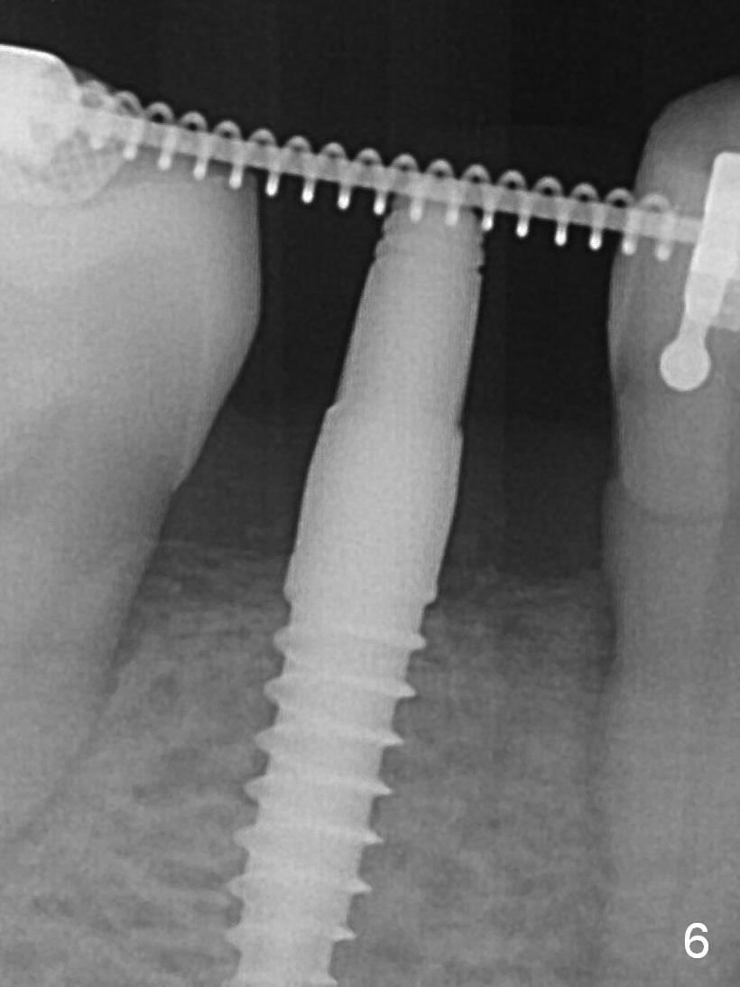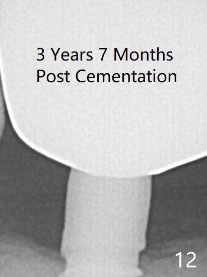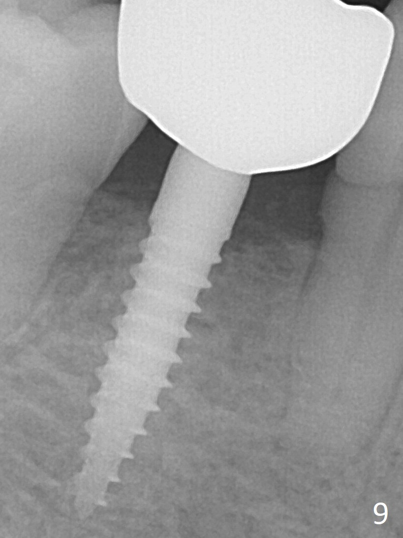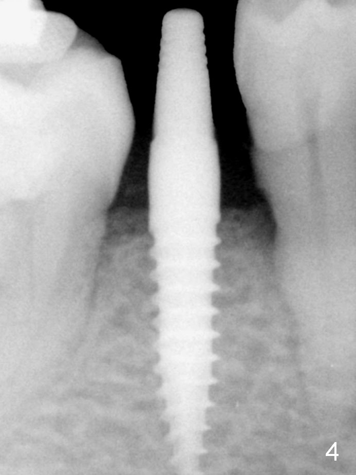 A 3x12(2) mm 1-piece implant is placed (Fig.4) with insertion torque > 40 Ncm. There is no bone loss 3 months postop (Fig.6), 3.5 months post cementation (Fig.9) or 3 years 7 months post cementation (Fig.12).