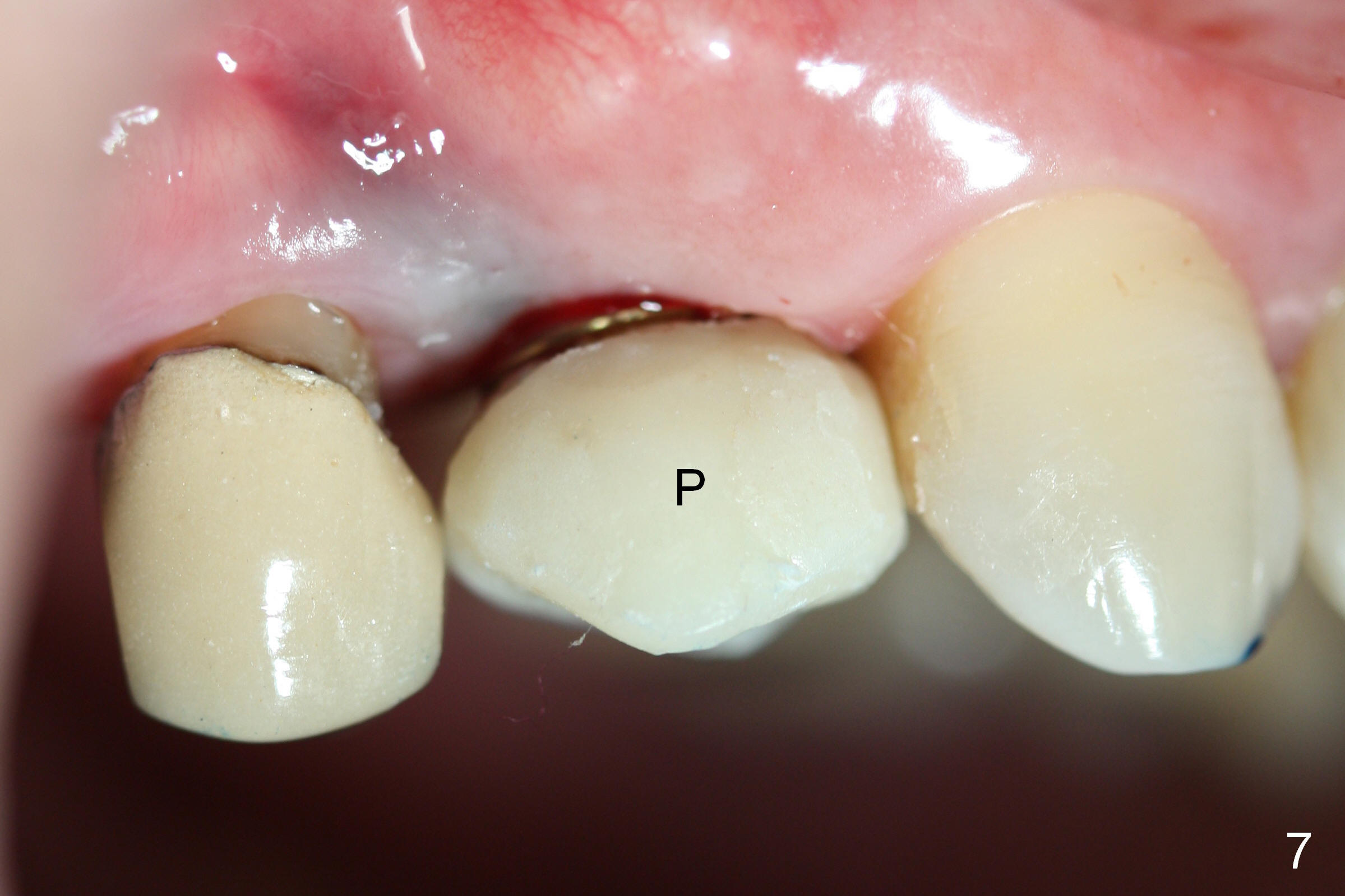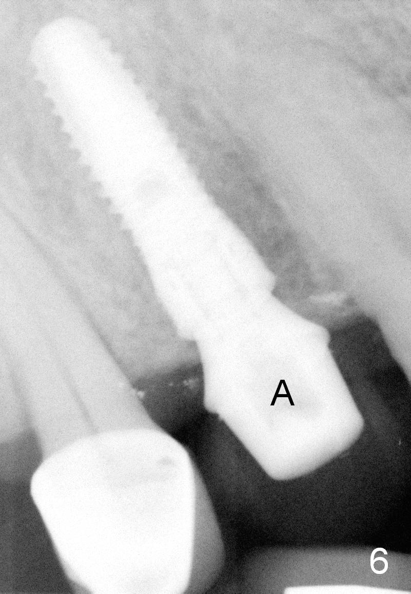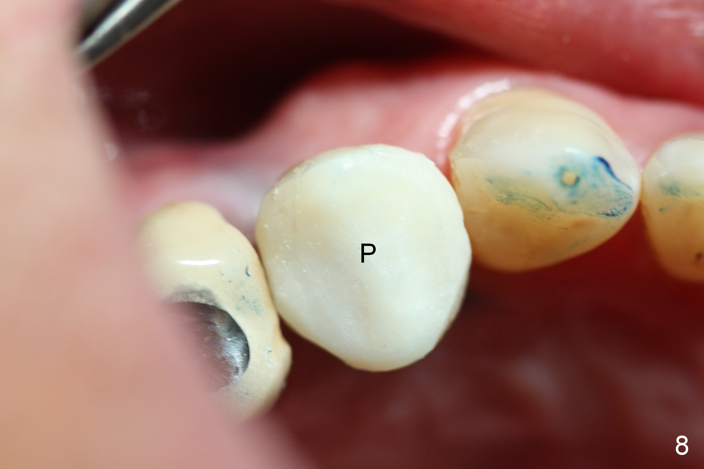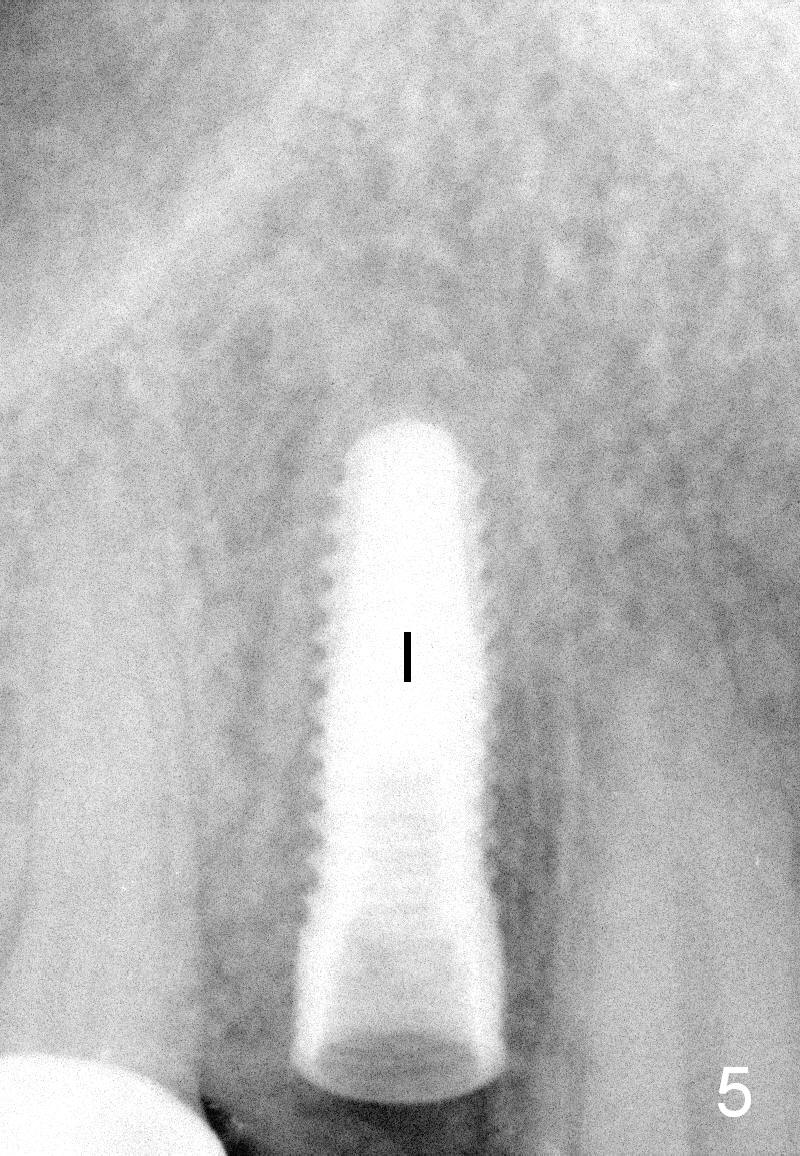 A 66-year-old man has lost several teeth (Fig.1,2). There is a particularly wide mesiodistal space for the site of #5 (Fig.1), probably due to distalization of the tooth #4 under heavy occlusion (Fig.2 arrow). A 4 mm tissue punch is used for access, followed by 1.6 mm pilot drill (Fig.3). After trajectory adjustment, a 2 mm parallel pin is inserted (Fig.4); later the osteotomy is moved distally (arrow). Finally a 4.5x14 mm implant is placed (Fig.5 I). Due to limited access, the implant is placed a little deeper than necessary; the gingival cuff of an abutment has to be longer (Fig.6 A: 5.8x4(3) mm). An immediate provisional is fabricated (Fig.7,8 P). The provisional looks wide (Fig.7). When the implant osteointegrates, limited orthodontic treatment will be done to idealize the space of #5 as follows.