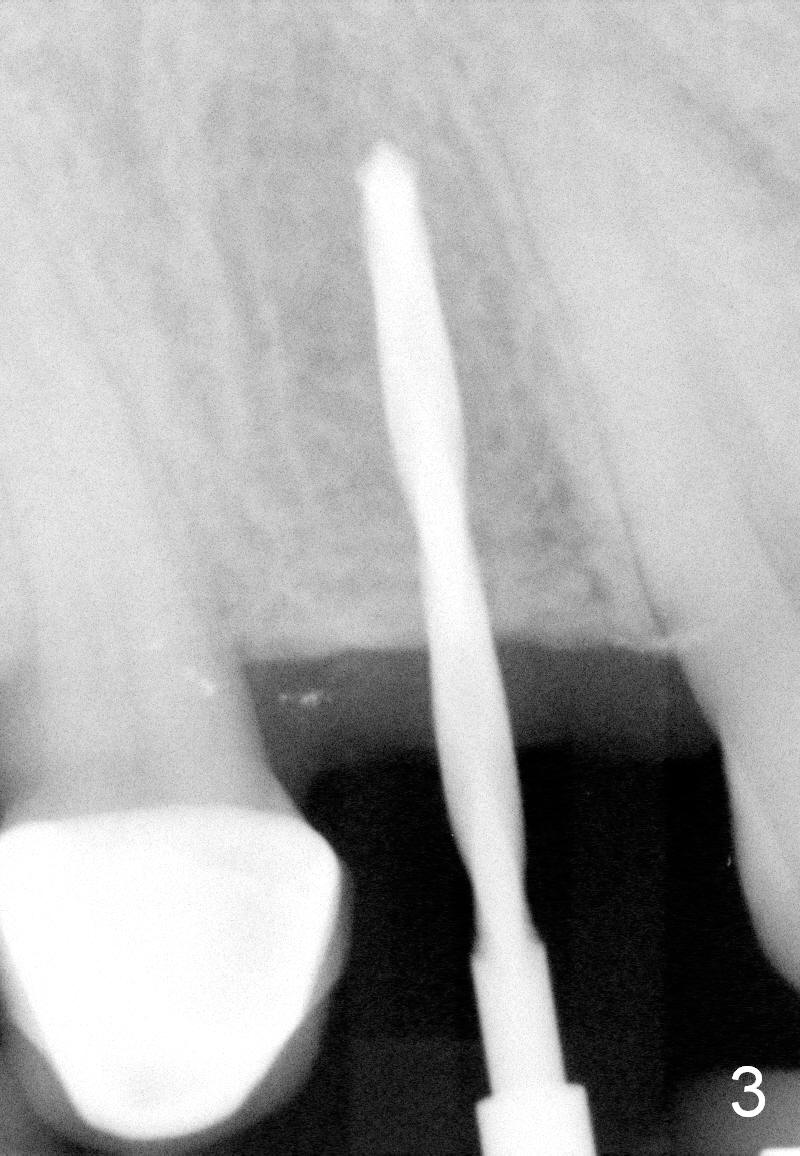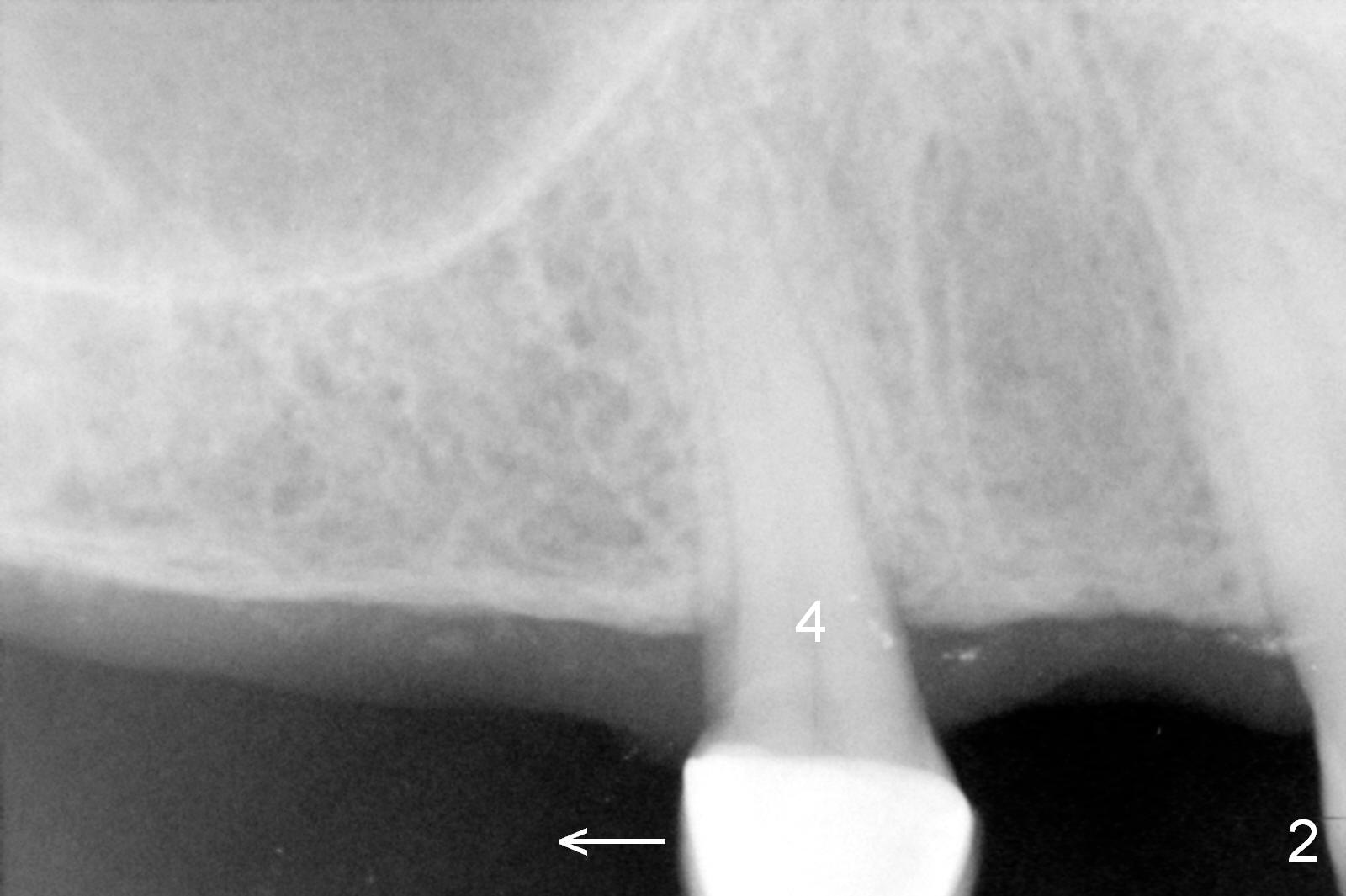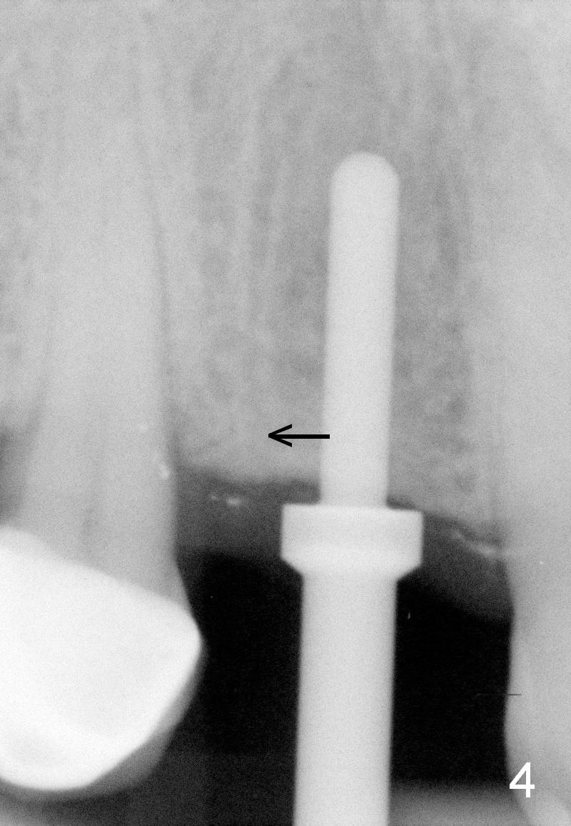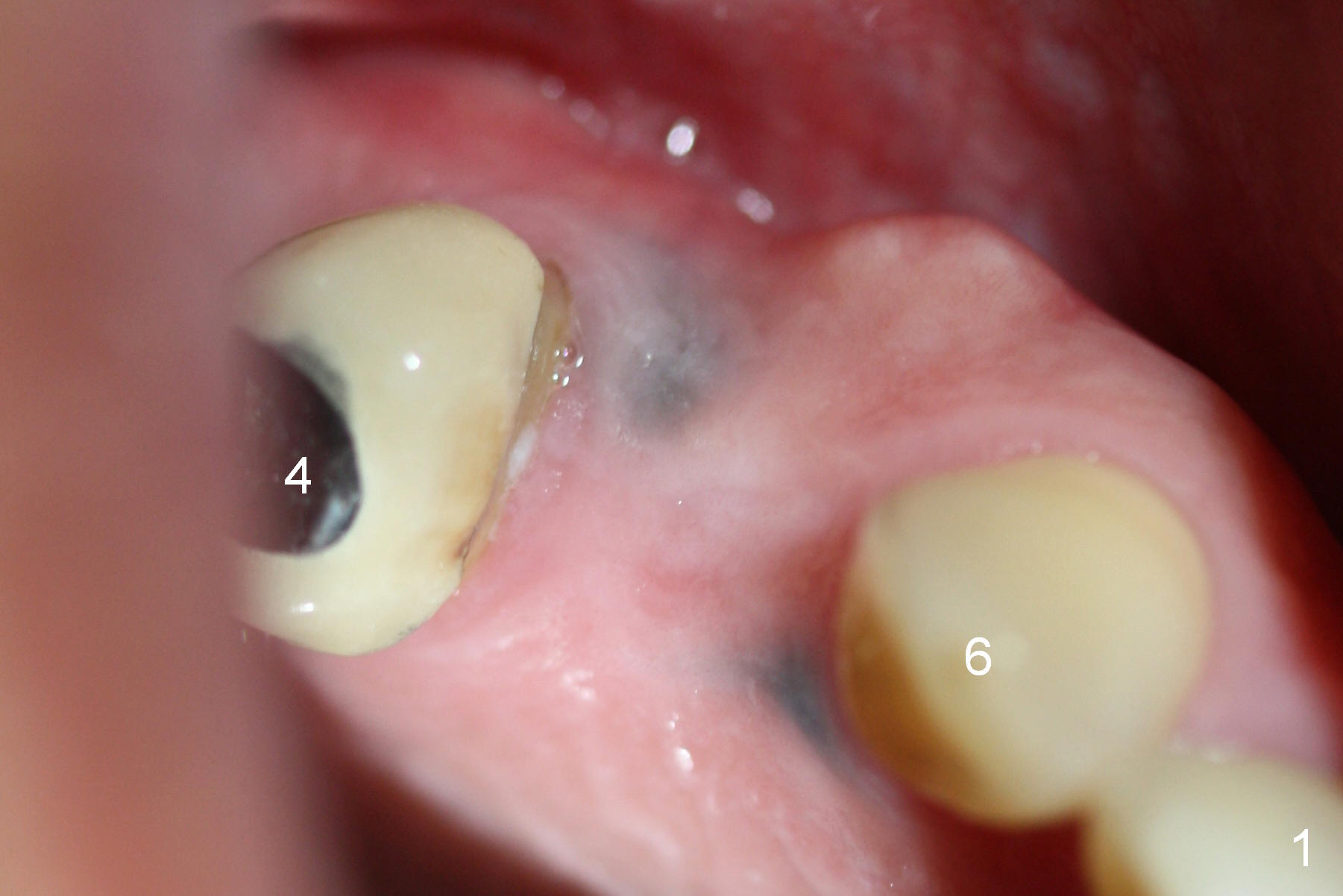 A 66-year-old man has lost several teeth (Fig.1,2). There is a particularly wide mesiodistal space for the site of #5 (Fig.1), probably due to distalization of the tooth #4 under heavy occlusion (Fig.2 arrow). A 4 mm tissue punch is used for access, followed by 1.6 mm pilot drill (Fig.3). After trajectory adjustment, a 2 mm parallel pin is inserted (Fig.4); later the osteotomy is moved distally (arrow). Finally a 4.5x14 mm implant is placed (Fig.5 I). Due to limited access, the implant is placed a little deeper than necessary; the gingival cuff of an abutment has to be longer (Fig.6 A: 5.8x4(3) mm). An immediate provisional is fabricated (Fig.7,8 P). The provisional looks wide (Fig.7). When the implant osteointegrates, limited orthodontic treatment will be done to idealize the space of #5 as follows.