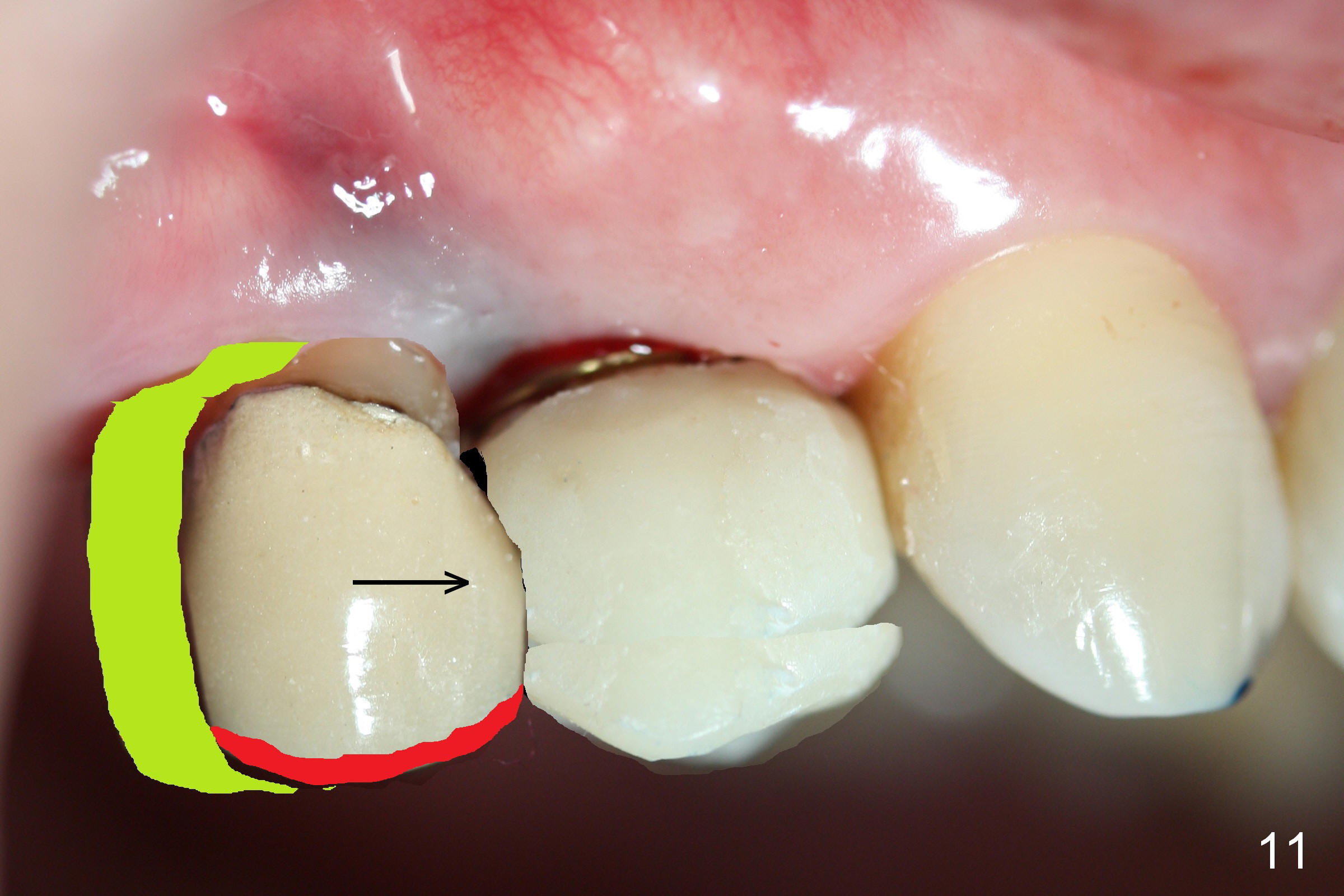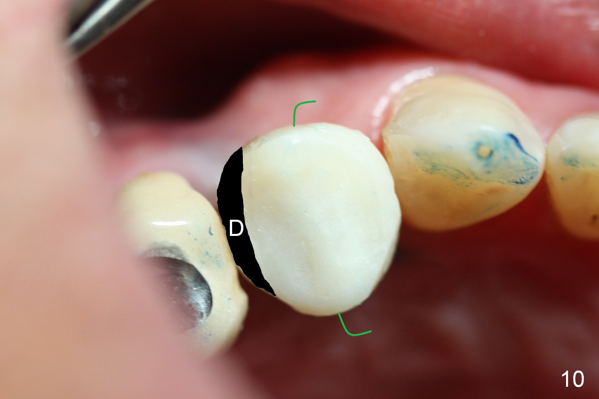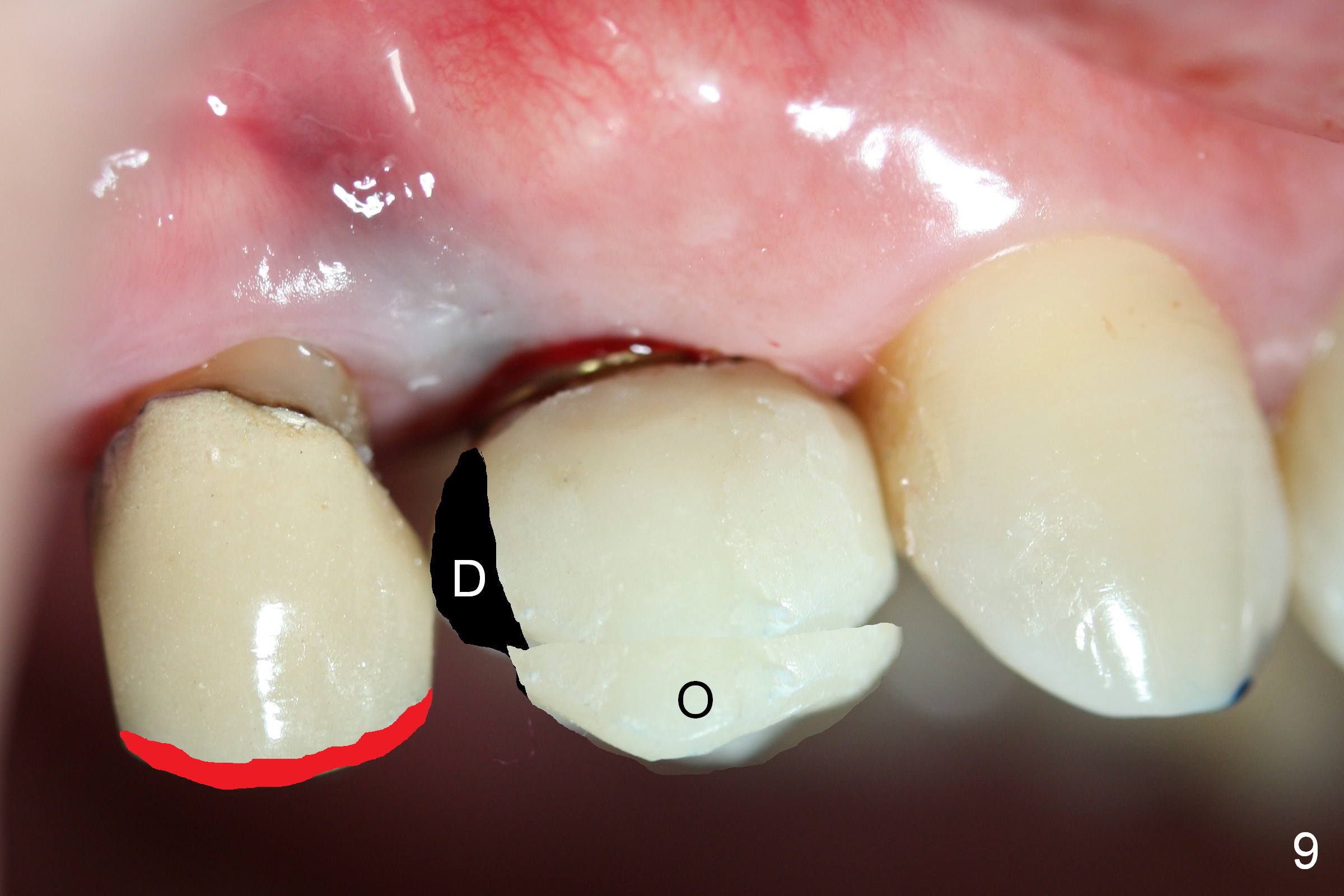 The distal surface of the provisional will be reduced (Fig.9,10 D), whereas the occlusal surface will be increased (Fig.9 O). If needed, the occlusal surface of the distalized tooth #4 will be reduced (Fig.9 red area) so that there is no interference for tooth to move. Hooks will be placed on the buccal and lingual surfaces of the provisional (Fig.10 green curved lines). Power chains will be placed on the hooks and wrapped around the tooth #4. In due time, the tooth will be mesialized (Fig.11 arrow). Implants at the sites of #2 and 3 will be placed in more appropriate positions.