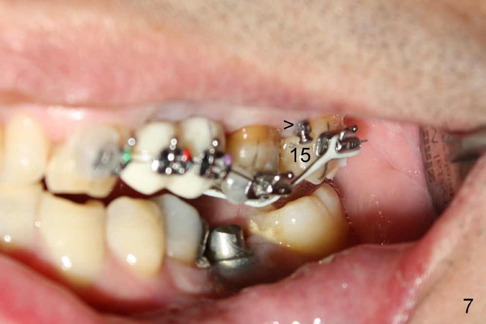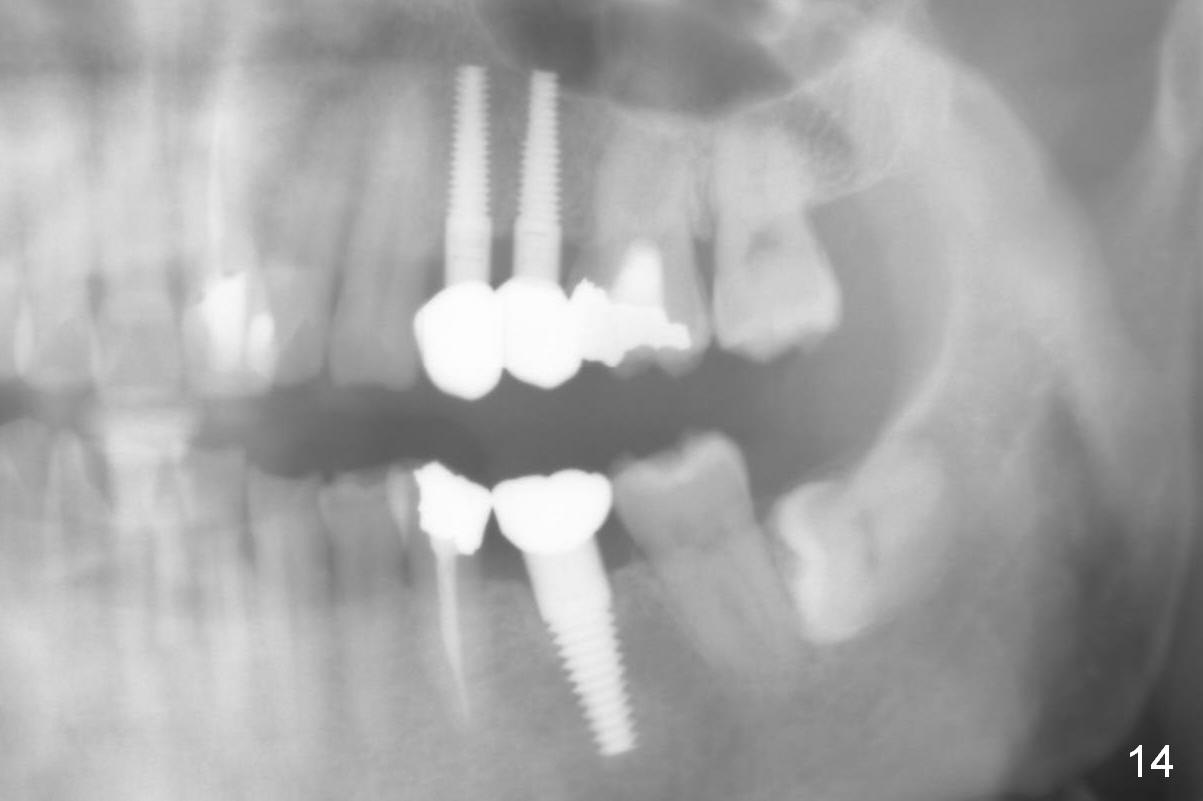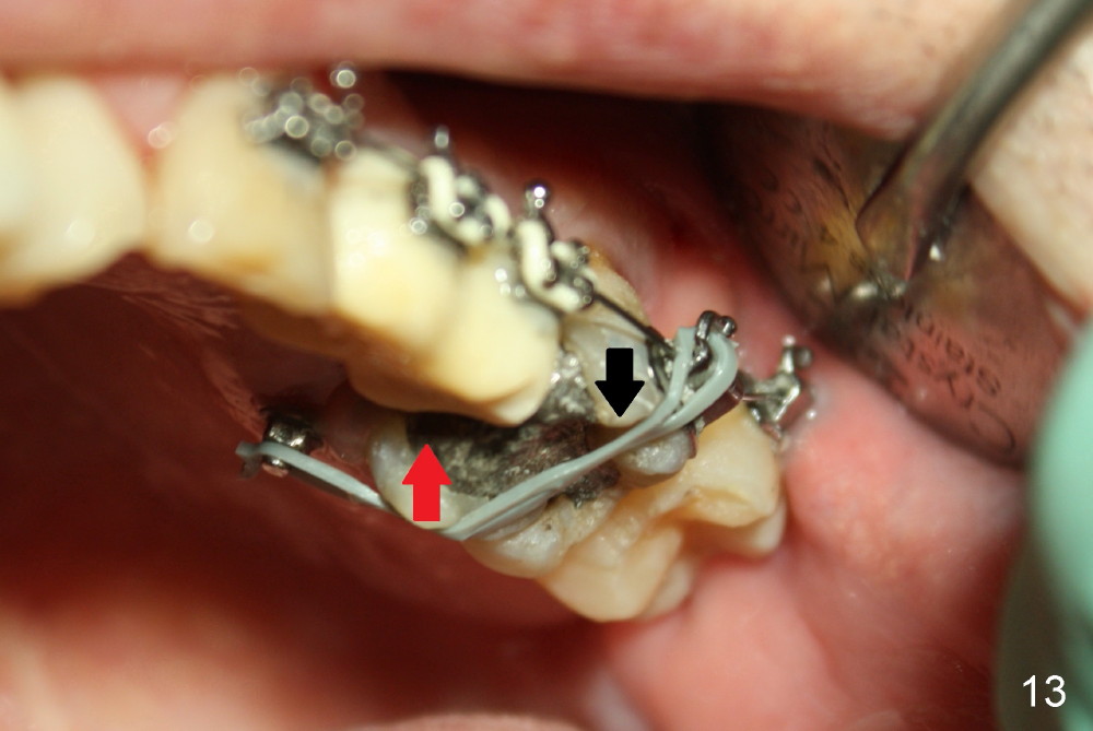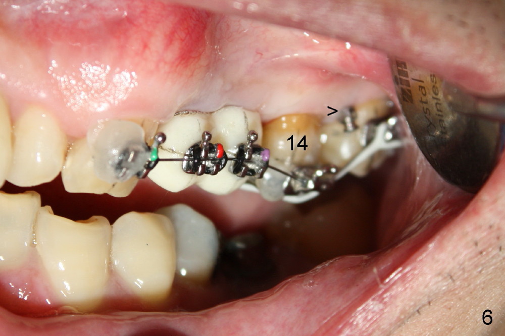 A 51-year-old man needs implants at the sites of #12,13,19 (Fig.1). The teeth #12 and 13 are extracted. An implant is placed at #19 (Fig.2 <). After osteointegration, an abutment is placed (Fig.2 A). The opposing tooth, #14, is found supraerupted. Two mini-implants are placed at the mesiobuccal and distolingual areas of #14 (Fig.3 (mirror view) <) and a power chain (*) is placed for intrusion. In the next 8 months, these 2 mini-implants become loose. Two new mini-implants are placed in the mesiolingual and distobuccal regions (Fig.4 ^). The one in the distobuccal region is loose after a while (Fig.6,7 >). In brief, mini-implants are not efficient in intrusion. At this time, the implants at the sites of #12,13 apparently osteointegrate (3 months post placement) and abutments are placed (Fig.4). Provisional crowns are fabricated (Fig.5). Brackets are placed between #11 and 15 with the bracket at #14 placed more coronally than those of the neighboring teeth (Fig.6-8). Mesially there are two excellent anchorages (#12,13) as well as the mesiolingual mini-implant. The distal anchorage is #15. In the next 5.5 months, the tooth #14 is intruded (Fig.9,10), but the 2nd molar is mobile (not as strong as #14). A longer mini-implant is placed in the distobuccal corner (>, more apical than before (Fig.7)). The distobuccal mini-implant is found to be mobile in 3 weeks (Fig.11). It appears that there is enough clearance for restoration of #19 (Fig.12). Power chains are placed between the mesiolingual mini-implant and #14 buccal tube until the appointment for crown prep. In this way, the lingual cusps may ascend (Fig.13 red arrow), while the buccal ones may descend (black arrow). The occlusal clearance will be more favorable.