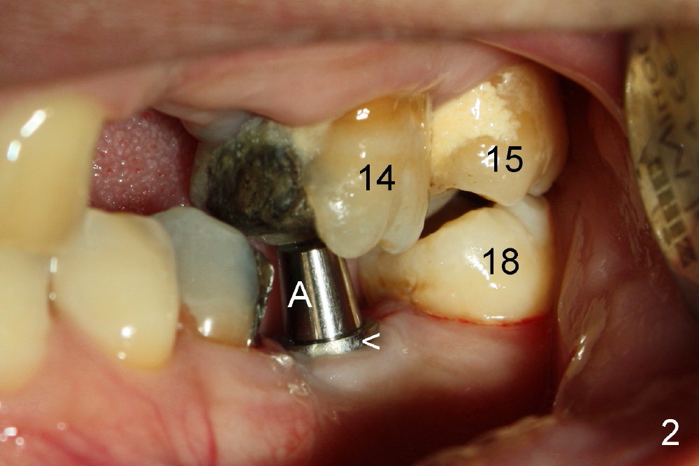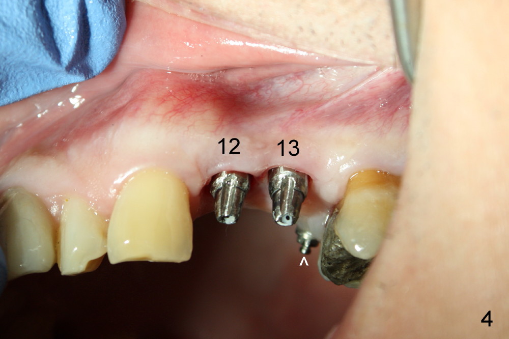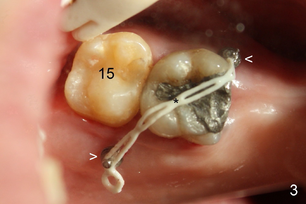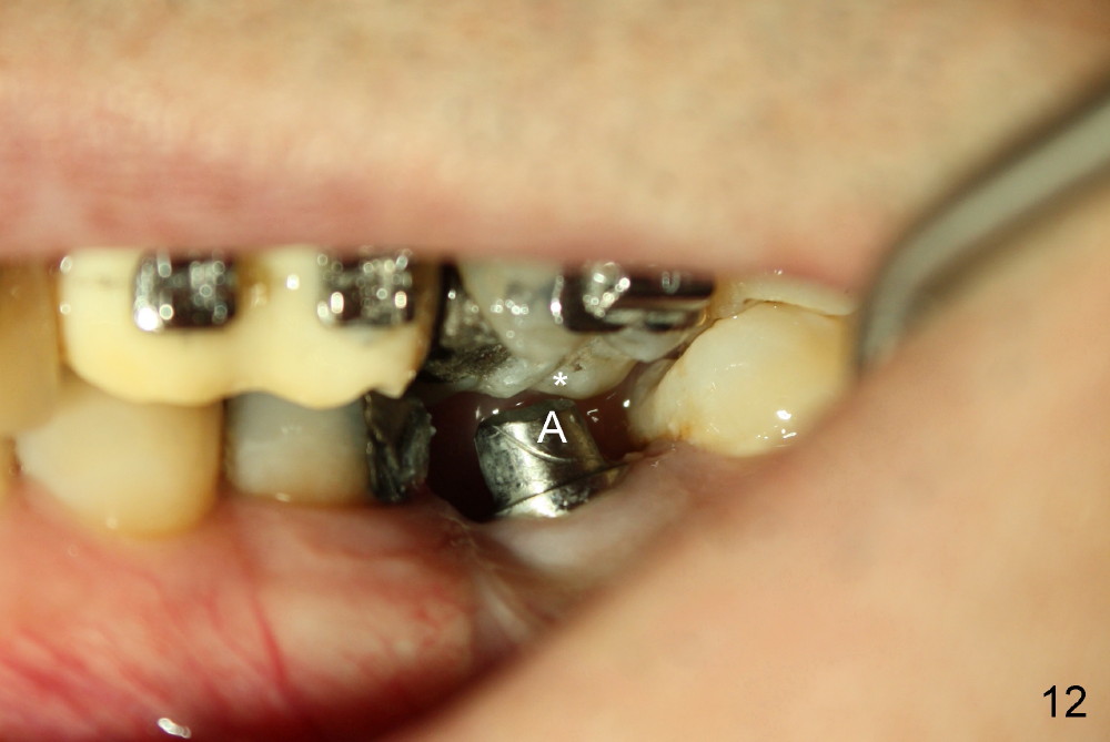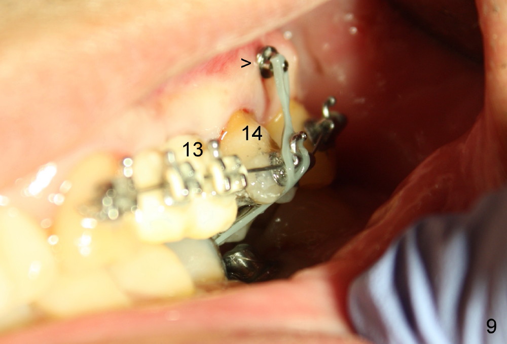 A 51-year-old man needs implants at the sites of #12,13,19 (Fig.1). The teeth #12 and 13 are extracted. An implant is placed at #19 (Fig.2 <). After osteointegration, an abutment is placed (Fig.2 A). The opposing tooth, #14, is found supraerupted. Two mini-implants are placed at the mesiobuccal and distolingual areas of #14 (Fig.3 (mirror view) <) and a power chain (*) is placed for intrusion. In the next 8 months, these 2 mini-implants become loose. Two new mini-implants are placed in the mesiolingual and distobuccal regions (Fig.4 ^). The one in the distobuccal region is loose after a while (Fig.6,7 >). In brief, mini-implants are not efficient in intrusion. At this time, the implants at the sites of #12,13 apparently osteointegrate (3 months post placement) and abutments are placed (Fig.4). Provisional crowns are fabricated (Fig.5). Brackets are placed between #11 and 15 with the bracket at #14 placed more coronally than those of the neighboring teeth (Fig.6-8). Mesially there are two excellent anchorages (#12,13) as well as the mesiolingual mini-implant. The distal anchorage is #15. In the next 5.5 months, the tooth #14 is intruded (Fig.9,10), but the 2nd molar is mobile (not as strong as #14). A longer mini-implant is placed in the distobuccal corner (>, more apical than before (Fig.7)). The distobuccal mini-implant is found to be mobile in 3 weeks (Fig.11). It appears that there is enough clearance for restoration of #19 (Fig.12). Power chains are placed between the mesiolingual mini-implant and #14 buccal tube until the appointment for crown prep. In this way, the lingual cusps may ascend (Fig.13 red arrow), while the buccal ones may descend (black arrow). The occlusal clearance will be more favorable.