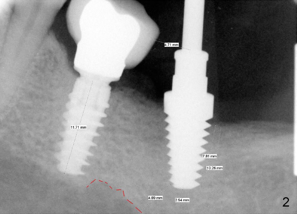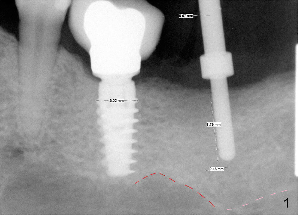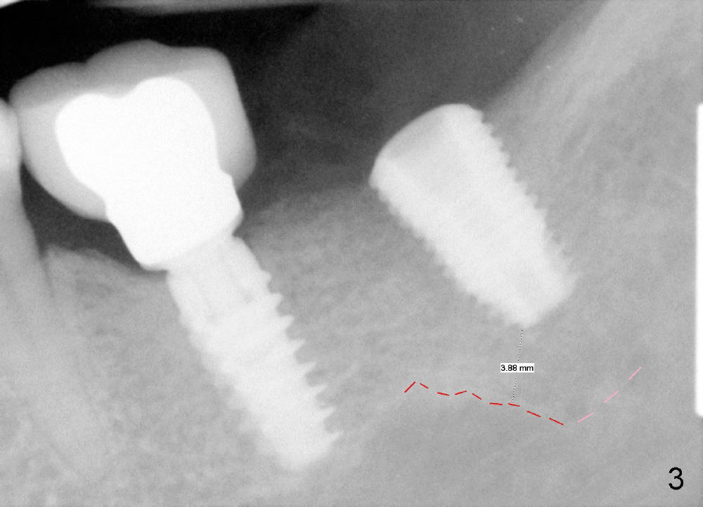 CBCT analysis reveals that there is an abnormal segment of the inferior alveolar nerve (IAN), slightly mesial to the site of #18. Intraop positional PA (Fig.1) shows that it is predictably safe to place 6.3x8 mm implant with the apical diameter (4.3 mm < 2.46 mmx2). Red dashed line indicates the abnormal segment of the IAN (pink line: normal segment). There is also some distance to IAN when 6x11 mm tap is inserted at the depth of 8 mm (Fig.2). Finally a 6.3x10 mm extra wide implant (Brushite) is placed with 3.88 mm from IAN (Fig.3).