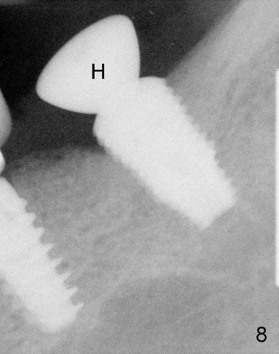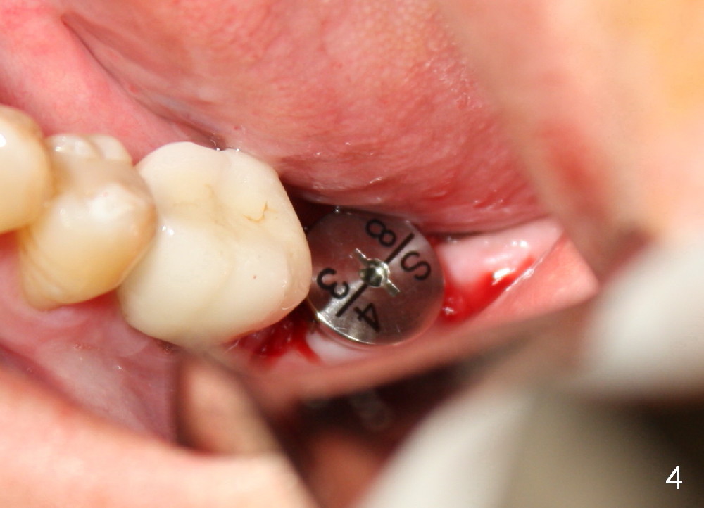 Approximately 1 mm coronal portion of the implant is exposed buccally and lingually. The exposed portion is covered by autogenous graft harvested during osteotomy and collagen membrane. The membrane is fixated between the implant and healing abutment (8.2(4(3)) (Fig.4). There are two unexpected advantages associated with using the healing abutment. The first is that the abutment reduces tension in suturing. The second is that perio dressing can be tucked underneath the hemisphere of the the large (8.2 mm) and tall (4 mm) abutment (Fig.5 ^). The dressing is more secure. It should not be dislodged in a week postop.