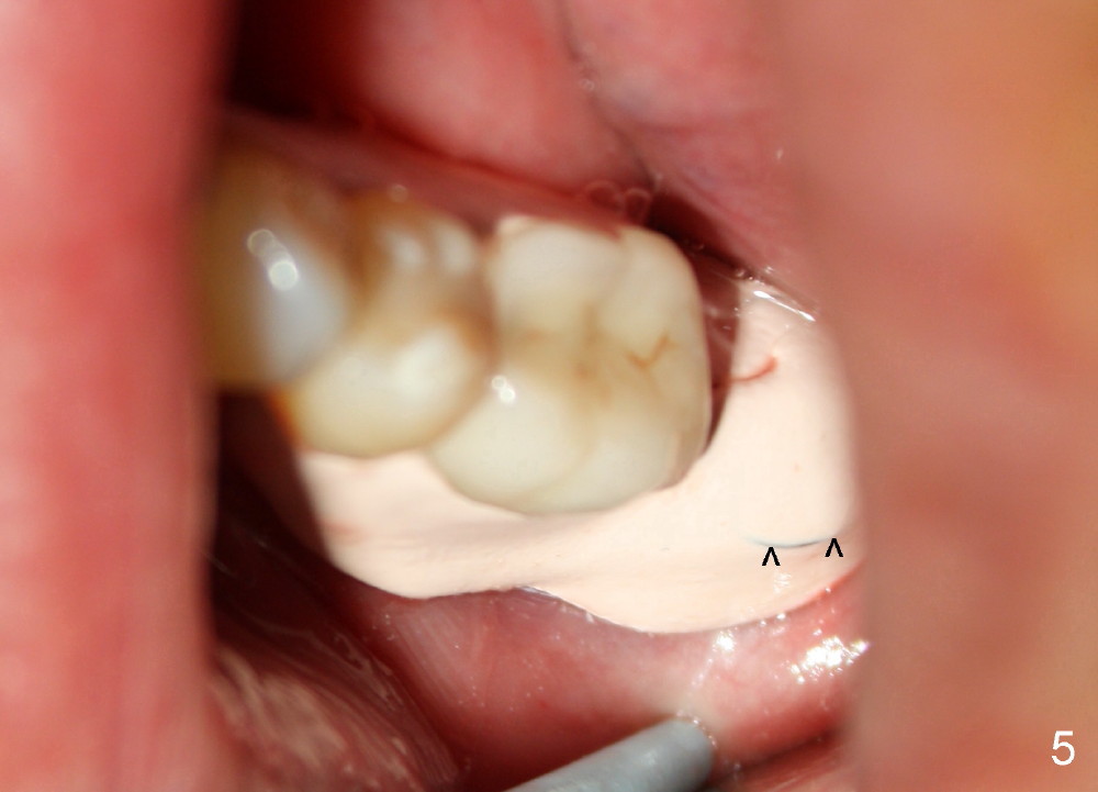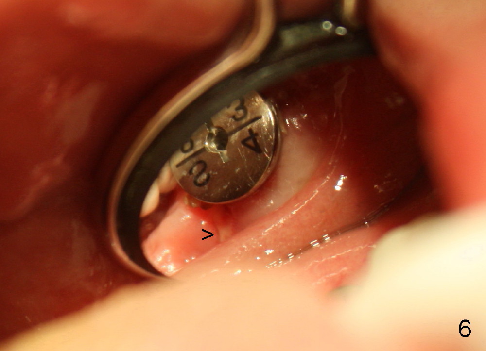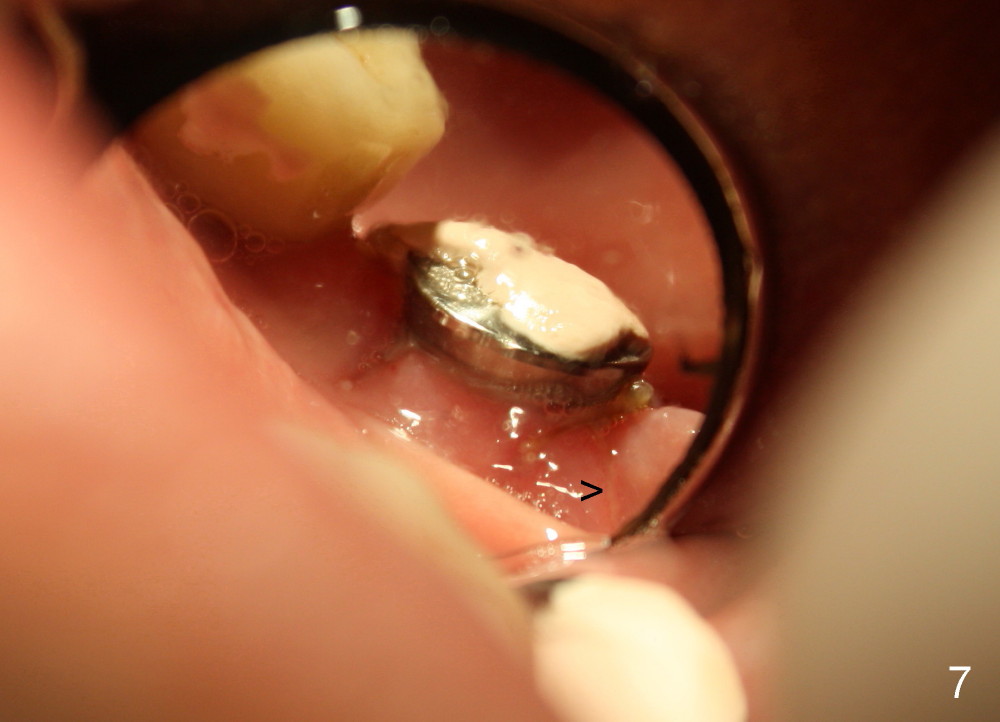 In fact, the perio dressing is dislodged by 8 days postop. The wound is healing (Fig. 6 (buccal), 7 (lingual) mirror views), arrowheads point to the distobuccal and distolingual incisions, respectively.