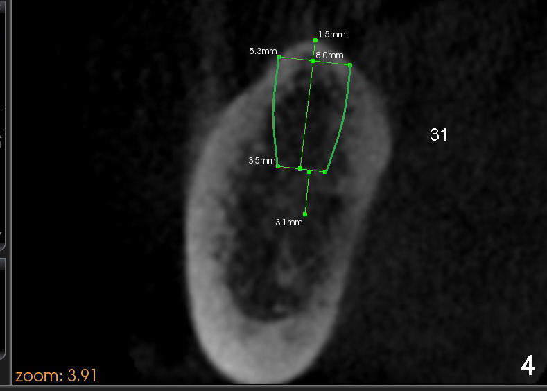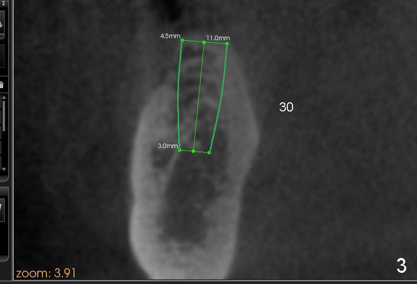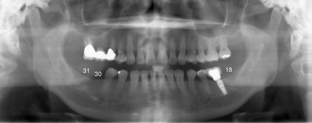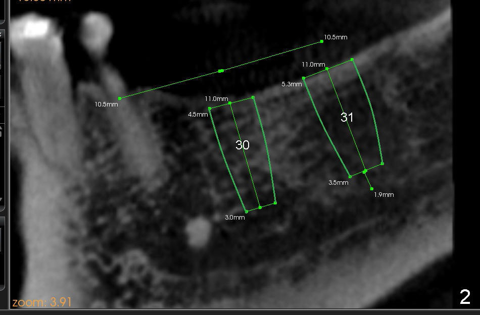 A 56-year-old lady requests implant placement at the sites of #18,30 and 31 (Fig.1, the last two first). CBCT shows preliminary design for implants at #30 and 31 (Fig.2 (sagittal section), 3,4 (coronal)).