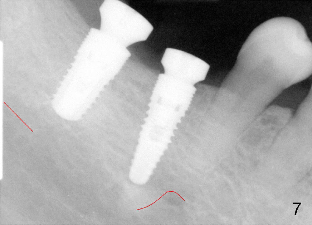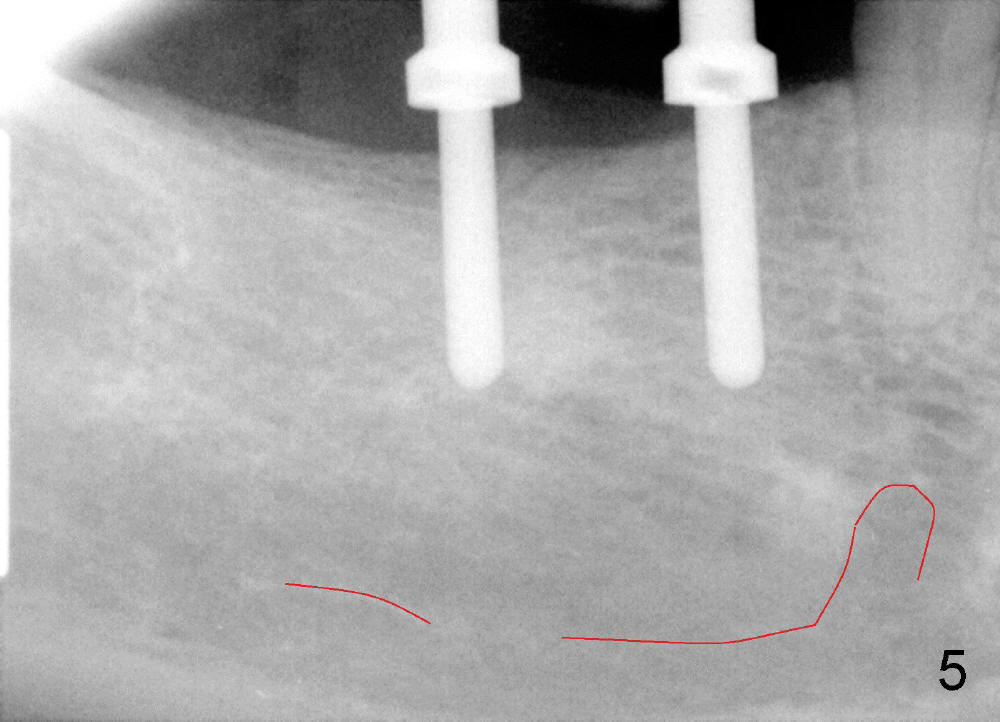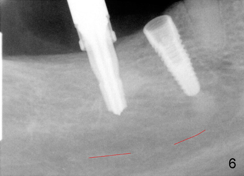 PA is taken after insertion of parallel pins at the depth of 10 and 8 mm at the sites of #30 and 31, respectively (Fig. 5, red line outlines the upper border of the inferior alveolar canal). It appears to be safe to increase the lengths of the implants by 2 mm.