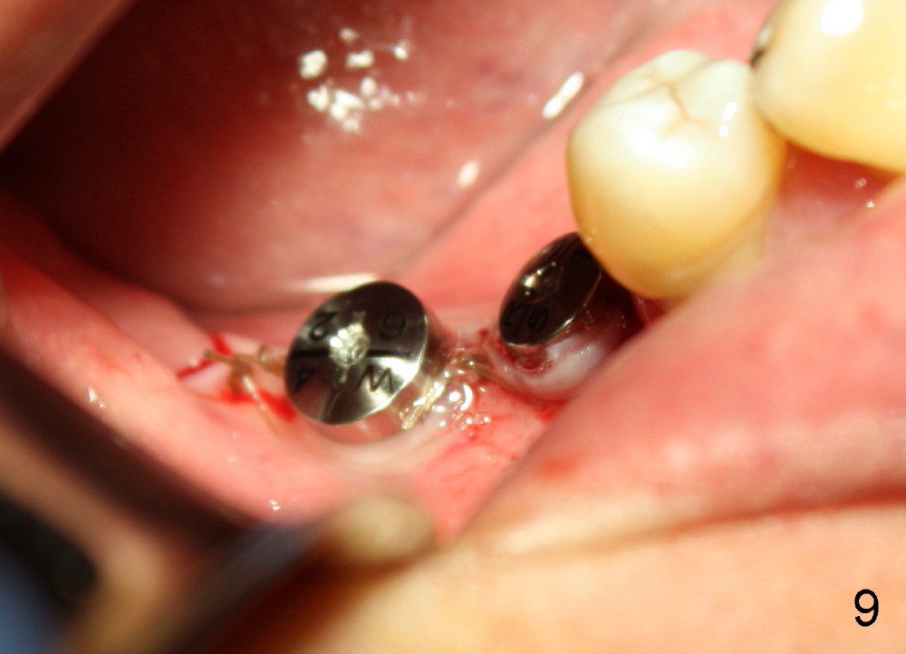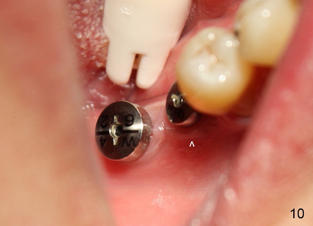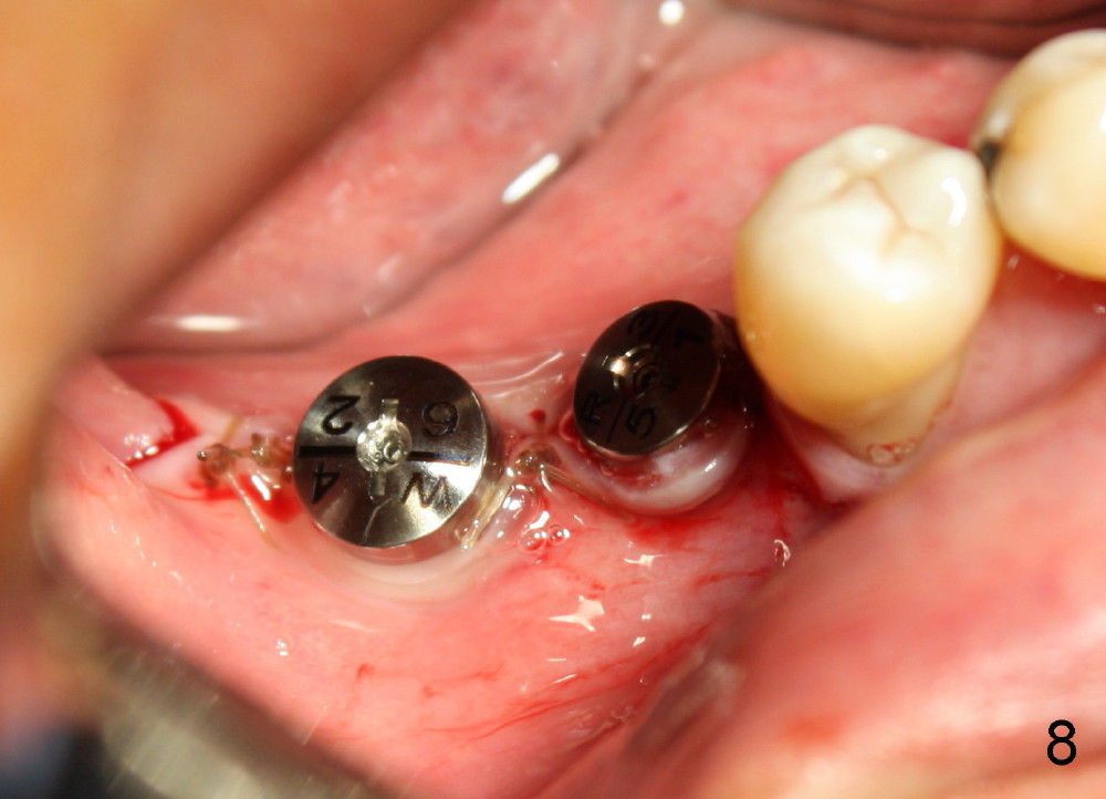 Finally 5.3x10 mm SM implant is placed at #31 (Fig.7). Healing abutments (Ɵ5.2x3(1) and 6.2x4(2) mm) are placed at #30 and 31, respectively (Fig.7-9).