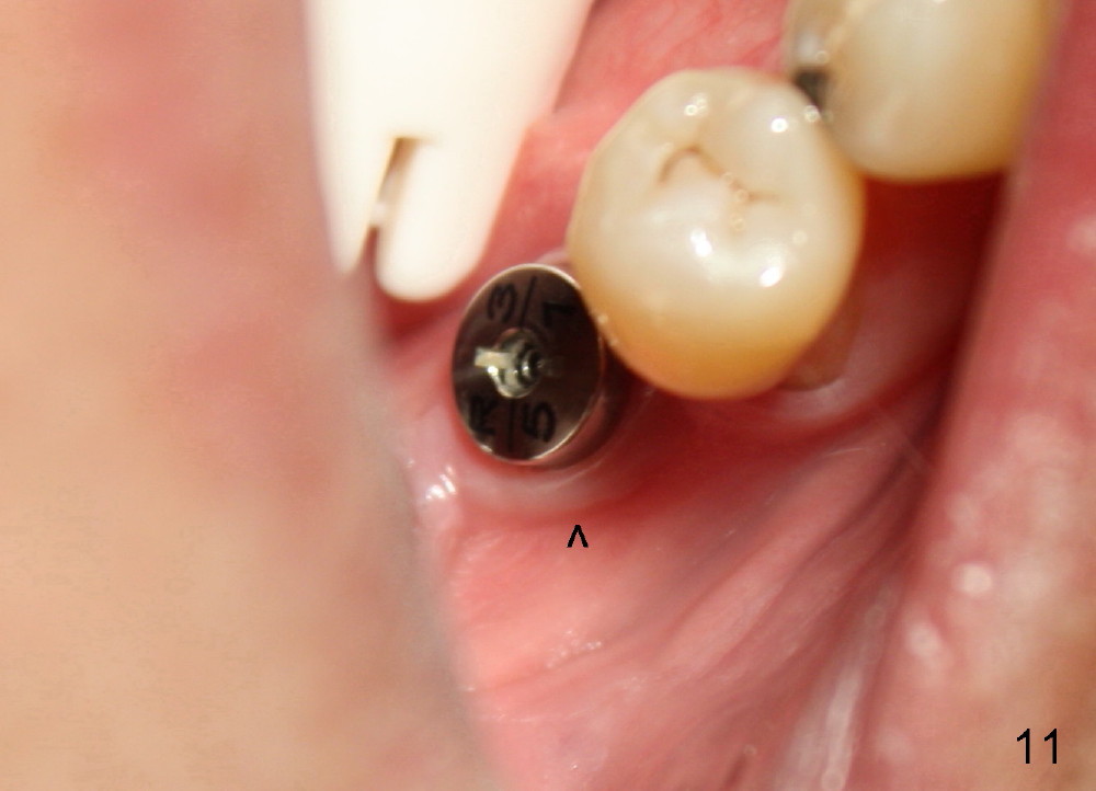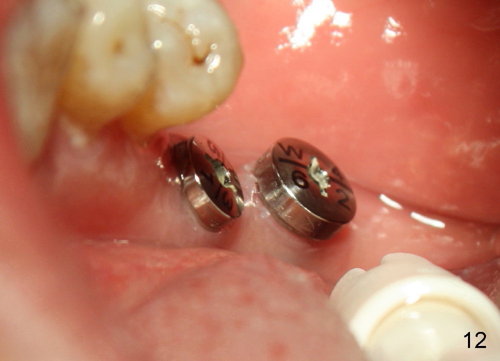 One week postop, the gingiva buccal to #30 healing abutment was reddish (at the area indicated by arrowheads in Fig.10,11). The patient complained facial swelling. Clindamycin was taken one extra week to help resolve postop infection. By 24 days postop, there is no infection around these two healing abutments (Fig.10-12). The patient is pleased and makes an appointment for #18 implant placement (Fig.1), which is more challenging.