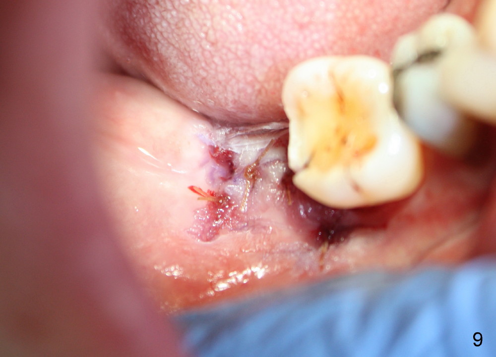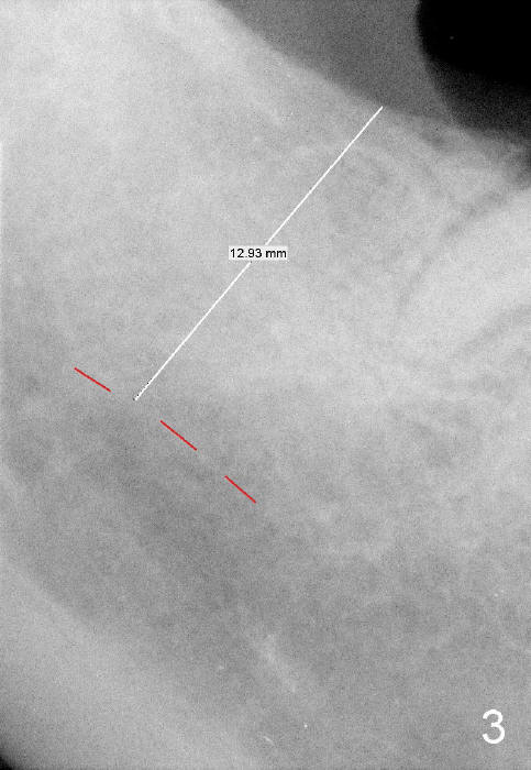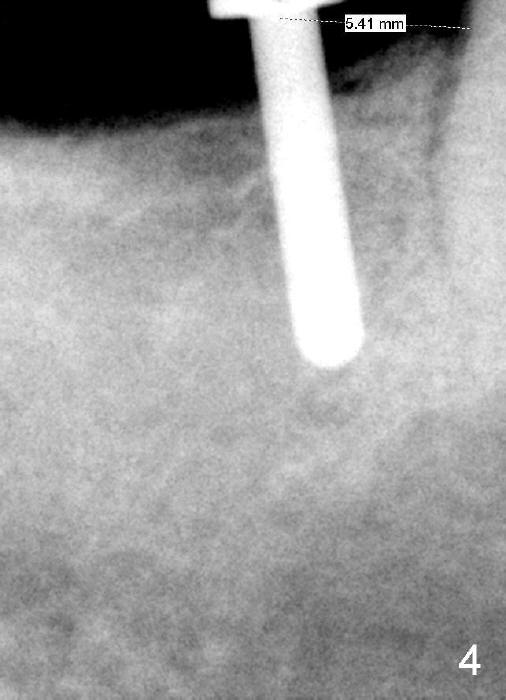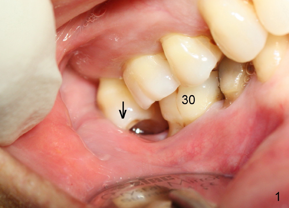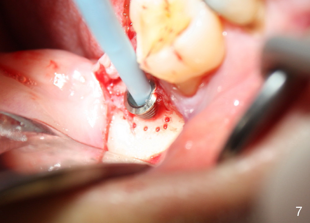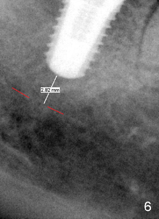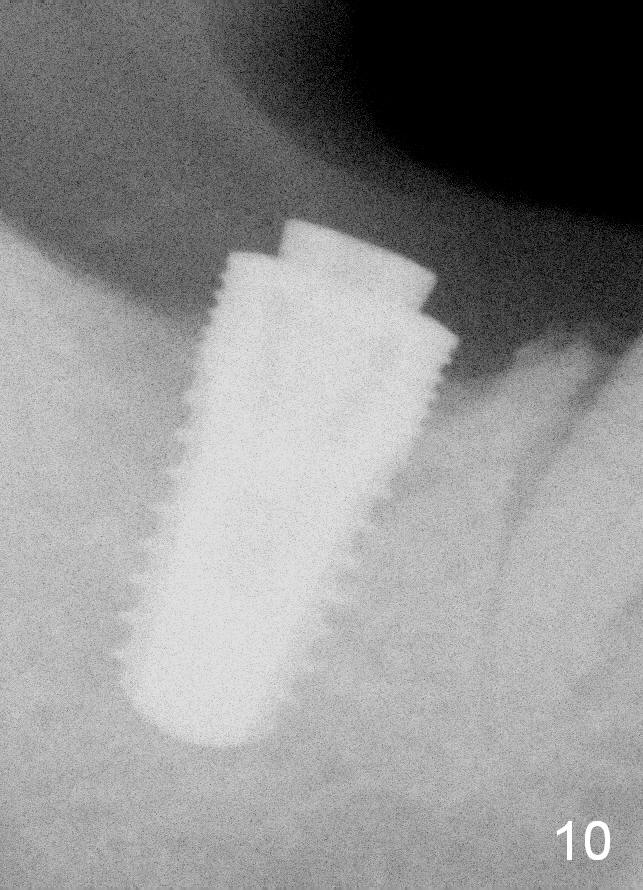 A 57-year-old lady returns for #31 implantation. The vertical edentulous space is limited, as the opposing tooth is supraerupted (Fig.1 arrow). Preop PA is critical (Fig.2), since it is used to measure the bone height (Fig.3: 12 mm). The length of the implant is expected to be 10 mm. The initial osteotomy depth is 8 mm (Fig.4); it appears that the trajectory should be adjusted. Osteotomy increases following depth and angulation adjustment (Fig.5: 4.5x10 mm drill). The submerged implant (5.3x10 mm) is placed with insertion torque approximately 35 Ncm (Fig.6). The buccal microthreads are exposed (Fig.7); to prepare for bone graft, the buccal plate is decorticated. Following placement of freeze dry mineralized allograft, collagen membrane is fixated by a healing screw (Fig.8). The incision is closed by 4-0 Chromic gut sutures and perio glue (Fig.9).