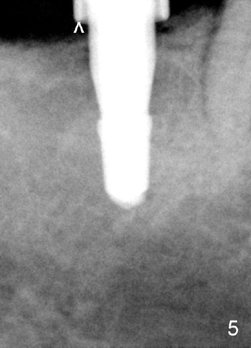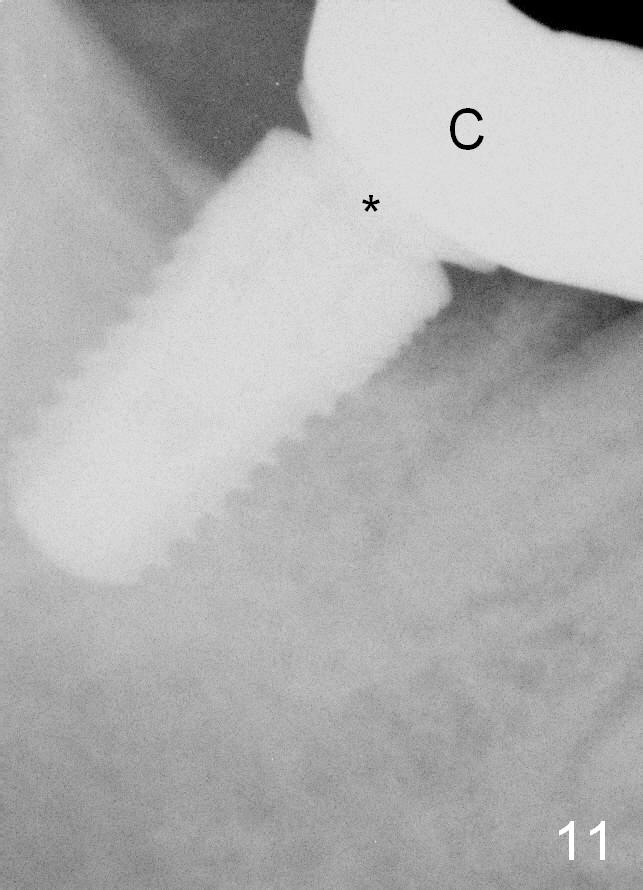 Bone-level implants offer two options after placement (stages 1 and 2). If the insertion torque is high and there is sufficient vertical edentulous space, a healing abutment is placed (stage 1). No surgery is required for restoration. Otherwise, the implant should be buried, as shown in this case. Two mini-implants are going to be placed to intrude the opposing supraerupted tooth. In fact, the orthodontic intrusion is quite difficult. Finally the intrusion apparatus has to be removed prior to chemotherapy for breast cancer. PAs taken 1 year 3 months (Fig.10) and 1 year 9 months (Fig.11, 6 months post cementation) postop appear to show that there is coronal bone loss. An abutment with short cuff (Fig.11 *) is chosen for final crown (C). Ideally the implant should have been placed deeper (Fig.7) for easy restoration. Pre-op examination and diagnosis are critical.