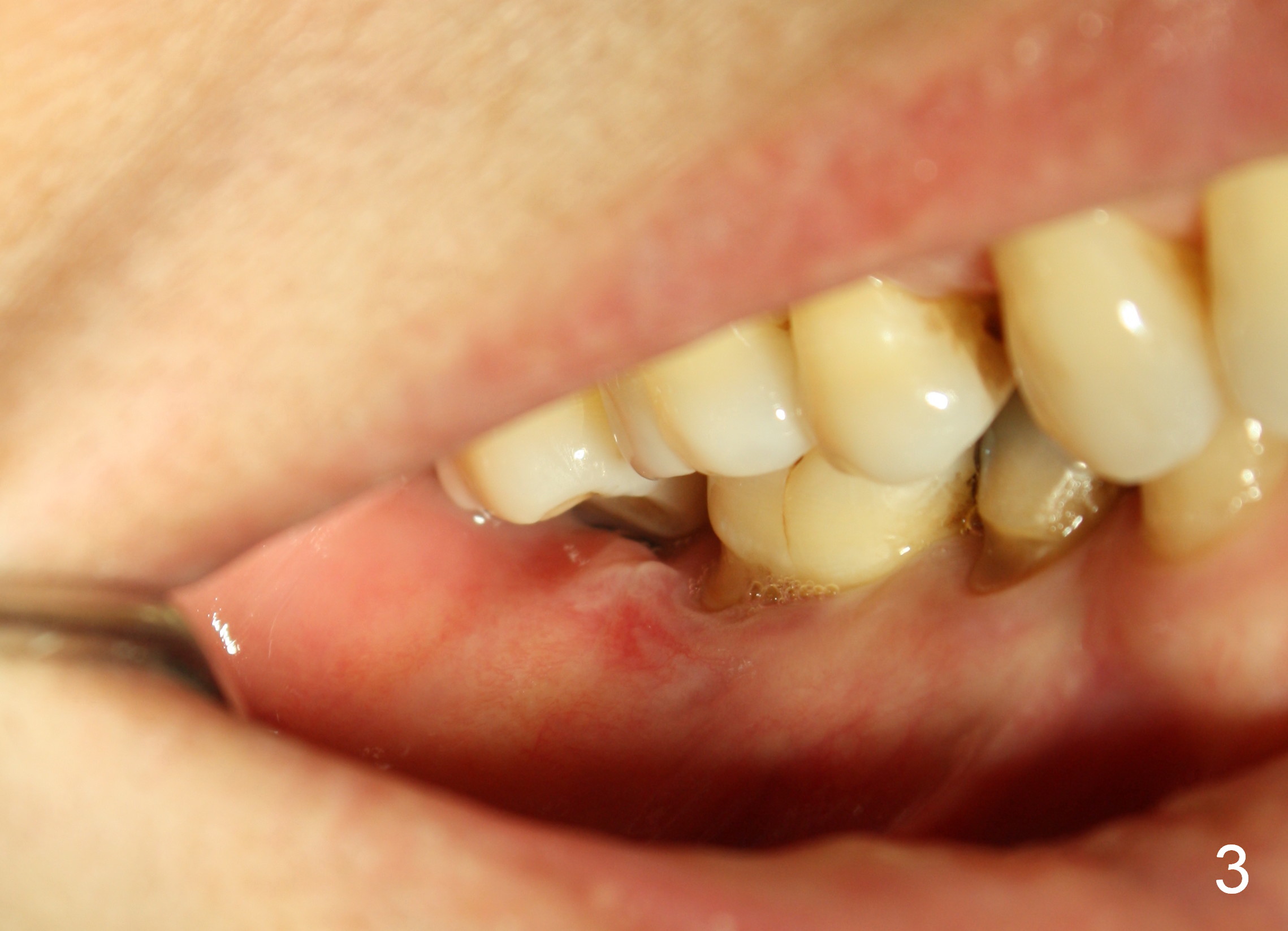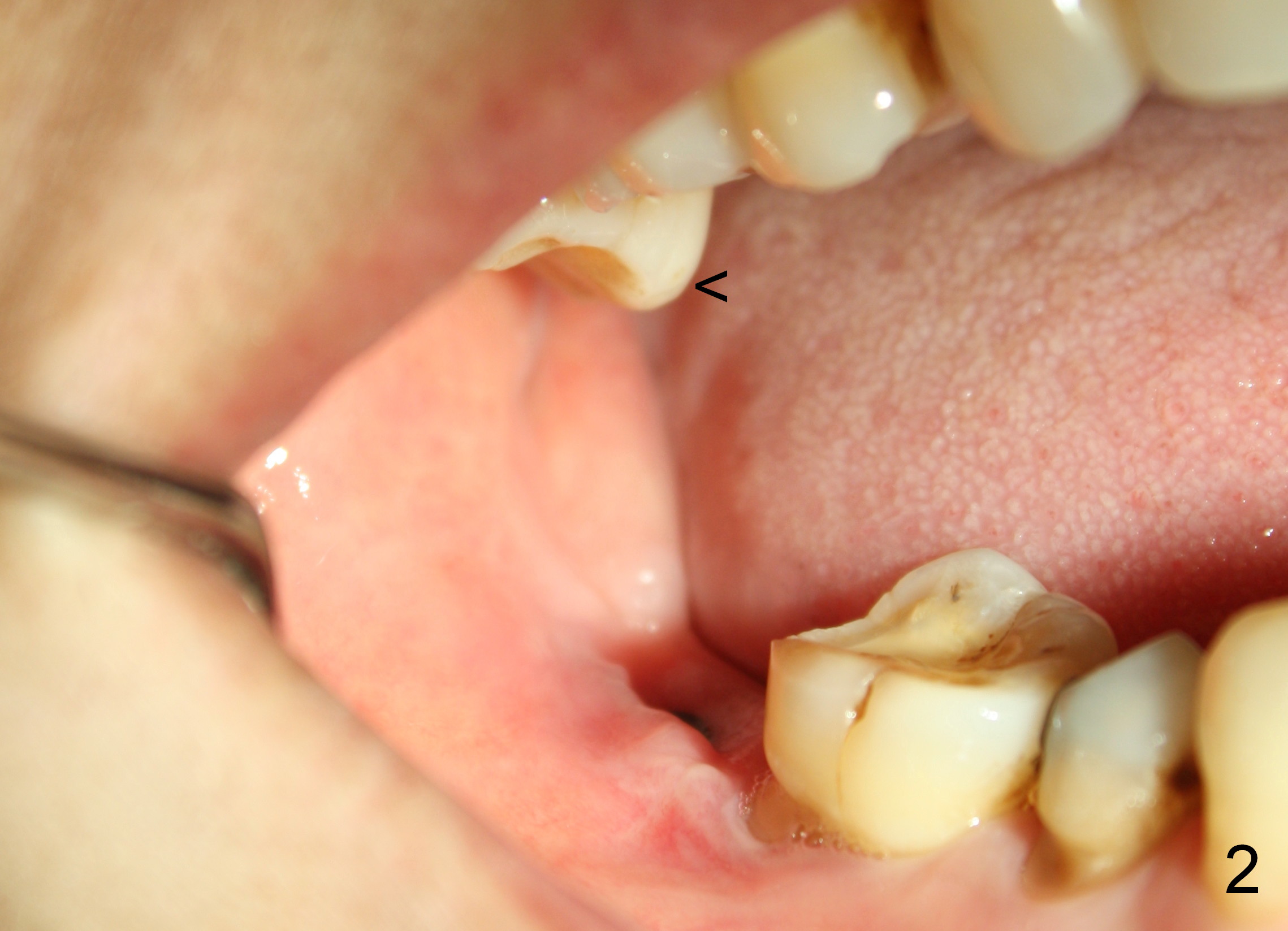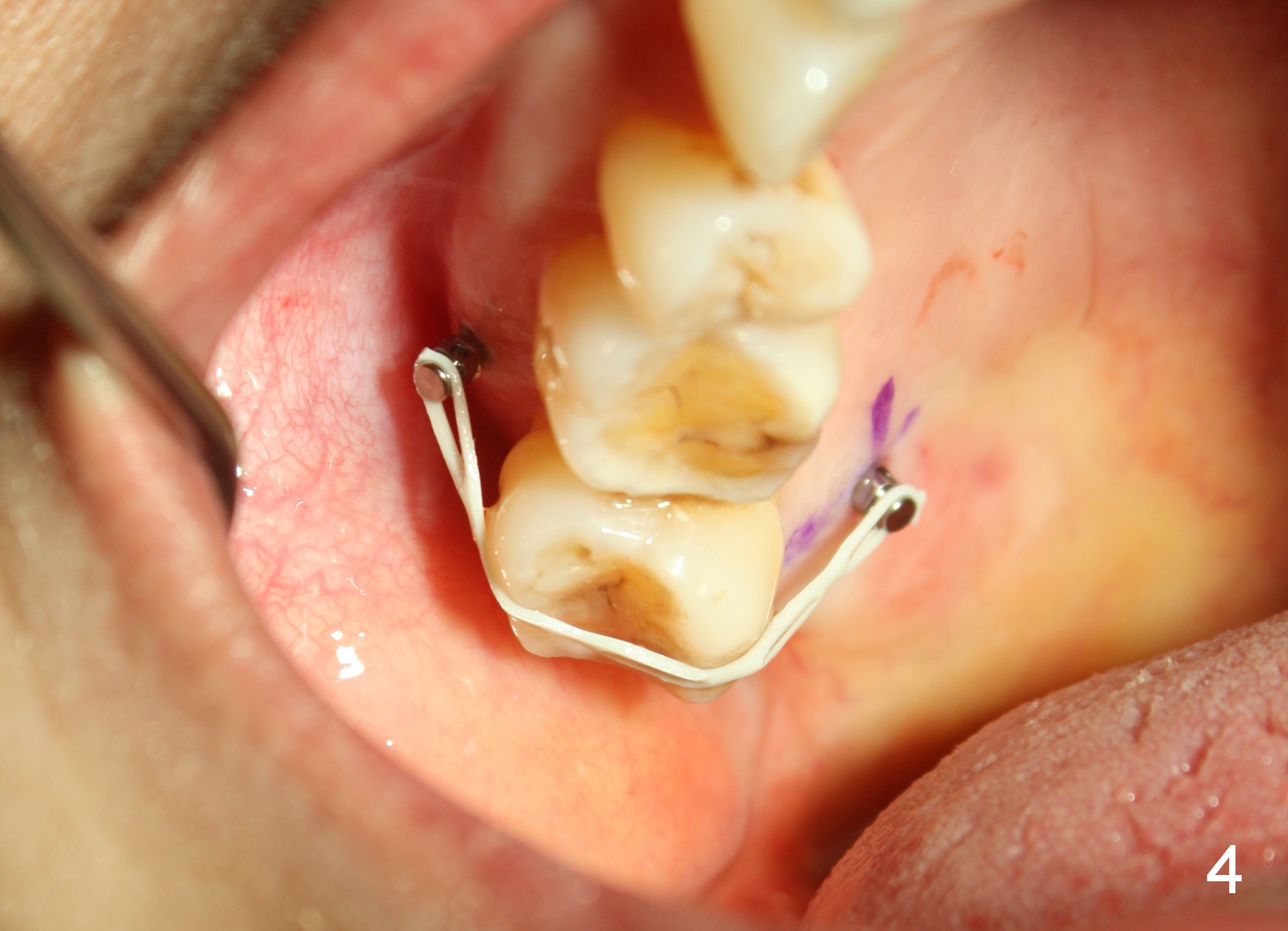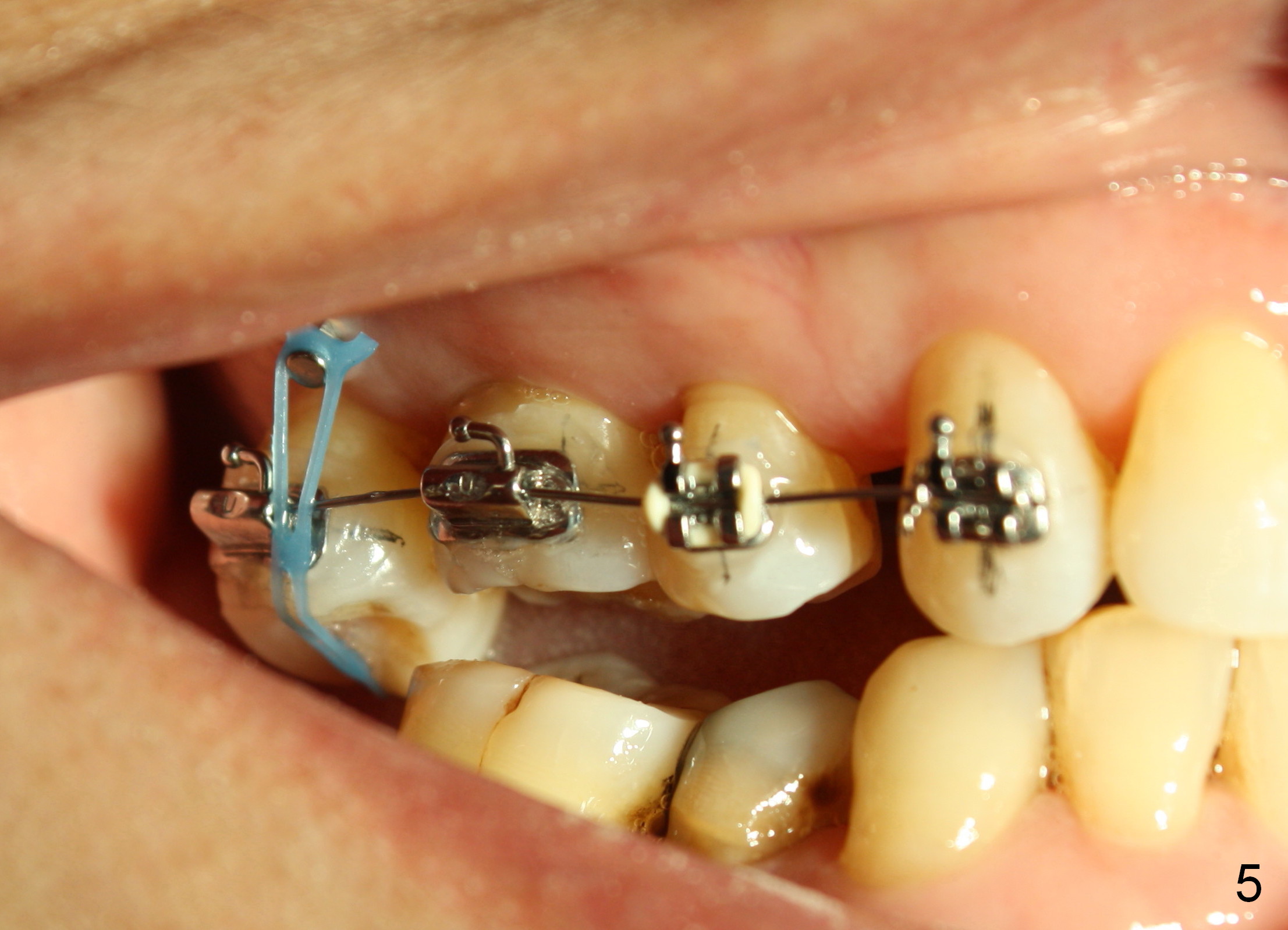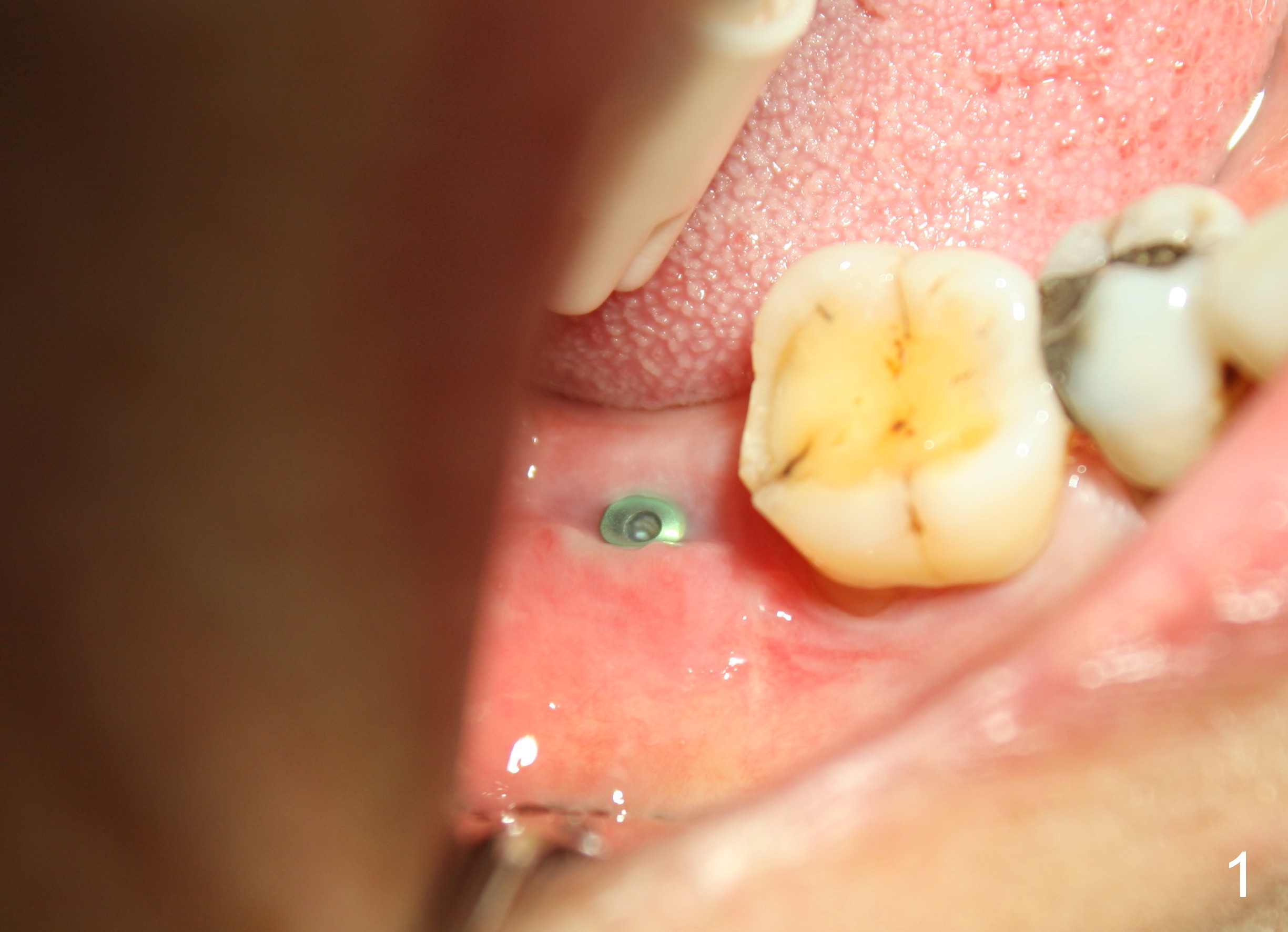 The wound of 2 stage implant surgery is found to be gapping 10 days postop with healing screw exposure 2 weeks postop. Exam at a month postop (Fig.1) shows that the mesiolingual cusp of the upper right 2nd molar is sharp (Fig.2 <) and inserted into the wound of the implant site (Fig.3). Two mini-implants are placed with immediate power chain retraction (Fig.4). The orthodontic intrusion is without effect; brackets are placed 4 months later (Fig.5). Two months later, the patient is diagnosed to have breast cancer. As a precaution for chemotherapy, the orthodontic device is removed. During chemotherapy, the patient returns once. The gingiva around the cover screw is mildly erythematous and edematous. After removing plaque from the cover screw with irrigation, the patient feels a little better. All of the orthodontic appliances are removed before she receives chemotherapy for breast cancer.
