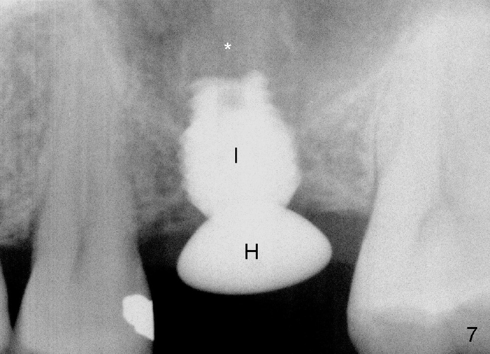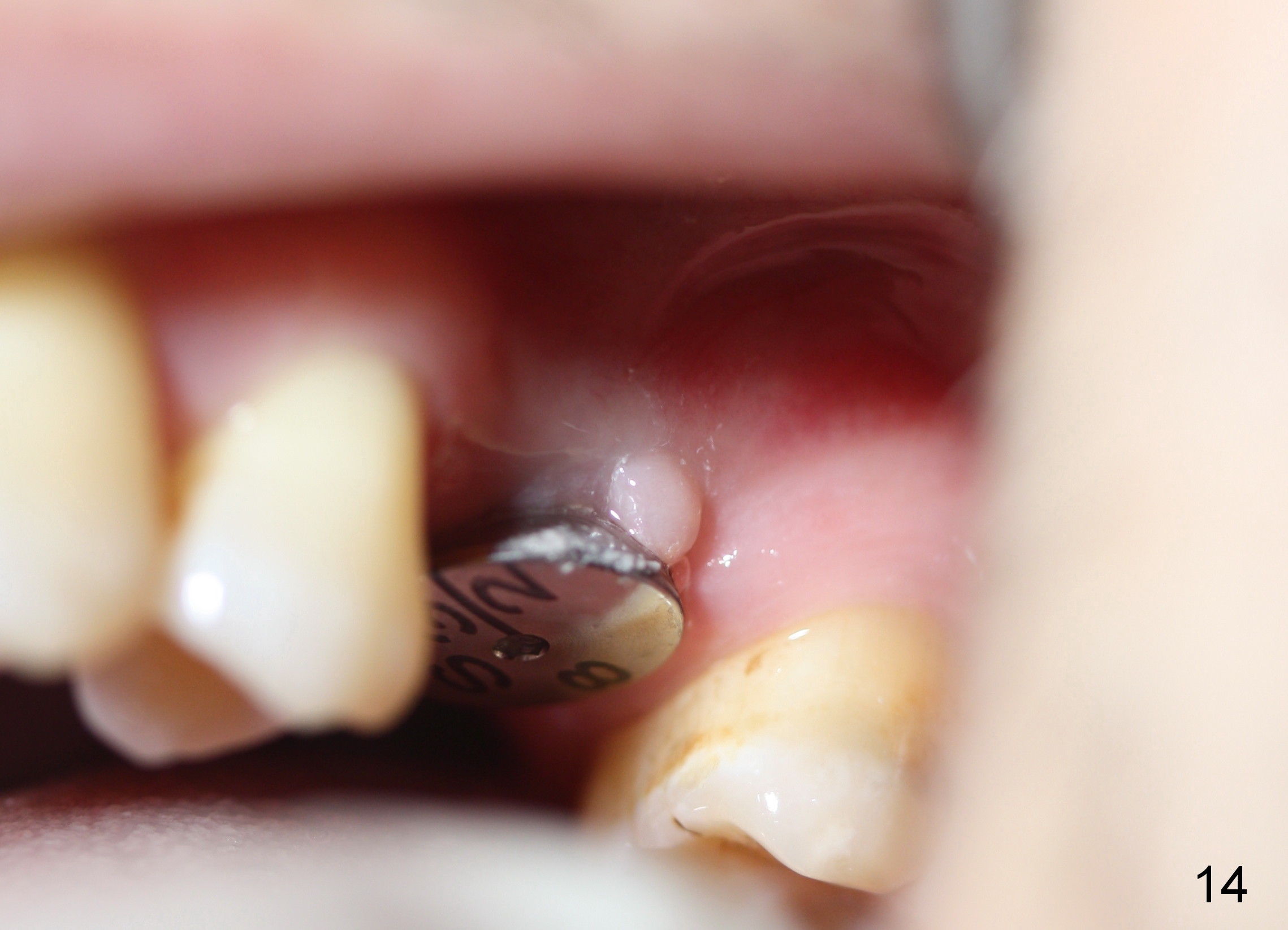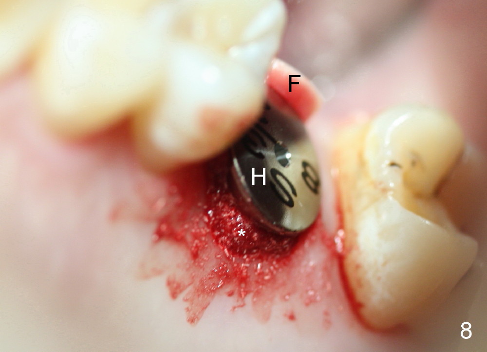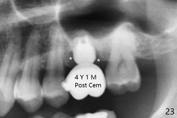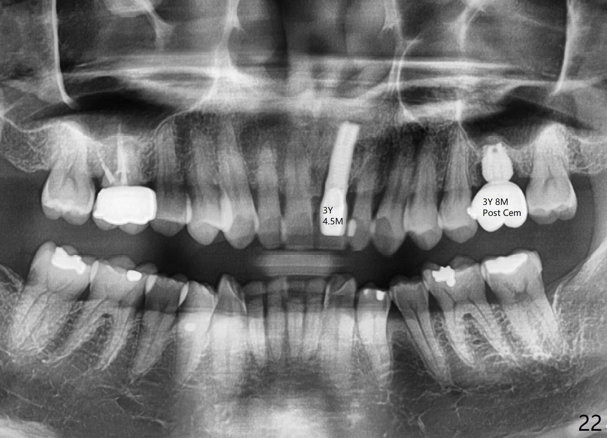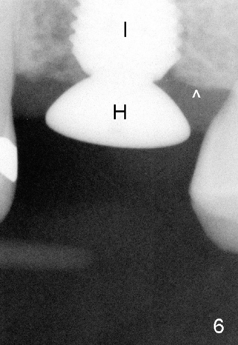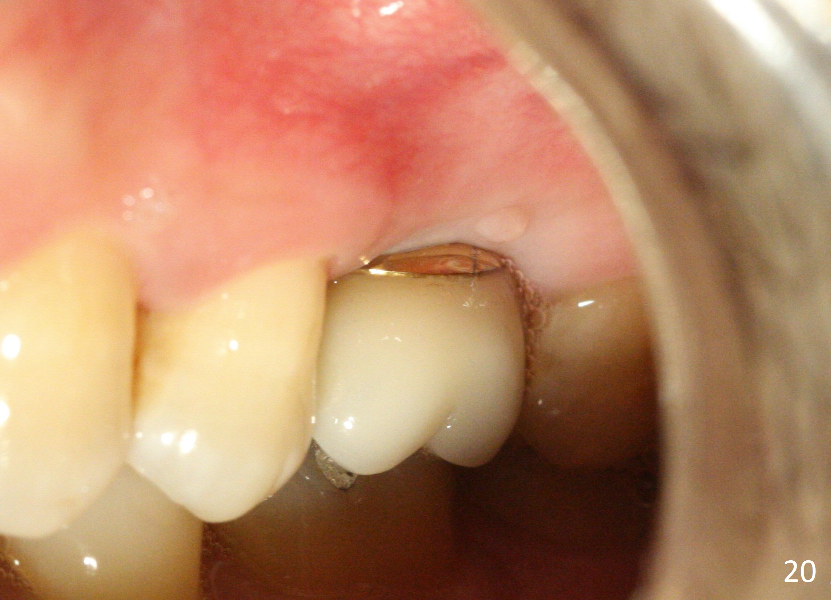 A 45-year-old man has lost the tooth #14 for a while (Fig.1); bone height is 5.4 mm. An extra wide and short implant is planned. Torus palatinus is large, suggesting that bone density should be high. A 6 mm tissue punch is chosen, but it is placed more palatal. If it were placed in the middle of the ridge, there would be no buccal keratinized gingiva (incision may avoid this issue). Additionally, the buccal portion of punch is made incomplete so that there is pedicle on the buccal side when the flap is raised (Fig.4,8: F). It is expected that the excess portion of keratinized tissue will form thick gingiva buccally. Osteotomy proves that bone is dense (Fig.2 (4.5x11 mm tap). Typical sinus lift is finished with placement of 6.4x6 mm (extra wide) bone-level implant (Fig.3, >55 Ncm). Following further torque, Fig.4 shows that the implant (I) is sub-gingival (<). Bitewings are taken to confirm that the implant plateau is at the crestal level (Fig.5,6 ^). PA shows sinus lift (Fig.7 *). The lingual aspect of the implant and healing abutment (H) is further bone grafted and covered by collagen dressing (Fig.8 *). The wound is protected with perio dressing. When the latter dislodges 7 days postop, the collagen dressing and bone graft are lost as well (Fig.10), while the buccal flap remains vital (Fig.9). The lingual exposed plateau should be able to heal normal. The collagen dressing should have been fixed in place by suture or as simple as a dental floss. There is mild nasal hemorrhage 1-2 days postop, possibly related to sinus membrane perforation and inability of Collagen Dressing to cover the perforation and contain the bone graft. When the patient returns for #9 implant placement in 3 weeks postop, the buccal flap reduces in size (Fig.11 *), while the palatal wound has healed with minimal exposure of the implant (Fig.12). Sinus graft remains in place 3 months postop (Fig.13); the buccal flap appears to have incorporated into a part of the gingiva (Fig.14). The bone density of the sinus lift appears to increase 10 days later when an abutment is placed (Fig.15 *). Although oral hygiene is pristine, there is apparent crestal bone resorption 12 months (Fig.16) and 20 months (Fig.17) post cementation, probably due to unfavorable crown/implant ratio and bruxism as well as pre-implantation bone loss (Fig.18,19). In contrast, an immediate implant in the same patient avoids pre- or post-implantation bone loss. In fact both the soft (Fig.20) and hard (Fig.21) tissues remain healthy 2 years 8 months post cementation. The sinus lift remains 3 years 8 months post cementation (Fig.22), while the crestal bone loss persists. The patients keeps complains of food impaction distal associated with bad smell 4 years 1 month post cementation. In fact the distal proximal contact is within normal limit. The bad smell is probably due to crestal bone loss (Fig.23 (pan), 24 (CT) *) and periimplantitis. Bone graft, PRF and Cytoplast membrane will be needed and fixed in place with long healing screw. When the patient returns for crown redo, he also reveals floss related gingival hemorrhage. There is pain associated with palatal sulcus probing with light gingiva erythema. Review of CT coronal section shows possible palatal (Fig.25 P) bone loss (*).