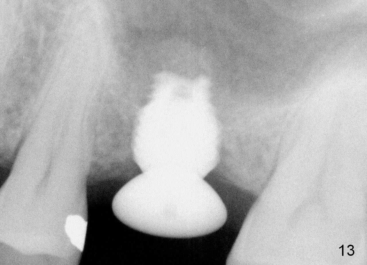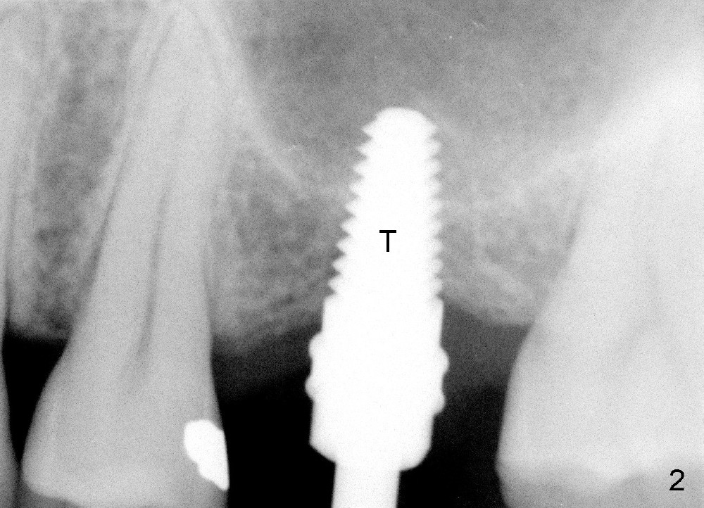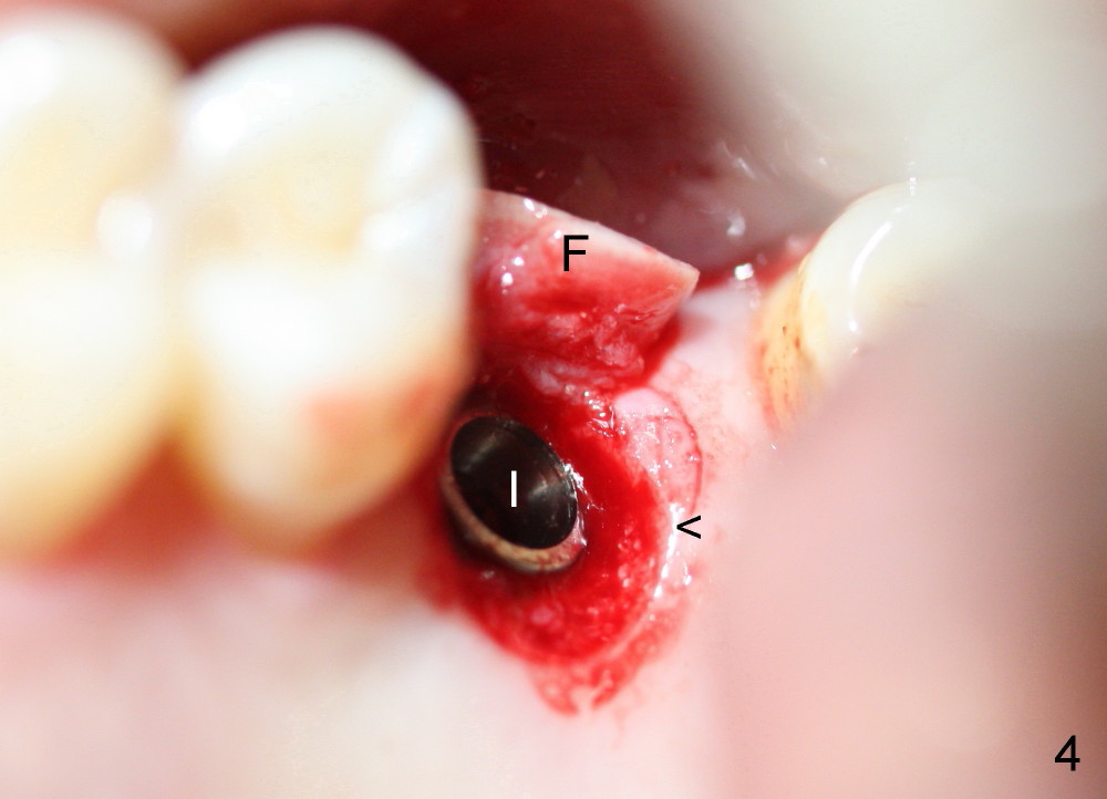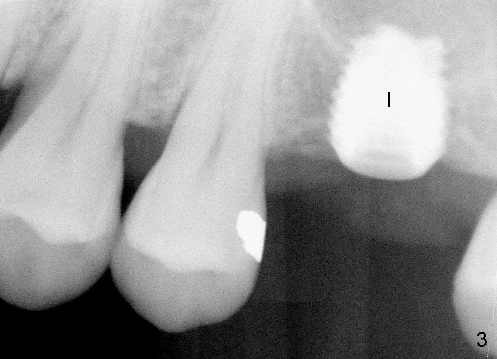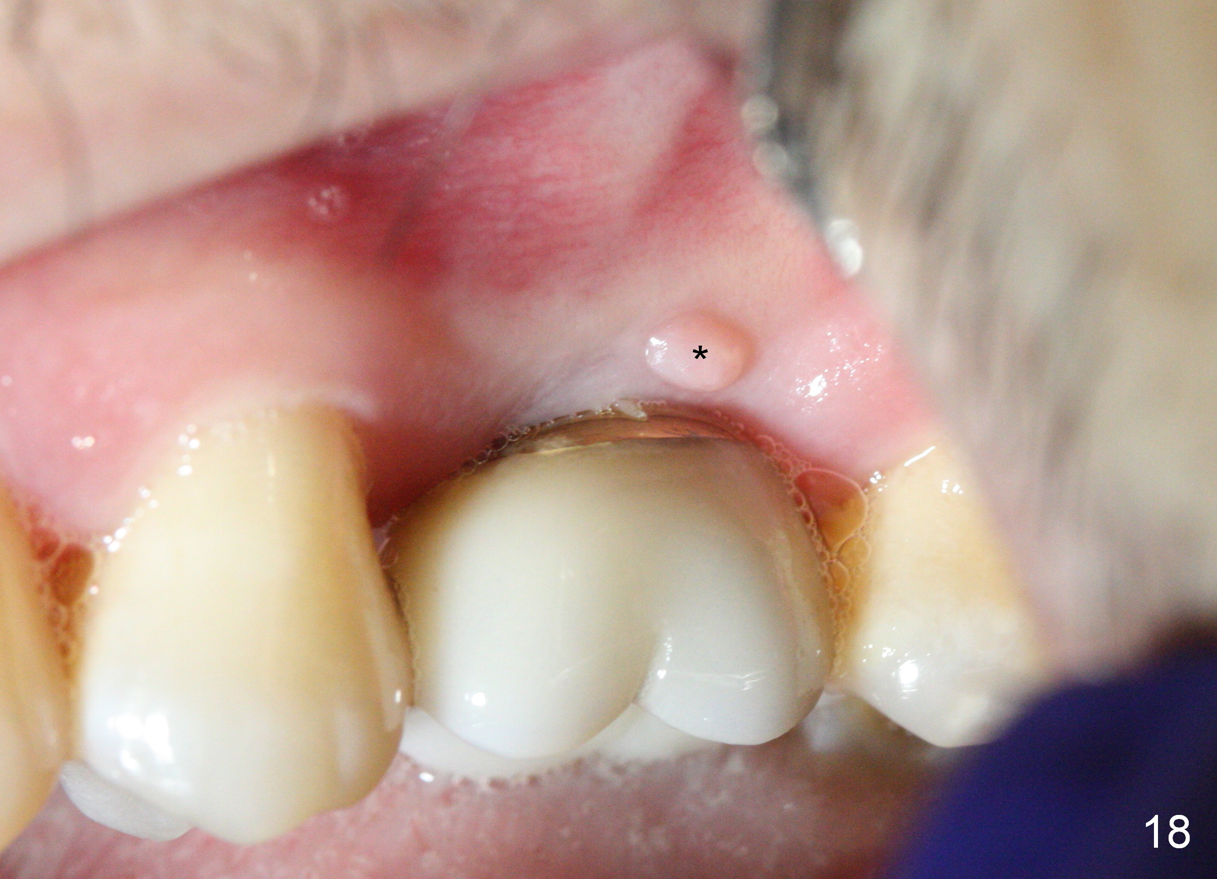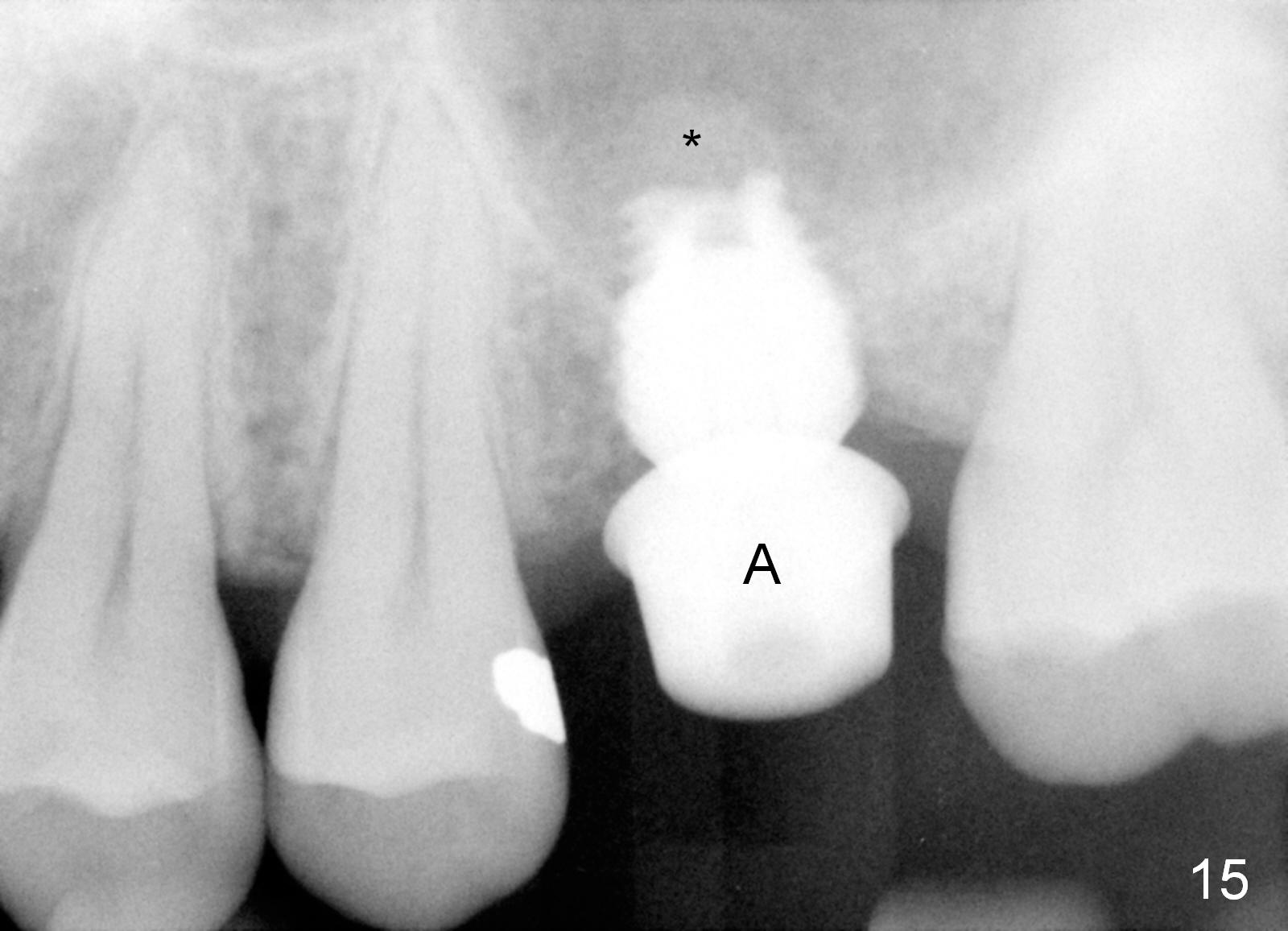 A 45-year-old man has lost the tooth #14 for a while (Fig.1); bone height is 5.4 mm. An extra wide and short implant is planned. Torus palatinus is large, suggesting that bone density should be high. A 6 mm tissue punch is chosen, but it is placed more palatal. If it were placed in the middle of the ridge, there would be no buccal keratinized gingiva (incision may avoid this issue). Additionally, the buccal portion of punch is made incomplete so that there is pedicle on the buccal side when the flap is raised (Fig.4,8: F). It is expected that the excess portion of keratinized tissue will form thick gingiva buccally. Osteotomy proves that bone is dense (Fig.2 (4.5x11 mm tap). Typical sinus lift is finished with placement of 6.4x6 mm (extra wide) bone-level implant (Fig.3, >55 Ncm). Following further torque, Fig.4 shows that the implant (I) is sub-gingival (<). Bitewings are taken to confirm that the implant plateau is at the crestal level (Fig.5,6 ^). PA shows sinus lift (Fig.7 *). The lingual aspect of the implant and healing abutment (H) is further bone grafted and covered by collagen dressing (Fig.8 *). The wound is protected with perio dressing. When the latter dislodges 7 days postop, the collagen dressing and bone graft are lost as well (Fig.10), while the buccal flap remains vital (Fig.9). The lingual exposed plateau should be able to heal normal. The collagen dressing should have been fixed in place by suture or as simple as a dental floss. There is mild nasal hemorrhage 1-2 days postop, possibly related to sinus membrane perforation and inability of Collagen Dressing to cover the perforation and contain the bone graft. When the patient returns for #9 implant placement in 3 weeks postop, the buccal flap reduces in size (Fig.11 *), while the palatal wound has healed with minimal exposure of the implant (Fig.12). Sinus graft remains in place 3 months postop (Fig.13); the buccal flap appears to have incorporated into a part of the gingiva (Fig.14). The bone density of the sinus lift appears to increase 10 days later when an abutment is placed (Fig.15 *). Although oral hygiene is pristine, there is apparent crestal bone resorption 12 months (Fig.16) and 20 months (Fig.17) post cementation, probably due to unfavorable crown/implant ratio and bruxism as well as pre-implantation bone loss (Fig.18,19). In contrast, an immediate implant in the same patient avoids pre- or post-implantation bone loss. In fact both the soft (Fig.20) and hard (Fig.21) tissues remain healthy 2 years 8 months post cementation. The sinus lift remains 3 years 8 months post cementation (Fig.22), while the crestal bone loss persists. The patients keeps complains of food impaction distal associated with bad smell 4 years 1 month post cementation. In fact the distal proximal contact is within normal limit. The bad smell is probably due to crestal bone loss (Fig.23 (pan), 24 (CT) *) and periimplantitis. Bone graft, PRF and Cytoplast membrane will be needed and fixed in place with long healing screw. When the patient returns for crown redo, he also reveals floss related gingival hemorrhage. There is pain associated with palatal sulcus probing with light gingiva erythema. Review of CT coronal section shows possible palatal (Fig.25 P) bone loss (*).