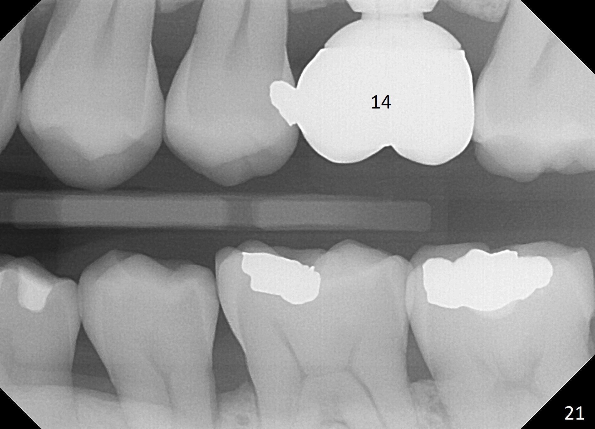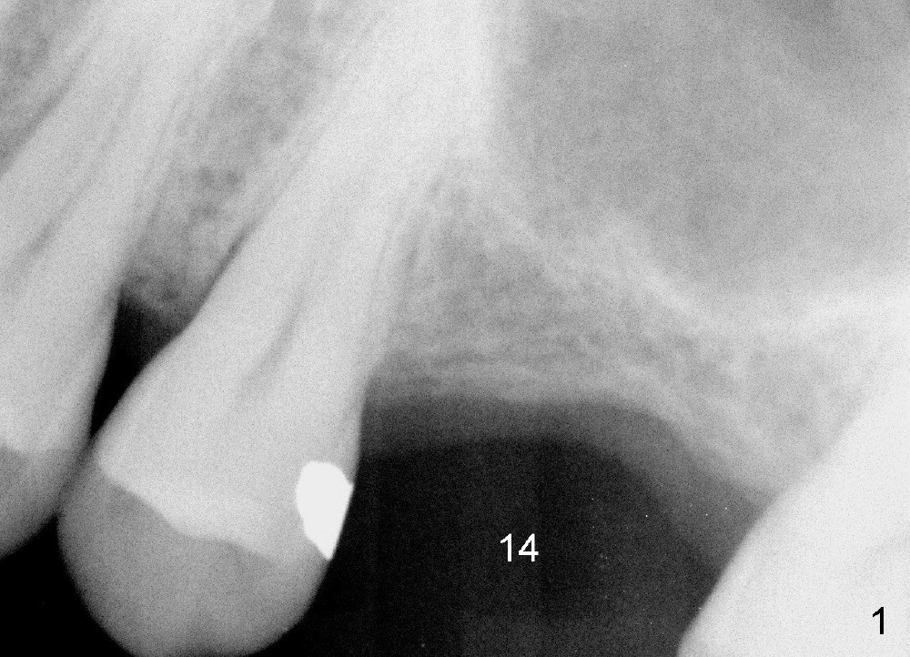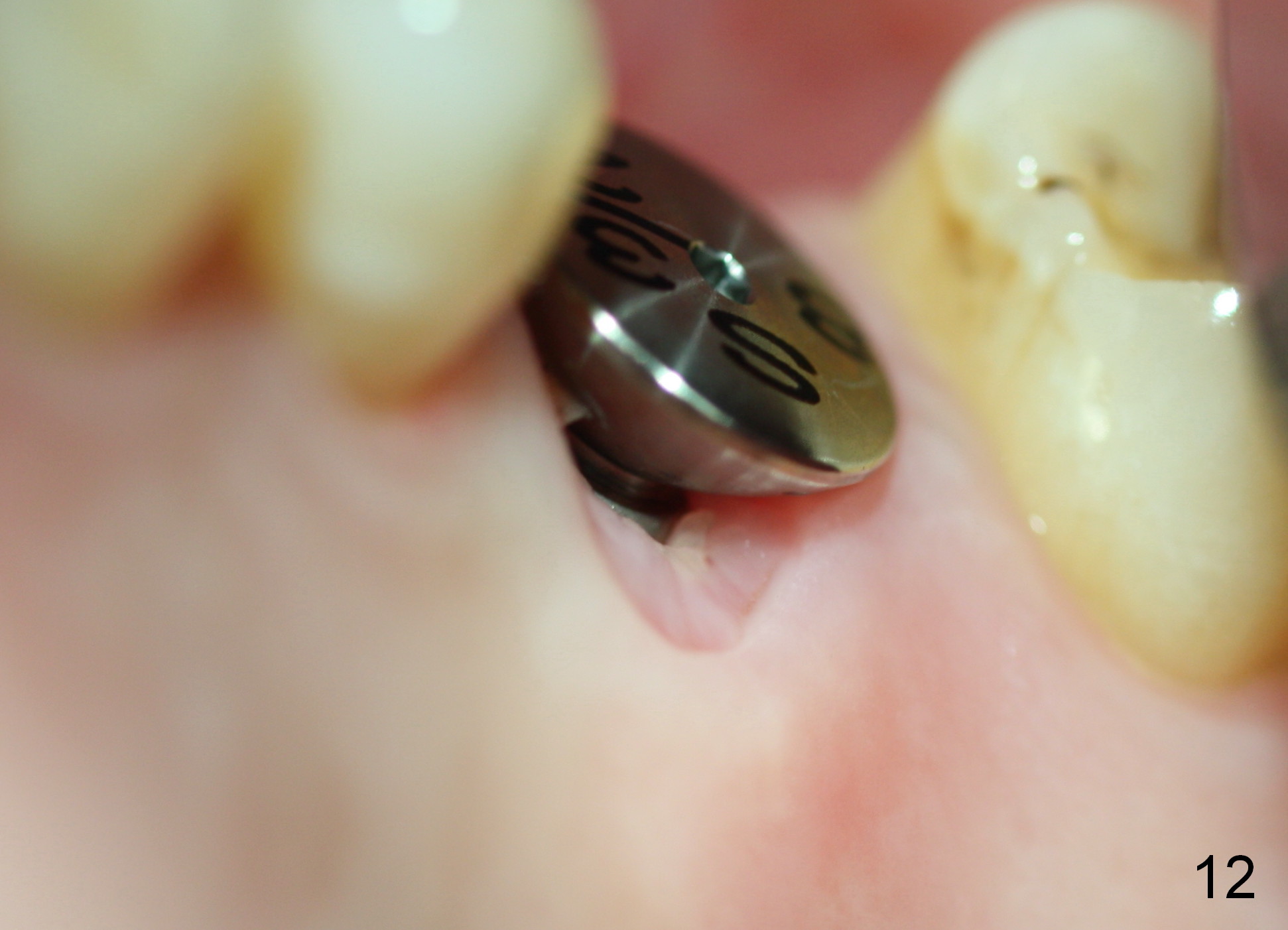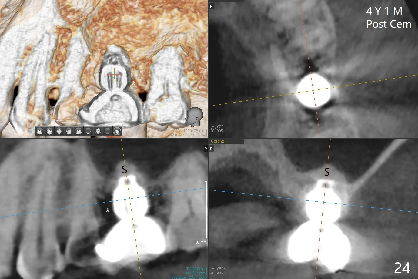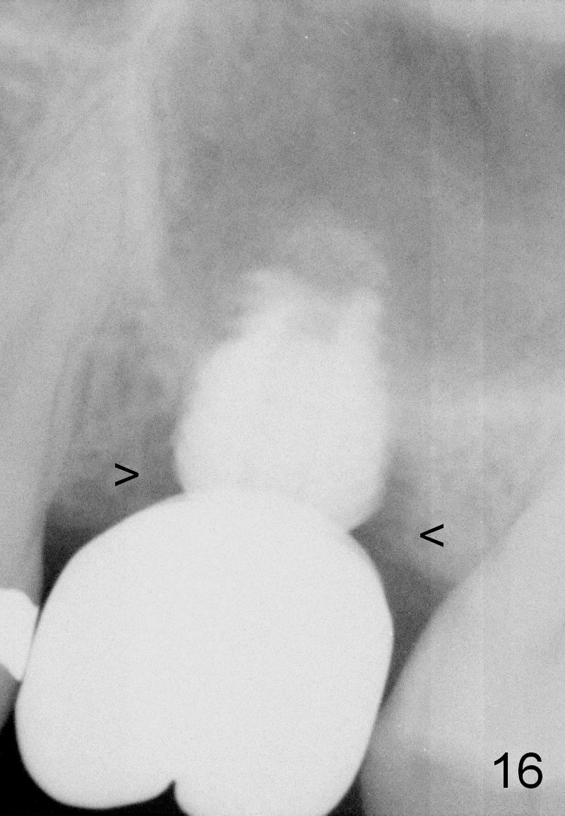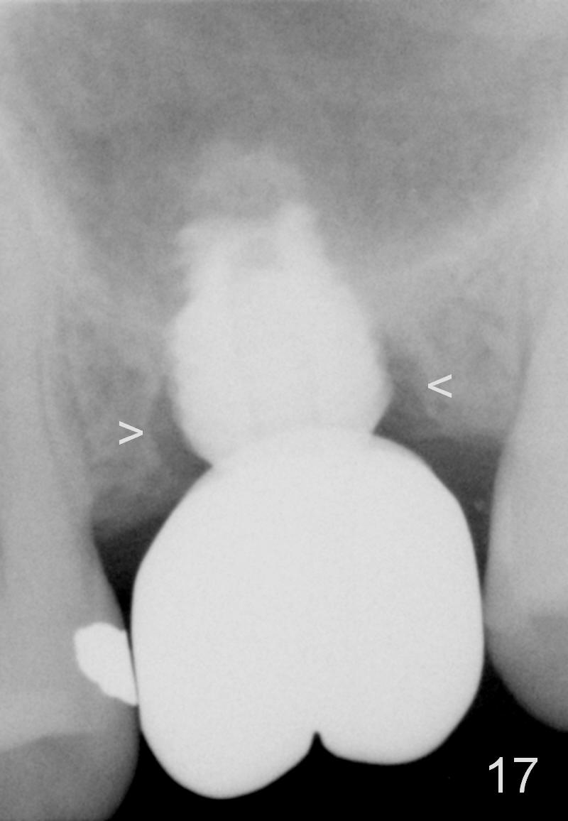 A 45-year-old man has lost the tooth #14 for a while (Fig.1); bone height is 5.4 mm. An extra wide and short implant is planned. Torus palatinus is large, suggesting that bone density should be high. A 6 mm tissue punch is chosen, but it is placed more palatal. If it were placed in the middle of the ridge, there would be no buccal keratinized gingiva (incision may avoid this issue). Additionally, the buccal portion of punch is made incomplete so that there is pedicle on the buccal side when the flap is raised (Fig.4,8: F). It is expected that the excess portion of keratinized tissue will form thick gingiva buccally. Osteotomy proves that bone is dense (Fig.2 (4.5x11 mm tap). Typical sinus lift is finished with placement of 6.4x6 mm (extra wide) bone-level implant (Fig.3, >55 Ncm). Following further torque, Fig.4 shows that the implant (I) is sub-gingival (<). Bitewings are taken to confirm that the implant plateau is at the crestal level (Fig.5,6 ^). PA shows sinus lift (Fig.7 *). The lingual aspect of the implant and healing abutment (H) is further bone grafted and covered by collagen dressing (Fig.8 *). The wound is protected with perio dressing. When the latter dislodges 7 days postop, the collagen dressing and bone graft are lost as well (Fig.10), while the buccal flap remains vital (Fig.9). The lingual exposed plateau should be able to heal normal. The collagen dressing should have been fixed in place by suture or as simple as a dental floss. There is mild nasal hemorrhage 1-2 days postop, possibly related to sinus membrane perforation and inability of Collagen Dressing to cover the perforation and contain the bone graft. When the patient returns for #9 implant placement in 3 weeks postop, the buccal flap reduces in size (Fig.11 *), while the palatal wound has healed with minimal exposure of the implant (Fig.12). Sinus graft remains in place 3 months postop (Fig.13); the buccal flap appears to have incorporated into a part of the gingiva (Fig.14). The bone density of the sinus lift appears to increase 10 days later when an abutment is placed (Fig.15 *). Although oral hygiene is pristine, there is apparent crestal bone resorption 12 months (Fig.16) and 20 months (Fig.17) post cementation, probably due to unfavorable crown/implant ratio and bruxism as well as pre-implantation bone loss (Fig.18,19). In contrast, an immediate implant in the same patient avoids pre- or post-implantation bone loss. In fact both the soft (Fig.20) and hard (Fig.21) tissues remain healthy 2 years 8 months post cementation. The sinus lift remains 3 years 8 months post cementation (Fig.22), while the crestal bone loss persists. The patients keeps complains of food impaction distal associated with bad smell 4 years 1 month post cementation. In fact the distal proximal contact is within normal limit. The bad smell is probably due to crestal bone loss (Fig.23 (pan), 24 (CT) *) and periimplantitis. Bone graft, PRF and Cytoplast membrane will be needed and fixed in place with long healing screw. When the patient returns for crown redo, he also reveals floss related gingival hemorrhage. There is pain associated with palatal sulcus probing with light gingiva erythema. Review of CT coronal section shows possible palatal (Fig.25 P) bone loss (*).