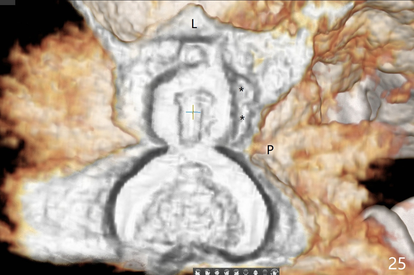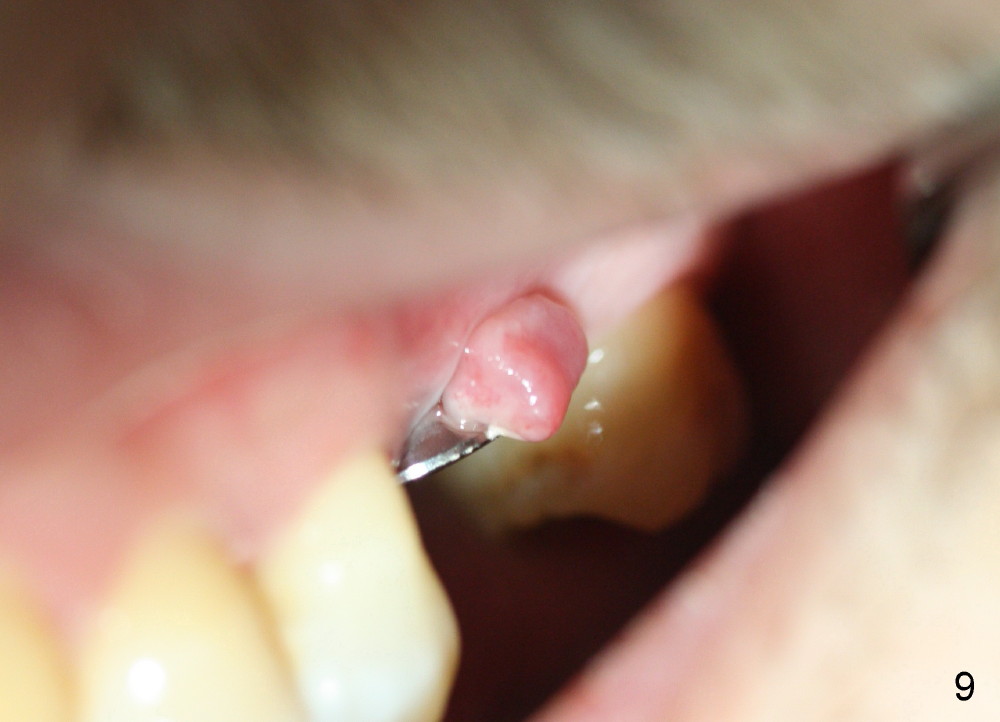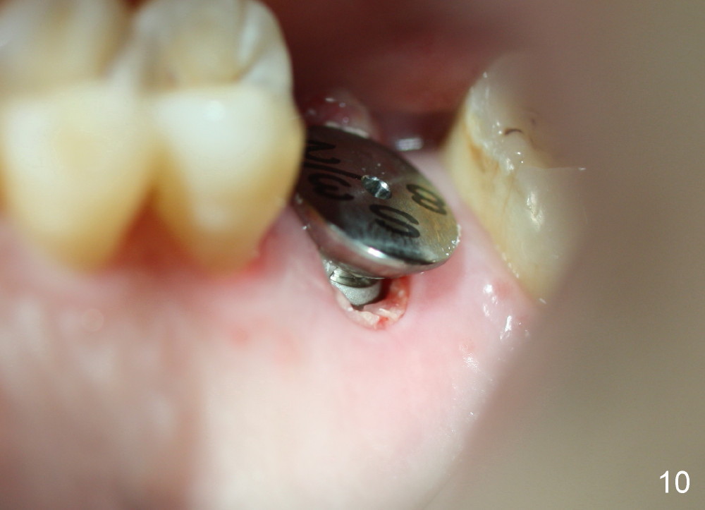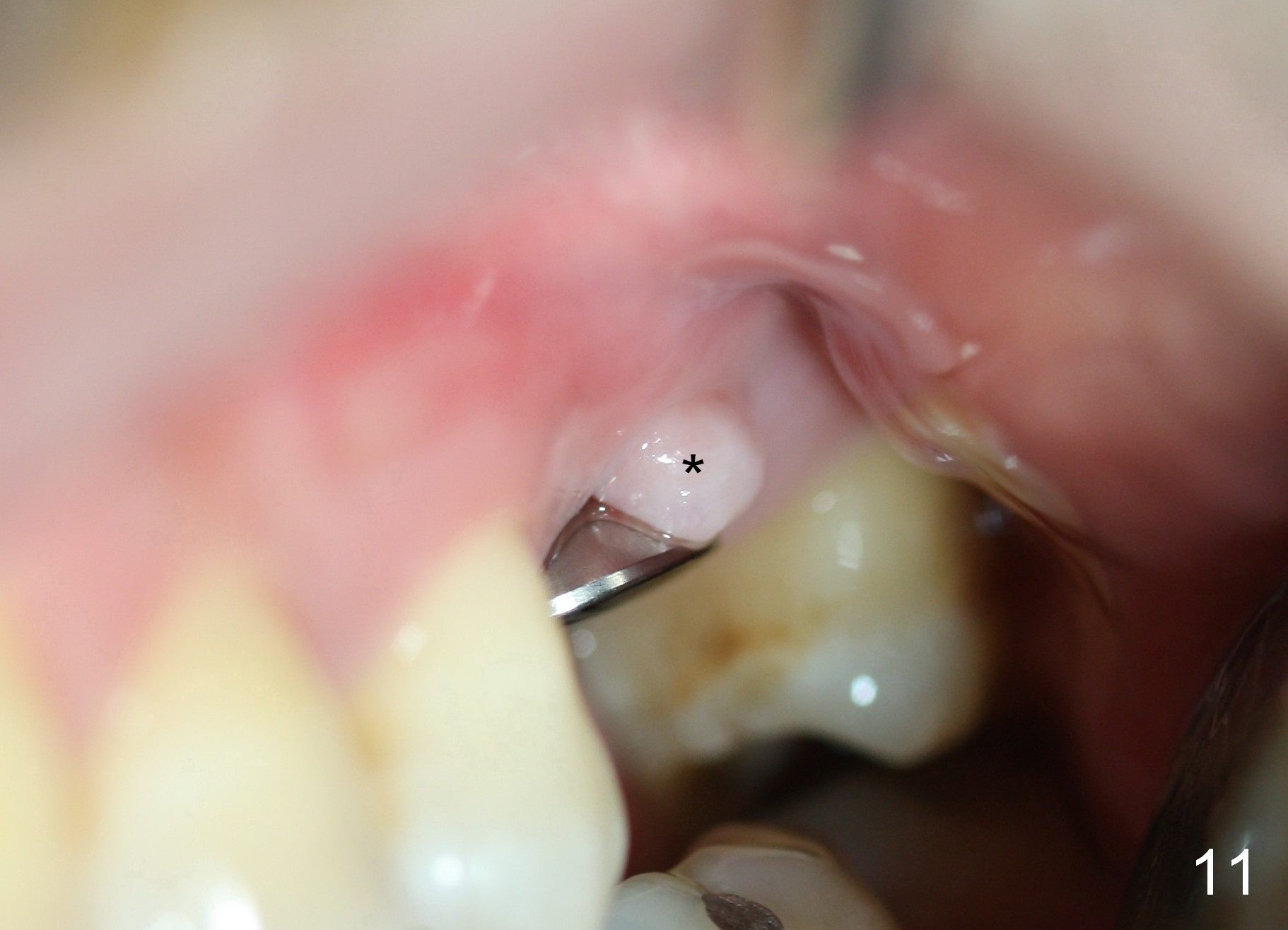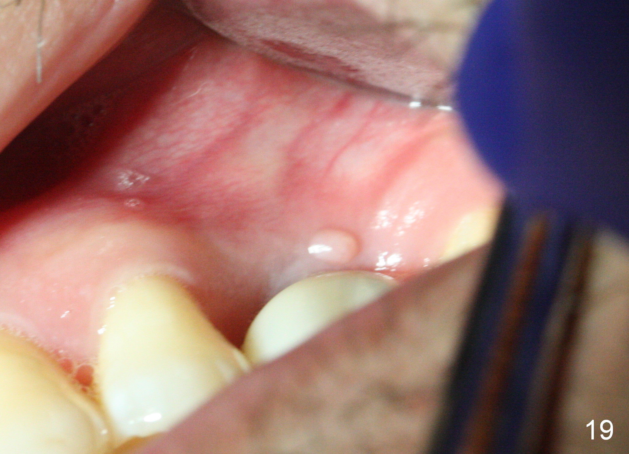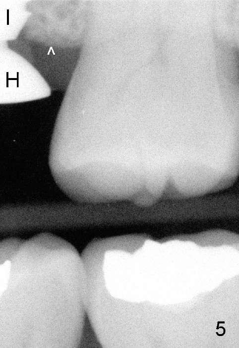 A 45-year-old man has lost the tooth #14 for a while (Fig.1); bone height is 5.4 mm. An extra wide and short implant is planned. Torus palatinus is large, suggesting that bone density should be high. A 6 mm tissue punch is chosen, but it is placed more palatal. If it were placed in the middle of the ridge, there would be no buccal keratinized gingiva (incision may avoid this issue). Additionally, the buccal portion of punch is made incomplete so that there is pedicle on the buccal side when the flap is raised (Fig.4,8: F). It is expected that the excess portion of keratinized tissue will form thick gingiva buccally. Osteotomy proves that bone is dense (Fig.2 (4.5x11 mm tap). Typical sinus lift is finished with placement of 6.4x6 mm (extra wide) bone-level implant (Fig.3, >55 Ncm). Following further torque, Fig.4 shows that the implant (I) is sub-gingival (<). Bitewings are taken to confirm that the implant plateau is at the crestal level (Fig.5,6 ^). PA shows sinus lift (Fig.7 *). The lingual aspect of the implant and healing abutment (H) is further bone grafted and covered by collagen dressing (Fig.8 *). The wound is protected with perio dressing. When the latter dislodges 7 days postop, the collagen dressing and bone graft are lost as well (Fig.10), while the buccal flap remains vital (Fig.9). The lingual exposed plateau should be able to heal normal. The collagen dressing should have been fixed in place by suture or as simple as a dental floss. There is mild nasal hemorrhage 1-2 days postop, possibly related to sinus membrane perforation and inability of Collagen Dressing to cover the perforation and contain the bone graft. When the patient returns for #9 implant placement in 3 weeks postop, the buccal flap reduces in size (Fig.11 *), while the palatal wound has healed with minimal exposure of the implant (Fig.12). Sinus graft remains in place 3 months postop (Fig.13); the buccal flap appears to have incorporated into a part of the gingiva (Fig.14). The bone density of the sinus lift appears to increase 10 days later when an abutment is placed (Fig.15 *). Although oral hygiene is pristine, there is apparent crestal bone resorption 12 months (Fig.16) and 20 months (Fig.17) post cementation, probably due to unfavorable crown/implant ratio and bruxism as well as pre-implantation bone loss (Fig.18,19). In contrast, an immediate implant in the same patient avoids pre- or post-implantation bone loss. In fact both the soft (Fig.20) and hard (Fig.21) tissues remain healthy 2 years 8 months post cementation. The sinus lift remains 3 years 8 months post cementation (Fig.22), while the crestal bone loss persists. The patients keeps complains of food impaction distal associated with bad smell 4 years 1 month post cementation. In fact the distal proximal contact is within normal limit. The bad smell is probably due to crestal bone loss (Fig.23 (pan), 24 (CT) *) and periimplantitis. Bone graft, PRF and Cytoplast membrane will be needed and fixed in place with long healing screw. When the patient returns for crown redo, he also reveals floss related gingival hemorrhage. There is pain associated with palatal sulcus probing with light gingiva erythema. Review of CT coronal section shows possible palatal (Fig.25 P) bone loss (*).