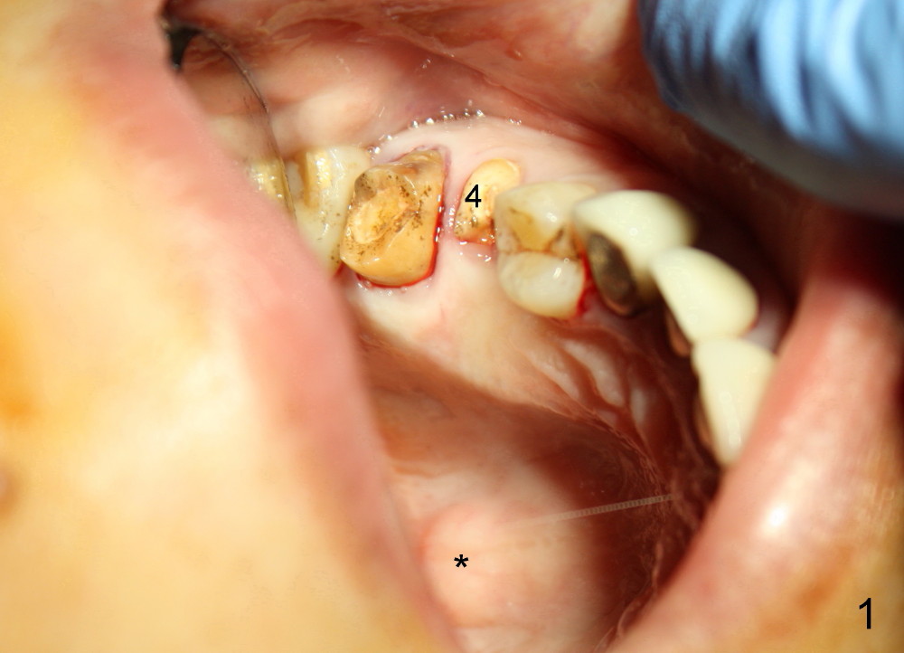 Mrs. Zhao, in her late forties, is apprehensive of dentistry. She has postponed implant placement for #4 for two months (Fig.1,2). Immediate implant is planned. Immediate provisional is provided if insertion torque is more than 45 Ncm. There are two conditions which are unfavorable to immediate provisional. First, she is probably a bruxer, as indicated by torus palatinus (Fig.1 *). Second, she bit off two crowns (joined) for #3 and 4 together.