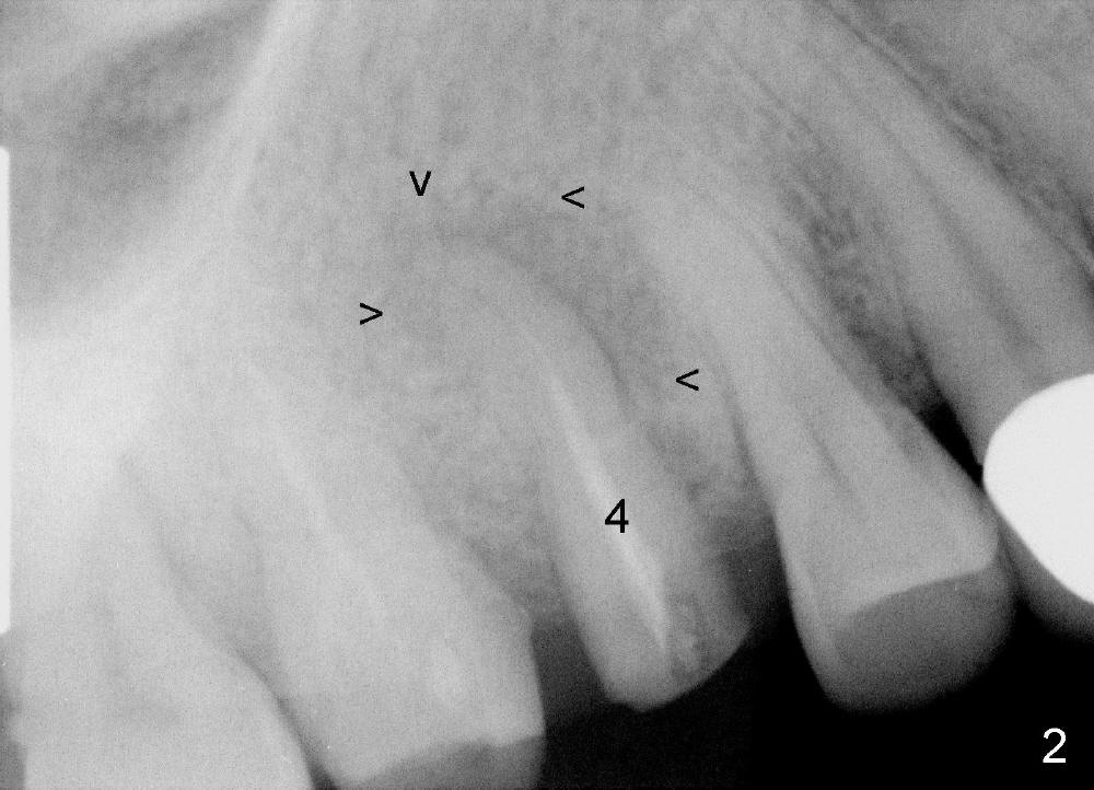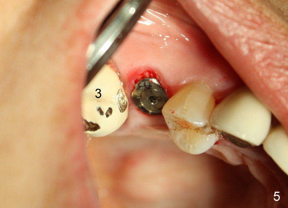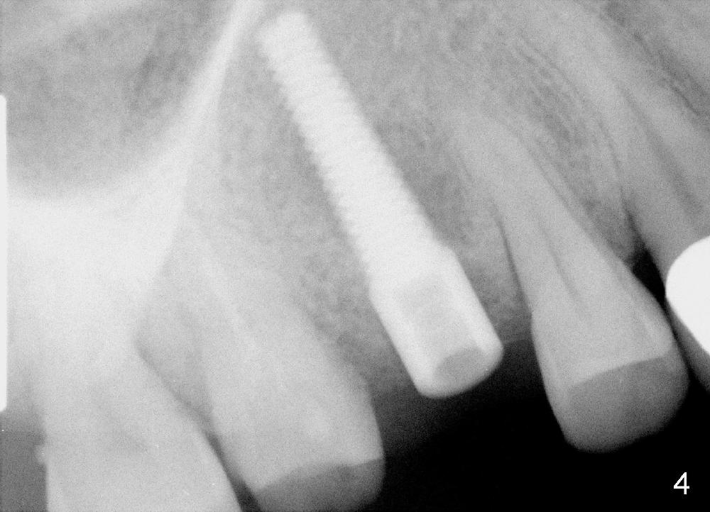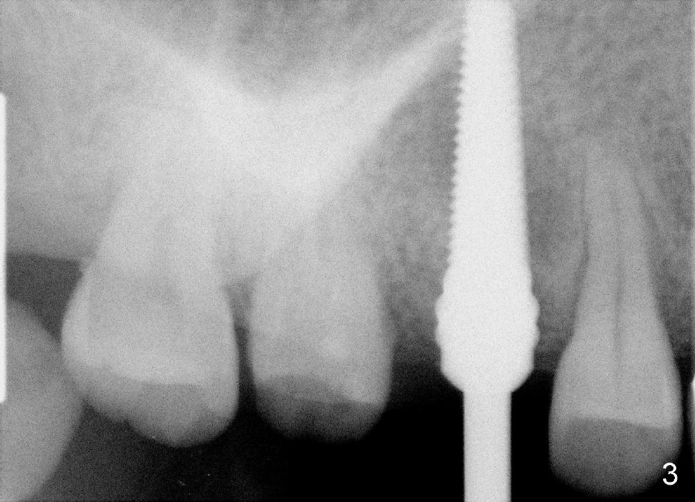 When the tooth #4 is extracted, the apical socket is found to be large with granulation tissue, which is consistent with large periapical radiolucency (Fig.2 arrowheads). The depth of the socket is 17 mm, measured from the gingival margin. The mesiodistal and buccolingual dimensions of the root are 4 and 7 mm, respectively. A tissue-level tapered implant as wide and as long as possible, 4.5x20 mm, is to be placed (Fig.3 (tap drill), 4). The insertion torque is between 35 and 40 Ncm.