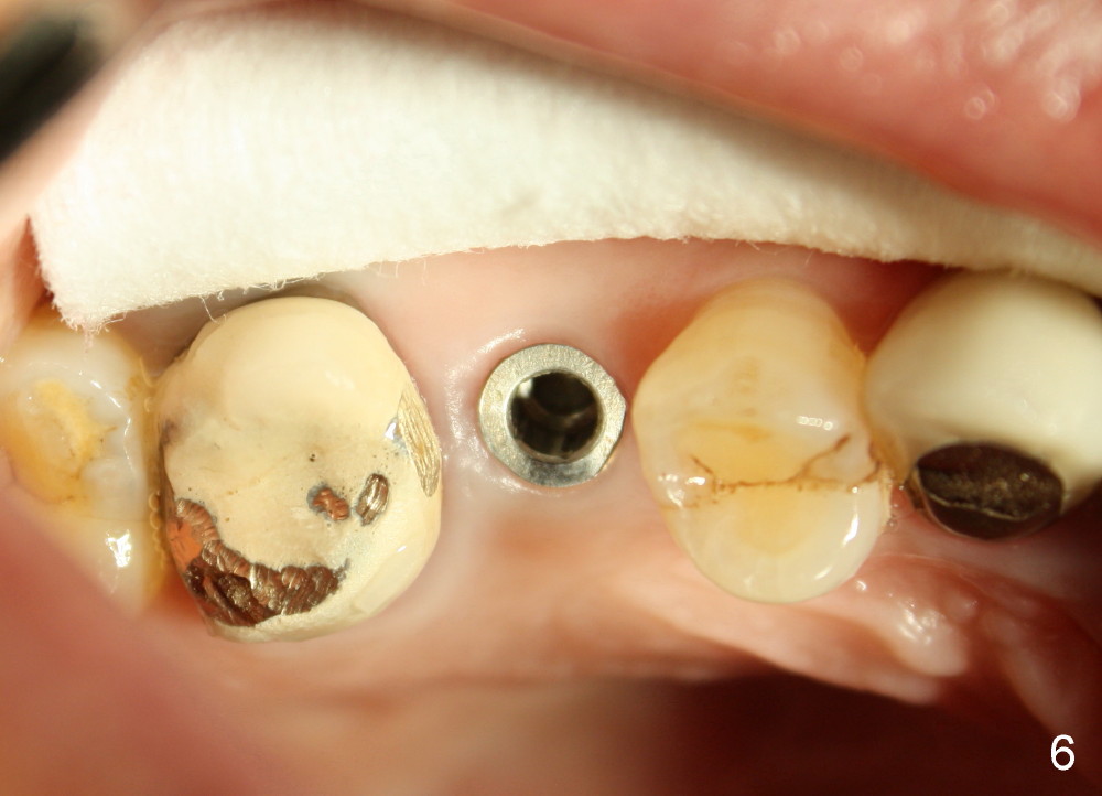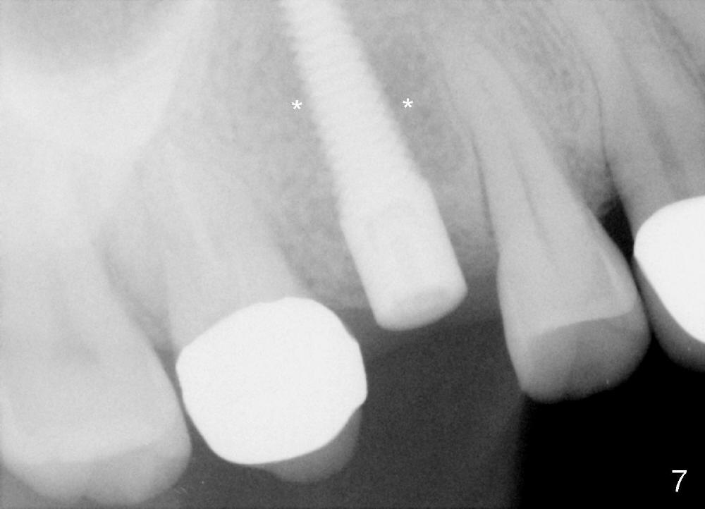 Immediate provisional is aborted due to low torque value and patient's in-cooperation (fear). A healing cuff (4.5 mm in diameter) is placed to close the buccal gap (Fig.5). The joined crowns are separated. The crown for #3 is recemented. Finally perio dressing is placed around the implant. The healing cuff is removed 6 days postop because of pressure. The patient returns for restoration 9 months postop. The gingival tissue is healthy around the implant (Fig.6). The bone density around the implant increases (Fig.7 *, compare to Fig.4).