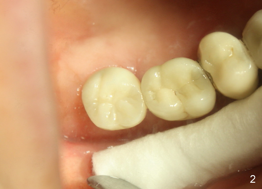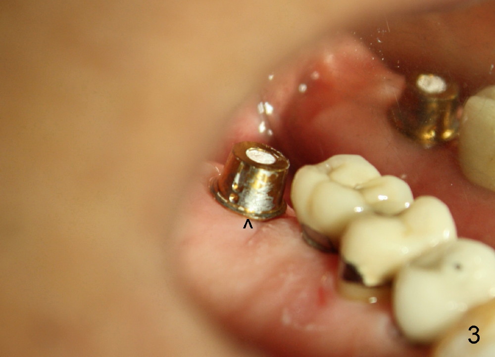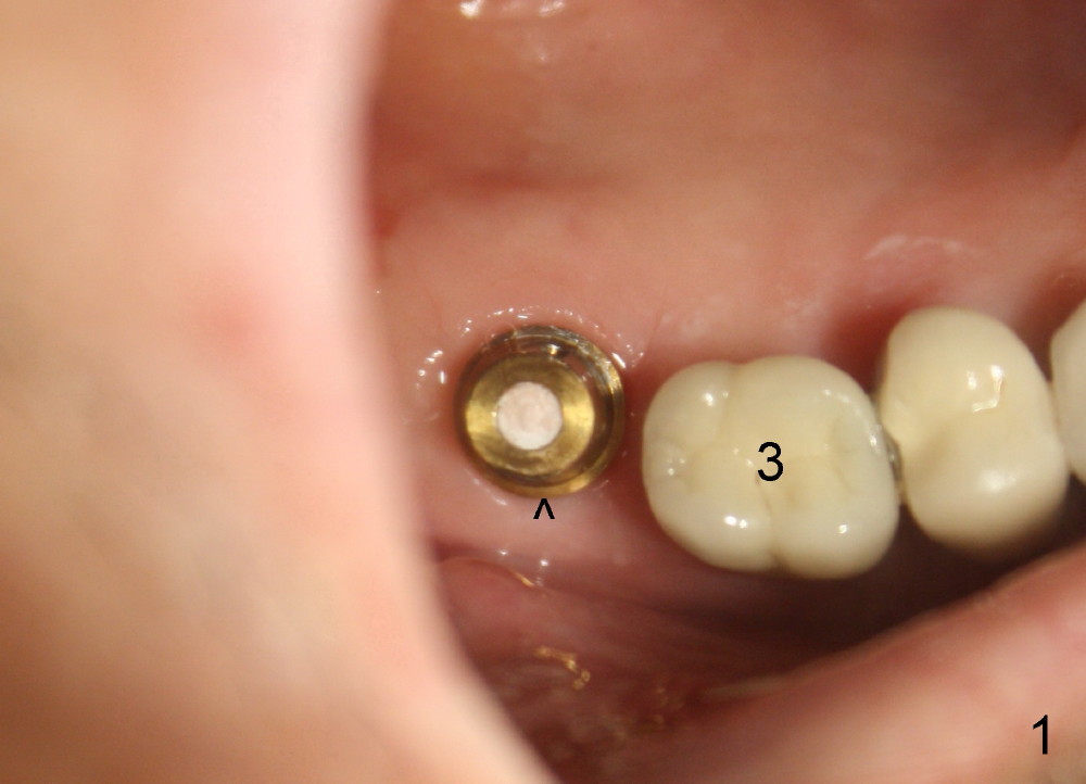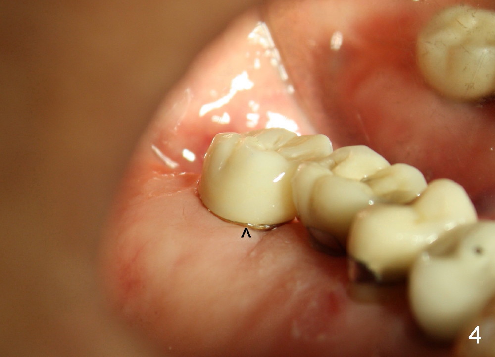 Four and a half months postop, the patient returns for crown cementation. Fig.1 (occlusal mirror view) and 3 (palatal view) show the abutment at the site of #2 after the provisional crown is removed. The margin of the abutment is supragingival (^). It remains the same when the definitive crown is seated (Fig.2,4 ^). The patient's oral hygiene is good. It appears that the prognosis of gingival health around the crown should be excellent.
