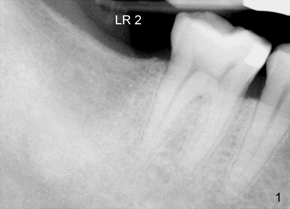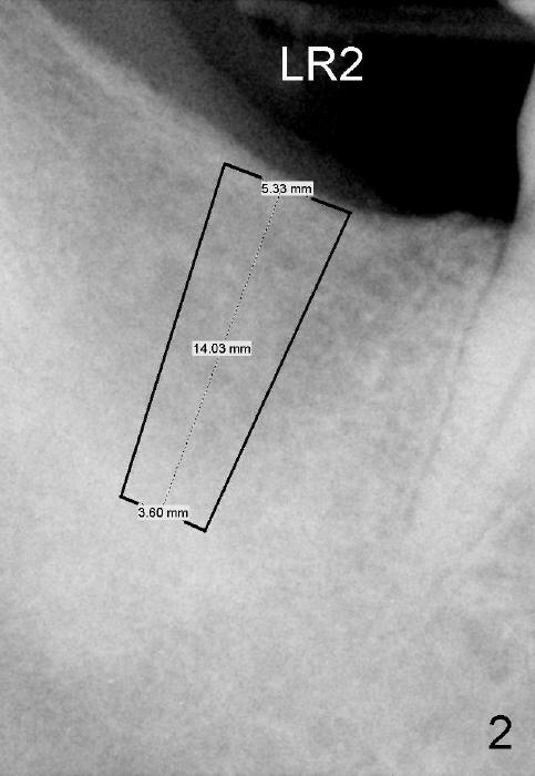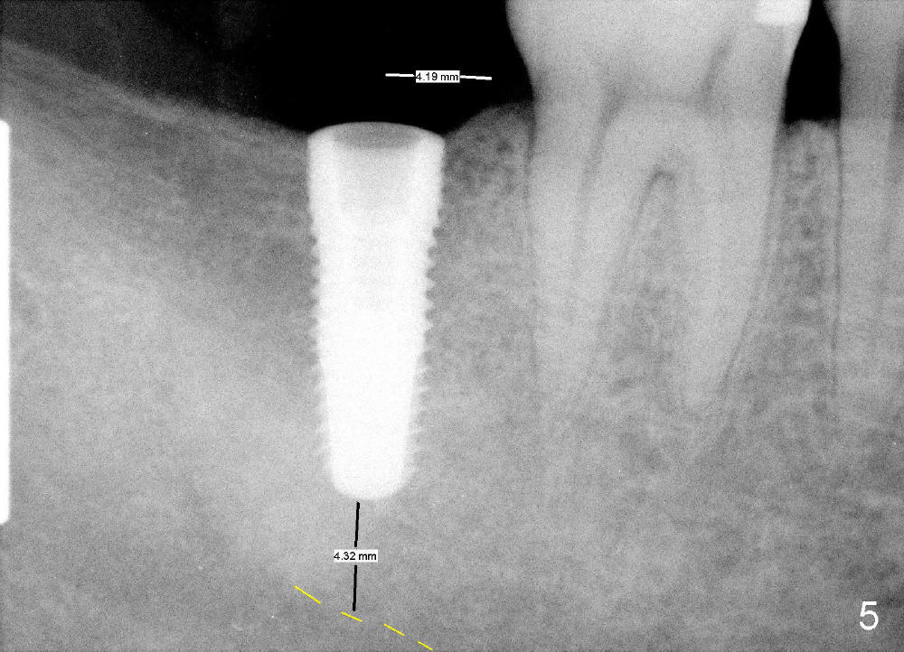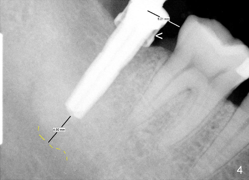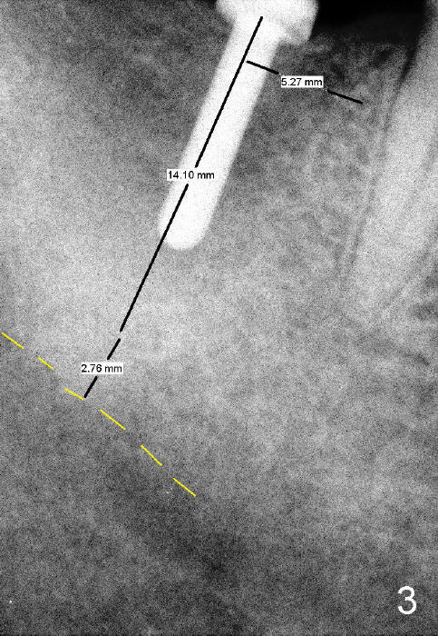 A 53-year-old man requests implant restoration for the lower right 2nd molar (Fig.1: LR2). A 5.3x14 mm submerged tapered implant is planned (Fig.2). PA is taken with a parallel pin after use of a 2 mm drill at the depth of 12 mm (Fig.3). It appears that the length of 14 mm has a safe margin (2-3 mm from the inferior alveolar nerve, yellow dashed line). In addition, the distance from the distal surface of the 1st molar is within normal limit (~5 mm).