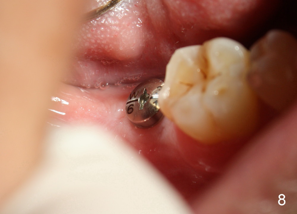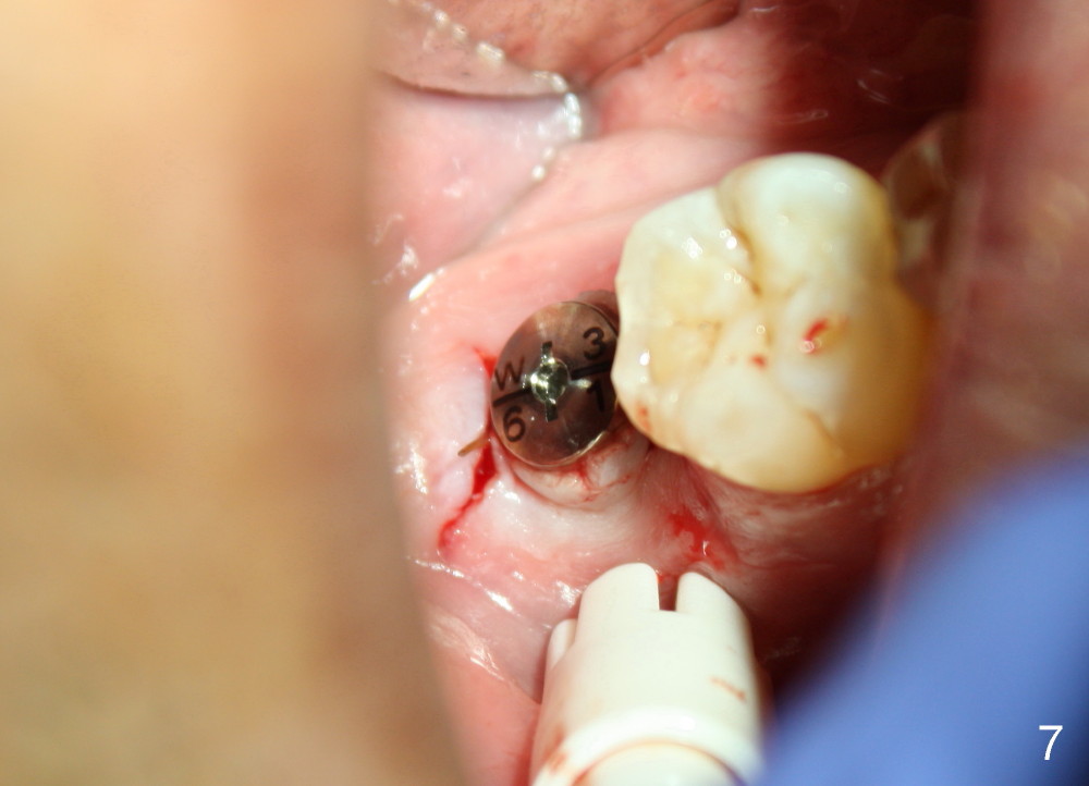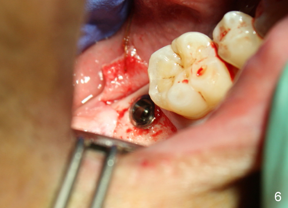 The implant is placed in the middle of the ridge buccolingually (Fig.6). A 6.2 x 3 (1) mm healing abutment is placed; the flaps tightly adapt to the abutment following suturing (Fig.7). The wound is then covered by perio dressing.